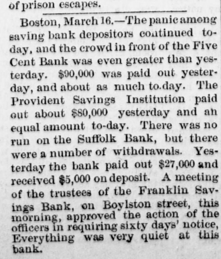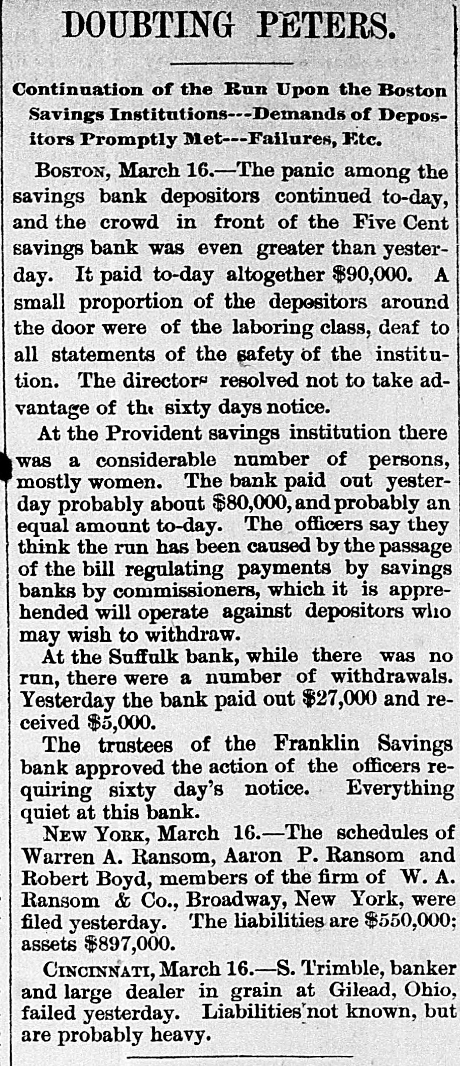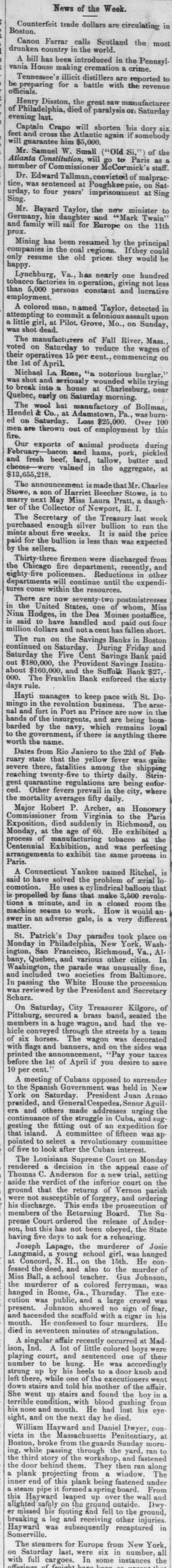 News of the Week. Boston. Counterfeit trade dollars are circulating in Canon Farrar calls Scotland the most drunken country in the world. A bill has been introduced in the Pennsyl vania House making cremation a crime. Tennessee's illicit distillers are reported to be officials. preparing for a battle with the revenue Henry Disston, the great saw manufacturer of Philadelphia, died of paralysis or Saturday evening last. Captain Crapo will shorten his dory six feet and eross the Atlantic again if somebody will guarantee him $5,000. Mr. Samuel W. Small ("Old Si,") of the Atlanta Constitution, will to Paris as member of Commissioner McCormick's staff. Dr. Edward Tallman, convicted of malpraetice, was sentenced at Poughkeepsie, on Sat urday, Sing. to four years' imprisonment at Sing Mr. Bayard Taylor, the new minister to Germany, his daughter and "Mark Twain' and family will sail for Europe on the 11th prox. Mining has been resumed by the principal companies in the coal regions. Ifthey could only resume the old prices they would be happy. Lynchburg, Va., has nearly one hundred tobacco factories in operation, giving not less than 5,000 persons constant and lucrative employment. A colored man, named Taylor, detected in attempting to commit felonious assault upon a little girl, at Pilot. Grove, Mo., on Sunday, was shot dead. The manufacturers of Fall River, Mass. voted on Saturday to reduce the wages of their operatives 15 per cent., commeneing on the 1st of April. Michael La Rose, "a notorious burglar,' was shot and seriously wounded while trying to break into a house at Charlesburg, near Quebec, early on Saturday morning. The wool hat manufactory of Bollman, Hendel & Co., at Adamstown, Pa., wasburned OR Saturday. Loss $25,000. Over 100 fire. men are thrown out of employment by this Our exports of animal products during February -bacon and hams, pork, pickled and fresh beef, lard, tallow, butter and $13,655,218. cheese-were valued in the aggregate, at The announcement is madethat Mr. Charles Stowe, a son of Harriet Beecher Stowe, is to marry next May Miss Laura Pratt, a daugh ter of the Collector of Newport, R. I. The Secretary of the Treasury last week purchased enough silver bullion to run the mints about five weeks. It is said the price paid for the bullion is less than was expected by the sellers. Thirty-three firemen were discharged from the Chicago fire department, recently, and eighty five policemen. Reductions in other departments will continue until the expenditures come within the resources. There are now seventy two postmistresses in the United States, one of whom, Miss Nina Hodges, in the Des Moines postoffice, is said to have handled and paid out four million dollars and cent has fallen short. The run on the Savings Banks in Boston continued on Saturday During Friday and Saturday the Five Cent Savings Bank paid out $180,000, the Provident Savings Institu about $160,000, and the Suffolk Bank $27, 000. The Franklin Bank enforced the sixty days rule. Hayti manages to keep pace with St. Do mingo in the revolution business. The arse nal and fort in Port au Prince are now in the hands of the insurgents, and are being bom barded by the navy, which remains loyal to the government, if there is anything there worth the name. Dates from Rio Janiero to the 22d of Feb ruary state that the yellow fever was quite severe there, fatalities among the shipping reaching twenty five to thirty daily. Strin gent quarantine regulations are being enforced. Other fevers prevail in the city, where the mortality averages fifty daily. Major Robert P. Archer, an Honorary Commissioner from Virginia to the Paris Exposition, died suddenly in Richmond, on Monday, at the age of 60. He exhibited a process of manufacturing tobacco at the Centennial Exhibition, and was perfecting arrangements to exhibit the same process in Paris. A Connecticut Yankee named Ritchel, is said to have solved the problem of serial lo comotion. He uses lindrical balloon that is propelled by fans that make 3,500 revolutions a minute, and in a closed room the machine seems to work. How it would an swer in an adverse gale, is a very different matter. St. Patrick's Day parades took place on Monday in Philadelphia, New York, Wash ington, San Francisco, Richmond, Va., Albany, Quebec, and various other cities. In Washington, the parade was unusually fine, and included two societies from Baltimore. In passing the White House the procession was reviewed by the President and Secretary Schurz. On Saturday, City Treasurer Kilgore, of Pittsburg, secured a brass band, seated the members in a huge wagon, and had the ve hicle conveyed through the streets by a team of six horses. The wagon was decorated with flags and banners, and on the sides was printed the announcement, "Pay your taxes before the 1st of April if you desire to save 10 per cent. A meeting of Cubans opposed to surrender to the Spanish Government was held in New York on Saturday. President Juan Arnao presided, and General Cespedes, Senor Aguil era and others made addresses urging the continuance of the struggle in Cuba, and sug gesting the fitting out of an expedition for that island. A committee of fifteen was ap pointed to select a revolutionary committee of five to look after the Cuban interest. The Louisiana Supreme Court on Monday rendered decision in the appeal case of Thomas C. Anderson for new trial, setting aside the verdict of the inferior court on the ground that the returns of Vernon parish were not susceptible of forgery, and ordering his discharge. This ends the prosecution of members of the Returning Board. The Su preme Court ordered the release of Ander son, but this has not been obeyed, the State having five days to ask for rehearing Joseph Lapage, the murderer of Josie Langmaid, young school girl, was hanged at Concord, N. H., on the 15th. He con fessed the deed, and also to the murder of Miss Ball, school teacher. Gus Johnson, the murderer of a colored ferryman, was hanged i