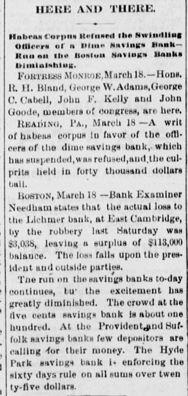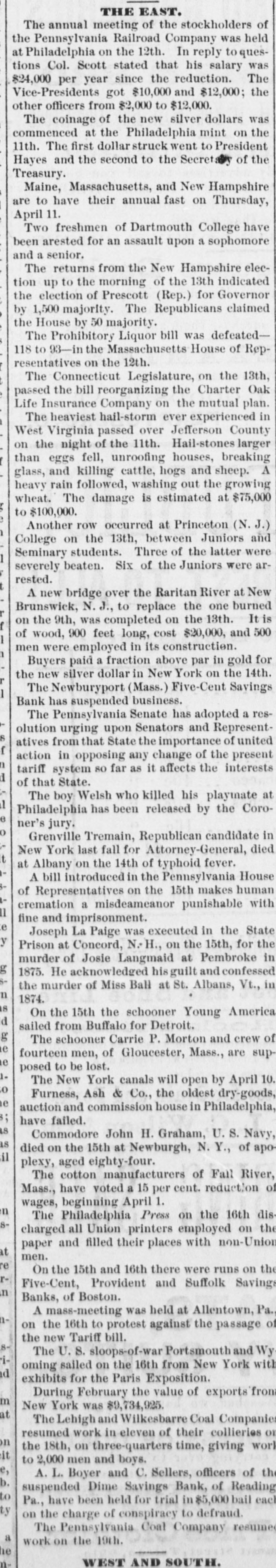 THE EAST. The annual meeting of the stockholders of the Pennsylvania Railroad Company was held at Philadelphia on the 12th. In reply to questions Col. Scott stated that his salary was $24,000 per year since the reduction. The Vice-Presidents got $10,000 and $12,000; the other officers from $2,000 to $12,000. The coinage of the new silver dollars was commenced at the Philadelphia mint on the 11th. The first dollar struck went to President Hayes and the second to the Secret of the Treasury. Maine, Massachusetts, and New Hampshire are to have their annual fast on Thursday, April 11. Two freshmen of Dartmouth College have been arested for an assault upon a sophomore and a senior. The returns from the New Hampshire election up to the morning of the 13th indicated the election of Prescott (Rep.) for Governor by 1,500 majority. The Republicans claimed the House by 50 majority. The Prohibitory Liquor bill was defeated118 to 93-in the Massachusetts House of Representatives on the 12th. The Connecticut Legislature, on the 13th, passed the bill reorganizing the Charter Oak Life Insurance Company on the mutual plan. The heaviest hail-storm ever experienced in West Virginia passed over Jefferson County on the night of the 11th. Hail-stones larger than eggs fell, unroofing houses, breaking A glass, and killing cattle, hogs and sheep. heavy rain followed, washing out the growing wheat. The damage is estimated at $75,000 to $100,000. Another row occurred at Princeton (N.J.) College on the 13th, between Juniors and Seminary students. Three of the latter were 1 severely beaten. Six of the Juniors were arrested. A new bridge over the Raritan River at New Brunswick, N. J., to replace the one burned on the 9th, was completed on the 13th. It of wood, 900 feet long, cost $20,000, and 500 I men were employed in its construction. n Buyers paid a fraction above par in gold for the new silver dollar in New York on the 14th. r The Newburyport (Mass.) Five-Cent Savings 1 Bank has suspended business. The Pennsylvania Senate has adopted a resolution urging upon Senators and RepresentS atives from that State the importance of united f action in opposing any change of the present n tariff system so far as it affects the interests d of that State. The boy Welsh who killed his playmate at 1 Philadelphia has been released by the Coroe ner's jury. o Grenville Tremain, Republican candidate in New York last fall for Attorney-General, died t at Albany on the 14th of typhoid fever. A bill introduced in the Pennsylvania House of Representatives on the 15th makes human cremation a misdeameanor punishable with II fine and imprisonment. e Joseph La Paige was executed in the State y Prison at Concord, N.H., on the 15th, for the murder of Josie Langmaid at Pembroke in g 1875. He acknowledged hisguilt and confessed the murder of Miss Ball at St. Albans, Vt., in n 1874. is On the 15th the schooner Young America d sailed from Buffalo for Detroit. g The schooner Carrie P. Morton and crew of e fourteen men, of Gloucester, Mass., are sup e posed to be lost. 1. The New York canals will open by April 10. to Furness, Ash & Co., the oldest dry-goods, e auction and commission house in Philadelphia ; have failed. is Commodore John H. Graham, U. S. Navy, as died on the 15th at Newburgh, N. Y., of apoil plexy, aged eighty-four. The cotton manufacturers of Fall River, Mass., have voted a 15 per cent. reduction of wages, beginning April 1. n The Philadelphia Press on the 16th dis8charged all Union printers employed on the paper and filled their places with non-Union at men. re On the 15th and 16th there were runs on the rFive-Cent, Provident and Suffolk Savings in Banks, of Boston. A mass-meeting was held at Allentown, Pa. non the 16th to protest against the passage of the new Tariff bill. 8The U.S. sloops-of-war Portsmouth and Wy ioming sailed on the 16th from New York with d exhibits for the Paris Exposition. During February the value of exports from m New York was $9,734,925. at The Lehigh and Wilkesbarre Coal Companies resumed work in eleven of their collieries Of n the 18th, on three-quarters time, giving work it to 2,000 men and boys. e, A.L. Boyer and C. Sellers, officers of the b. suspended Dime Savings Bank, of Reading to Pa., have been held for trial in $5,000 bail each ty on the charge of conspiracy to defraud. The Pennsylvania Coal Company resume a work on the 19th. he nWEST AND SOUTH.