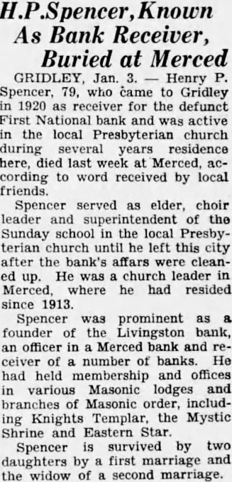 GRIDLEY, Jan. 3. Henry P. Spencer, 79, who came to Gridley in 1920 as receiver for the defunct First National bank and was active in the local Presbyterian church during several years residence here, died last week at Merced, according to word received by local friends. Spencer served as elder, choir leader and superintendent of the Sunday school in the local Presbyterian church until he left this city after the bank's affars were cleaned up. He was church leader in Merced, where he had resided since 1913. Spencer was prominent as a founder of the Livingston bank, an officer in Merced bank and receiver of a number of banks. He had held membership and offices in various Masonic lodges and branches of Masonic order, including Knights Templar, the Mystic Shrine and Eastern Star. Spencer survived by two daughters by first marriage and the widow of a second marriage.