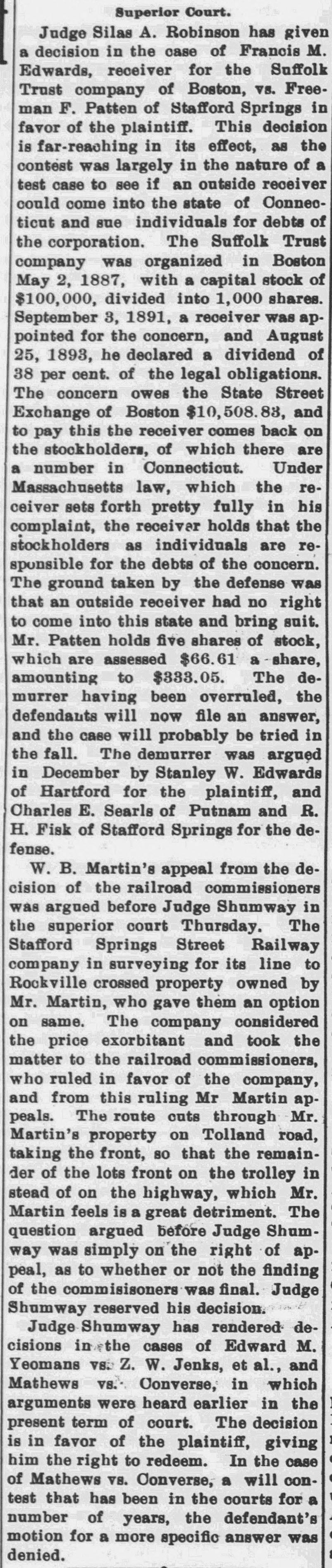 Superior Court. Judge Silas A. Robinson has given a decision in the case of Francis M. Edwards, receiver for the Suffolk Trust company of Boston, vs. Freeman F. Patten of Stafford Springs in favor of the plaintiff. This decision is far-reaching in its effect, as the contest was largely in the nature of a test case to see if an outside receiver could come into the state of Connecticut and sue individuals for debts of the corporation. The Suffolk Trust company was organized in Boston May 2, 1887, with a capital stock of $100,000, divided into 1,000 shares. September 3, 1891, a receiver was appointed for the concern, and August 25, 1893, he declared a dividend of 38 per cent. of the legal obligations. The concern owes the State Street Exchange of Boston $10,508.83, and to pay this the receiver comes back on the stockholders, of which there are a number in Connecticut. Under Massachusetts law, which the receiver sets forth pretty fully in his complaint, the receiver holds that the stockholders as individuals are responsible for the debts of the concern. The ground taken by the defense was that an outside receiver had no right to come into this state and bring suit. Mr. Patten holds five shares of stock, which are assessed $66.61 a share, amounting to $333.05. The demurrer having been overruled, the defendants will now file an answer, and the case will probably be tried in the fall. The demurrer was argued in December by Stanley W. Edwards of Hartford for the plaintiff, and Charles E. Searls of Putnam and R. H. Fisk of Stafford Springs for the defense. W. B. Martin's appeal from the decision of the railroad commissioners was argued before Judge Shumway in the superior court Thursday. The Stafford Springs Street Railway company in surveying for its line to Rockville crossed property owned by Mr. Martin, who gave them an option on same. The company considered the price exorbitant and took the matter to the railroad commissioners, who ruled in favor of the company, and from this ruling Mr Martin appeals. The route outs through Mr. Martin's property on Tolland road, taking the front, so that the remainder of the lots front on the trolley in stead of on the highway, which Mr. Martin feels is a great detriment. The question argued before Judge Shumway was simply on the right of appeal, as to whether or not the finding of the commisisoners was final. Judge Shumway reserved his decision. Judge Shumway has rendered decisions in the cases of Edward M. Yeomans vs. Z. W. Jenks, et al., and Mathews vs. Converse, in which arguments were heard earlier in the present term of court. The decision is in favor of the plaintiff, giving him the right to redeem. In the case of Mathews vs. Converse, a will contest that has been in the courts for a number of years, the defendant's motion for a more specific answer was denied.