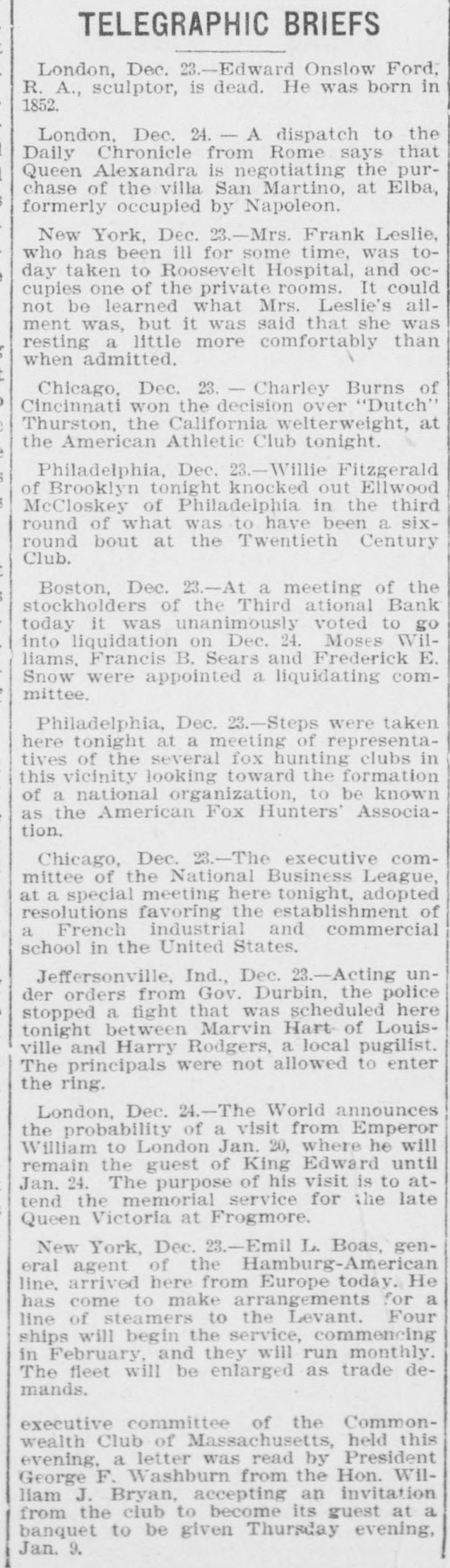 TELEGRAPHIC BRIEFS London, Dec. 23.-Edward Onslow Ford, R. A., sculptor, is dead. He was born in 1852. London, Dec. 24. - A dispatch to the Daily Chronicle from Rome says that Queen Alexandra is negotiating the purchase of the villa San Martino, at Elba, formerly occupied by Napoleon. New York, Dec. 23.-Mrs. Frank Leslie, who has been ill for some time, was today taken to Roosevelt Hospital, and occupies one of the private rooms. It could not be learned what Mrs. Leslie's allment was, but it was said that she was resting a little more comfortably than when admitted. Chicago, Dec. 23. - Charley Burns of Cincinnati won the decision over "Dutch" Thurston, the California welterweight, at the American Athletic Club tonight. Philadelphia, Dec. 23.-Willie Fitzgerald of Brooklyn tonight knocked out Ellwood McCloskey of Philadelphia in the third round of what was to have been a sixround bout at the Twentieth Century Club. Boston, Dec. 23.-At a meeting of the stockholders of the Third ational Bank today it was unanimously voted to go into liquidation on Dec. 24. Moses Williams. Francis B. Sears and Frederick E. Snow were appointed a liquidating committee. Philadelphia, Dec. 23.-Steps were taken here tonight at a meeting of representatives of the several fox hunting clubs in this vicinity looking toward the formation of a national organization, to be known as the American Fox Hunters' Association. Chicago, Dec. 23.-The executive committee of the National Business League, at a special meeting here tonight, adopted resolutions favoring the establishment of a French industrial and commercial school in the United States. Jeffersonville, Ind., Dec. 23.-Acting under orders from Gov. Durbin, the police stopped a fight that was scheduled here tonight between Marvin Hart of Louisville and Harry Rodgers, a local pugilist. The principals were not allowed to enter the ring. London, Dec. 24.-The World announces the probability of a visit from Emperor William to London Jan. 20, where he will remain the guest of King Edward until Jan. 24. The purpose of his visit is to attend the memorial service for the late Queen Victoria at Frogmore. New York, Dec. 23.-Emil L. Boas, general agent of the Hamburg-American line. arrived here from Europe today. He has come to make arrangements for a line of steamers to the Levant. Four ships will begin the service, commencing in February, and they will run monthly. The fleet will be enlarged as trade demands. executive committee of the Commonwealth Club of Massachusetts, held this evening, a letter was read by President George F. Washburn from the Hon. William J. Bryan, accepting an invitation from the club to become its guest at a banquet to be given Thursday evening, Jan. 9.