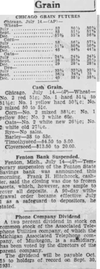 Grain Cash Grain. hard No. yellow hard No. 2 mixed 50 to mixed No. white yellow white new No white old to 53c. to 5.00 to 20.00 Fenton Bank Suspended. suspension of the Fenton State porary bank was announced this Savings Frank ier, morning said the closing was due to frozen however, are ample all deposits 90-day withcover drawal order became effective July safeguard to depositors, stated. Phone Company Dividend A two in stock on stock of the Associated Telephone Utilities company. of which the Michigan Associated has voted by the of the company. parent The dividend will be payable Oct 15 to holders of record on Sept. 30, CHICAGO GRAIN FUTURES