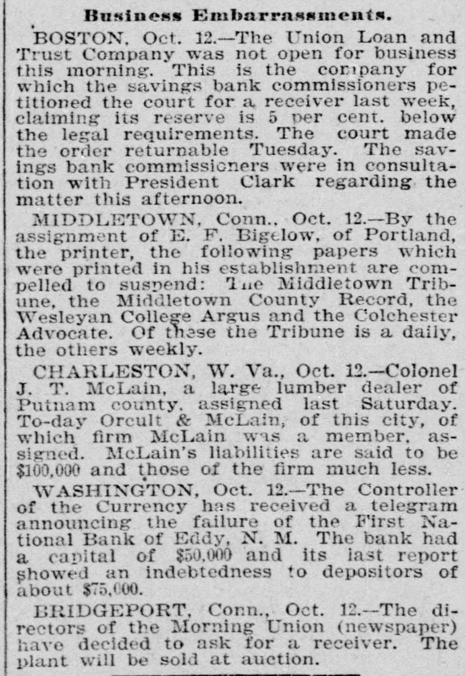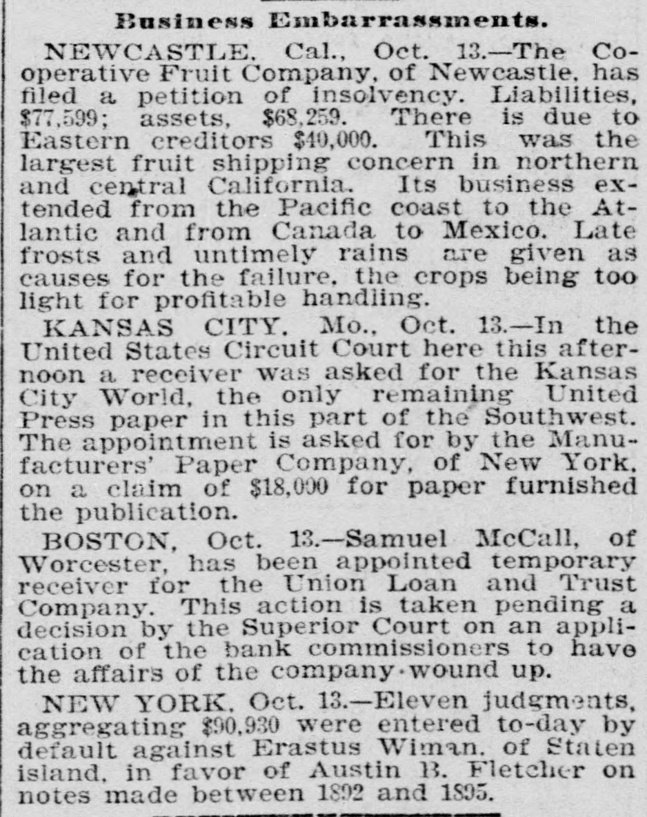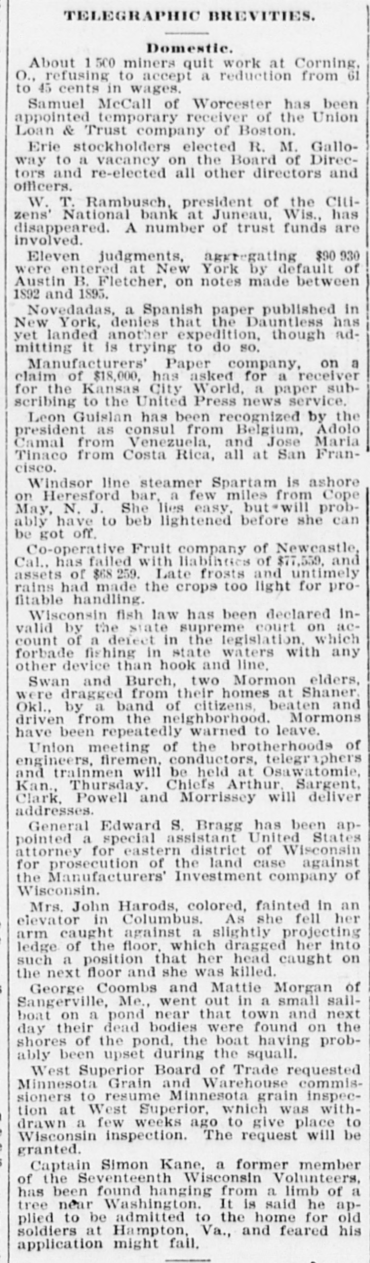 THE NEWS. The annual convention of the Commercial Travelers' Home Association met in Binghamton, N. Y No business of a pu'l lie nature was transacted.--The Clincinn ti, Lebanon and Northern Railway. recent purchased by the Pennsylvania Company, re-elected the old directors, except Ra ph Peters, whose place was filled --Eleven judgments, aggregating $90,930, were entered in New York by default against Erastus Wiman, of Staten Island, in favor of Austin B: Flecther on notes made between 1892 and 1895.-The directors of the Central Railroad met in annual session; in Savannah, Ga. The stockholders' annual meet ng was to have been held and a large number of them came into the city, but it was decided to postpone it until November 10. The direotors met behind closed doors. Barnes & Ladow, sash and bllud manufacturers, of Mechanicville, N. Y., are financially embarrassed as a result of the general depression. Figures are not giver. The firm have done a business of $200,000 a year. -F. W. Benham has been appointed receiver for Wilcox & Howe, of Derby, Conn., manufacturers of bicycle forgings. The liabilities of the concern are $43,000; assets, $149,000. The cause of the failure is said tc be the failur 8 of many bicycle concerns which owed the firm.--Application has been made for a receiver for the Union Loan and Trust Company, of Boston, a concern with a capital stock of $100,000 and liabilities of $363,844. The institution is expected to be able to increase its reserve and con tinue in business.- William Matuar, a fore. man, employed by the Brooklyn Gas Com. pany, of New York, wãa assassinated by Rocco Muralotto, a laborer, whom he has discharged. Muralotto fired upon his vic tim at close range with both barrels of & fowling-piece, and killed him instantly. The assassin was arrested. munificent addition to the Yale College library has been announced in the shape of a gift, by J. M. Sears, of the class of '77, now of Boston. The gift consists of 7000 volumes, which constituted the library of Ernest Curteuis, recently sold in Germany. In the collection there are 3,500 bound volumes and 3,500 unbound volumes, largely made up of pamphlets and digsertations.-Lester H. Thurber, of Nashua, N. H., has been ap. pointed assignee of the Security Trust Com. pany, of Nashua, upon petition of the State Bank Commissioners, and the company has been enjoined from doing business in New Hampshire. Mr. Thurber will be required to furnish bonds for $60,000.-Mrs Dora Rosenstadt, aged forty-seven, tried to fill 8 gasoline stove at the home of her son-in-law Jacob Rosenberg, Baltimore, Md., whi e the wicks were burning, when the oil became ignited, and exploded. Mrs. Rosenstadt and the infant daughter of Rosenberg were iatally, and Rosenberg and his wife seriously burned.