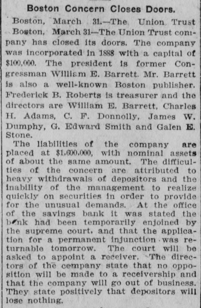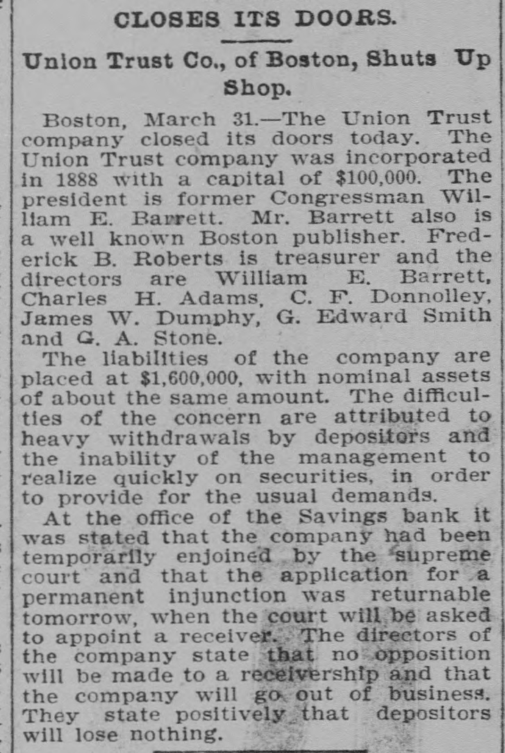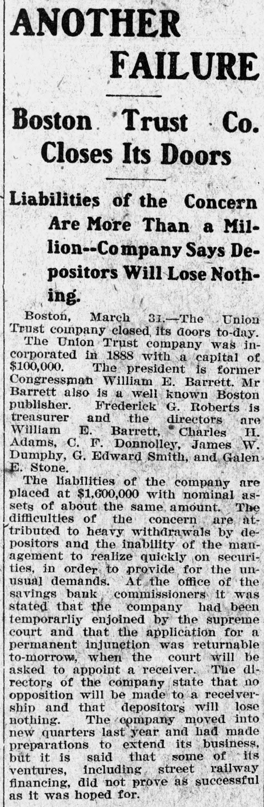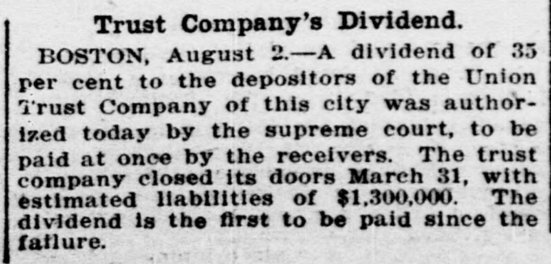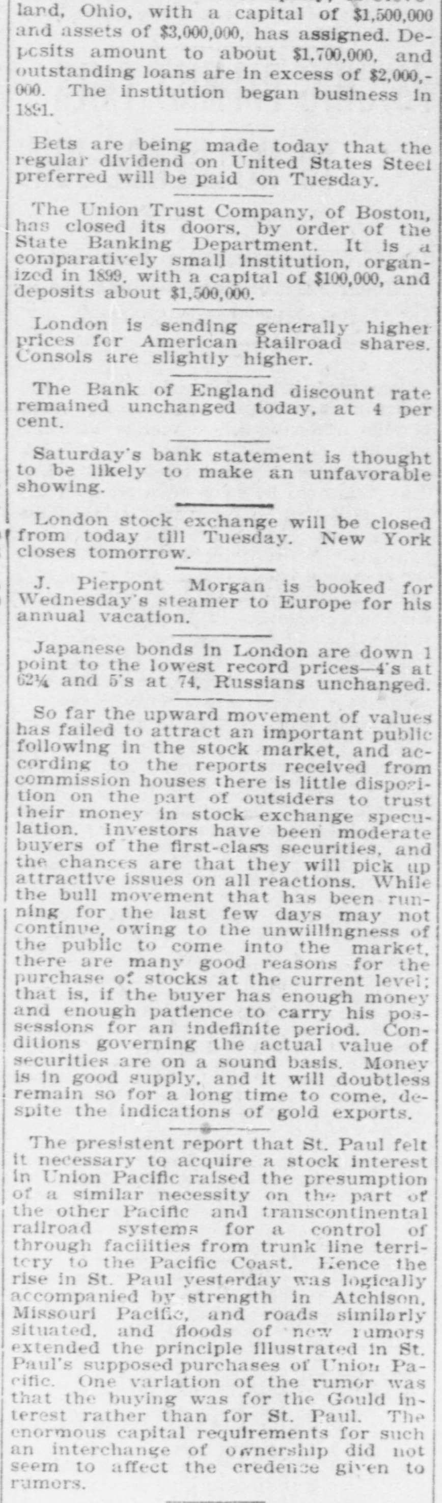 land, Ohio, with a capital of $1,500,000 and assets of $3,000,000, has assigned. Deposits amount to about $1,700,000. and outstanding loans are in excess of $2,000,000. The institution began business in 1891. Bets are being made today that the regular dividend on United States Steel preferred will be paid on Tuesday. The Union Trust Company, of Boston, has closed its doors, by order of the State Banking Department. It is a comparatively small institution, organized in 1899. with a capital of $100,000, and deposits about $1,500,000. London is sending generally higher prices for American Railroad shares. Consols are slightly higher. The Bank of England discount rate remained unchanged today, at 4 per cent. Saturday's bank statement is thought to be likely to make an unfavorable showing. London stock exchange will be closed from today till Tuesday. New York closes tomorrow. J. Pierpont Morgan is booked for Wednesday's steamer to Europe for his annual vacation. Japanese bonds in London are down 1 point to the lowest record prices-4's at 621/4 and 5's at 74, Russians unchanged. So far the upward movement of values has failed to attract an important public following in the stock market, and according to the reports received from commission houses there is little disposition on the part of outsiders to trust their money in stock exchange speculation. Investors have been moderate buyers of the first-class securities, and the chances are that they will pick up attractive issues on all reactions. While the bull movement that has been running for the last few days may not continue, owing to the unwillingness of the public to come into the market, there are many good reasons for the purchase of stocks at the current level; that is, if the buyer has enough money and enough patience to carry his possessions for an indefinite period. Conditions governing the actual value of securities are on a sound basis. Money is in good supply. and it will doubtless remain SO for a long time to come, despite the indications of gold exports. The presistent report that St. Paul felt it necessary to acquire a stock interest in Union Pacific raised the presumption of a similar necessity on the part of the other Pacific and transcontinental railroad systems for a control of through facilities from trunk line territory to the Pacific Coast. Hence the rise in St. Paul yesterday was logically accompanied by strength in Atchison, Missouri Pacific, and roads similarly situated, and floods of now rumors extended the principle illustrated in St. Paul's supposed purchases of Union Pacific. One variation of the rumor was that the buying was for the Gould interest rather than for St. Paul. The enormous capital requirements for such an interchange of ownership did not seem to affect the credence given to rumors.