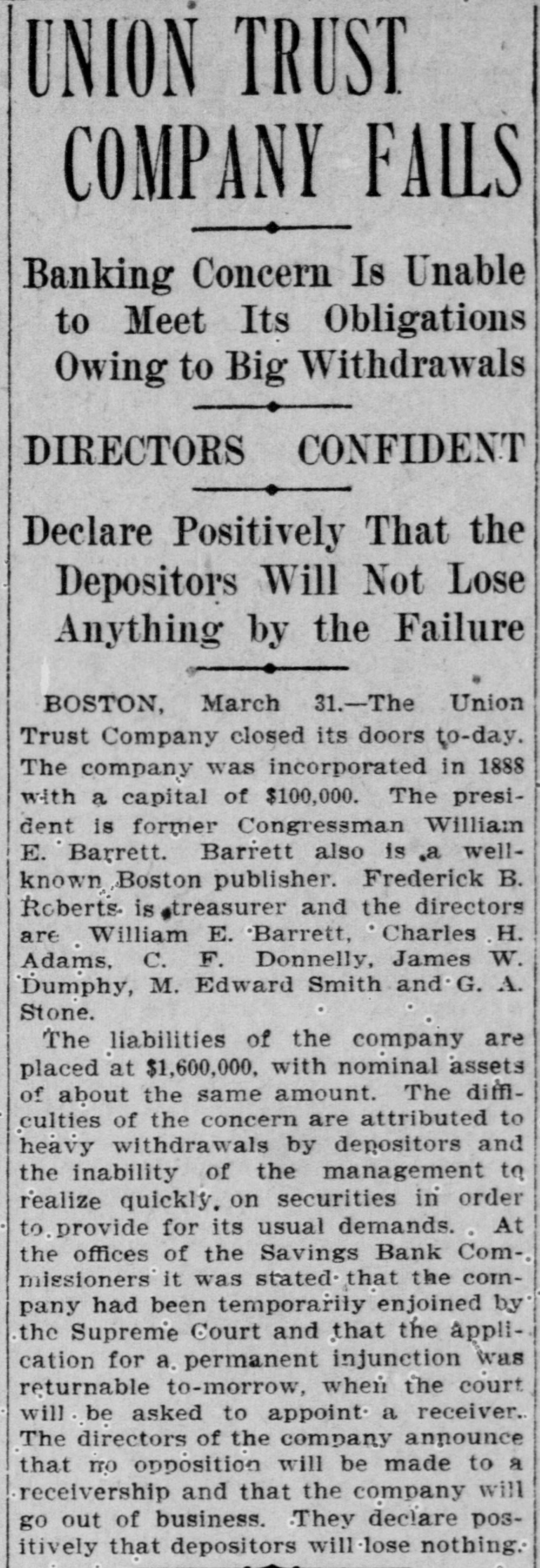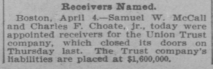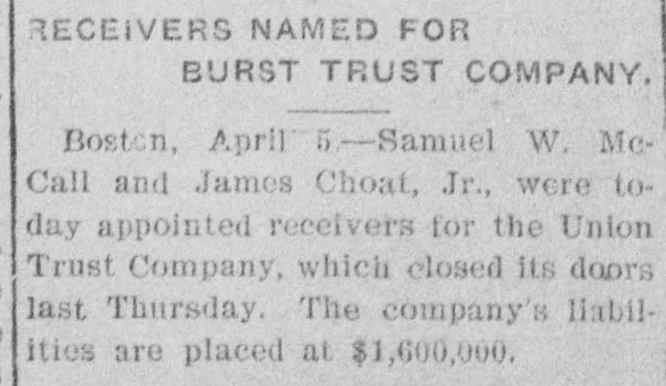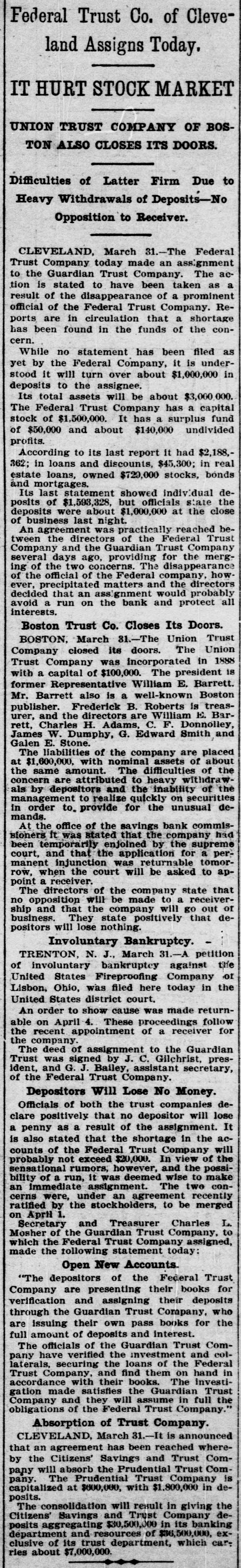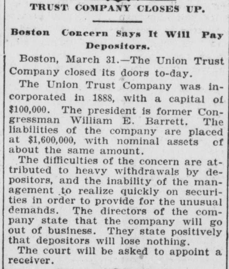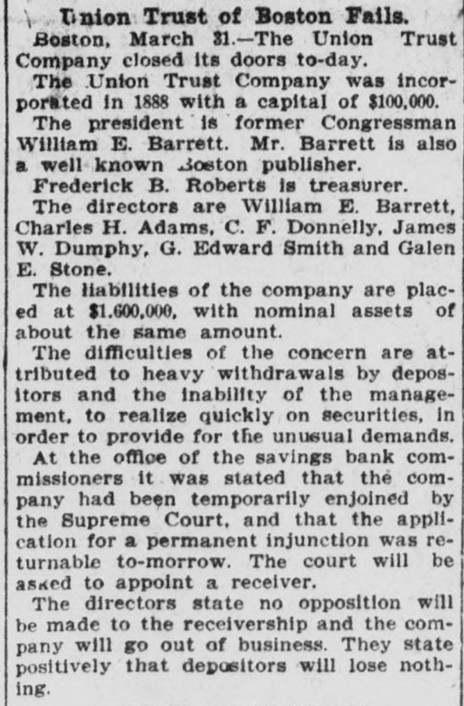 land, Ohio, with a capital of $1,500,000 and assets of $3,000,000, has assigned. Deposits amount to about $1,700,000. and outstanding loans are in excess of $2,000,000. The institution began business in 1891. Bets are being made today that the regular dividend on United States Steel preferred will be paid on Tuesday. The Union Trust Company, of Boston, has closed its doors, by order of the State Banking Department. It is a comparatively small institution, organized in 1899. with a capital of $100,000, and deposits about $1,500,000. London is sending generally higher prices for American Railroad shares. Consols are slightly higher. The Bank of England discount rate remained unchanged today, at 4 per cent. Saturday's bank statement is thought to be likely to make an unfavorable showing. London stock exchange will be closed from today till Tuesday. New York closes tomorrow. J. Pierpont Morgan is booked for Wednesday's steamer to Europe for his annual vacation. Japanese bonds in London are down 1 point to the lowest record prices-4's at 621/4 and 5's at 74, Russians unchanged. So far the upward movement of values has failed to attract an important public following in the stock market, and according to the reports received from commission houses there is little disposition on the part of outsiders to trust their money in stock exchange speculation. Investors have been moderate buyers of the first-class securities, and the chances are that they will pick up attractive issues on all reactions. While the bull movement that has been running for the last few days may not continue, owing to the unwillingness of the public to come into the market, there are many good reasons for the purchase of stocks at the current level; that is, if the buyer has enough money and enough patience to carry his possessions for an indefinite period. Conditions governing the actual value of securities are on a sound basis. Money is in good supply. and it will doubtless remain SO for a long time to come, despite the indications of gold exports. The presistent report that St. Paul felt it necessary to acquire a stock interest in Union Pacific raised the presumption of a similar necessity on the part of the other Pacific and transcontinental railroad systems for a control of through facilities from trunk line territory to the Pacific Coast. Hence the rise in St. Paul yesterday was logically accompanied by strength in Atchison, Missouri Pacific, and roads similarly situated, and floods of now rumors extended the principle illustrated in St. Paul's supposed purchases of Union Pacific. One variation of the rumor was that the buying was for the Gould interest rather than for St. Paul. The enormous capital requirements for such an interchange of ownership did not seem to affect the credence given to rumors.