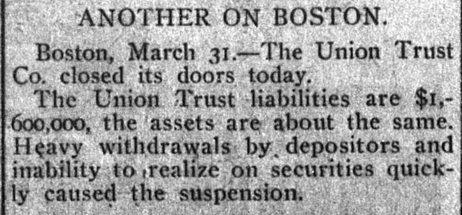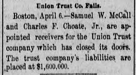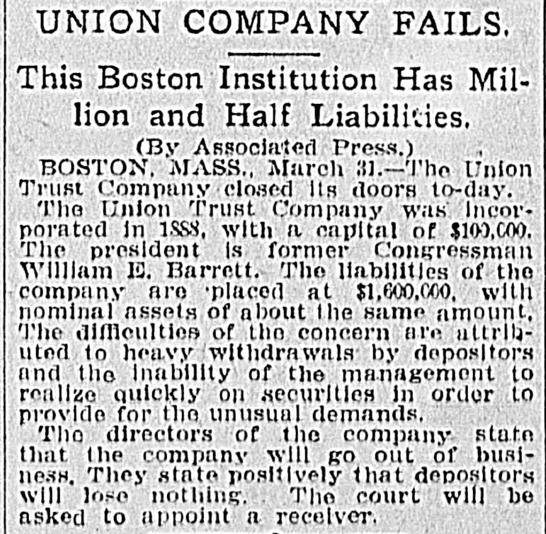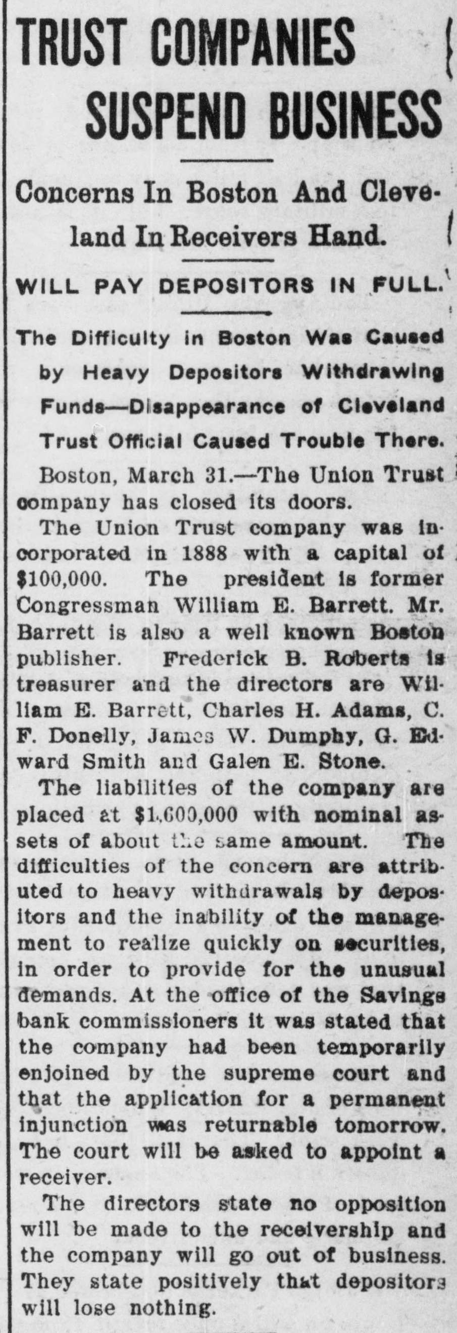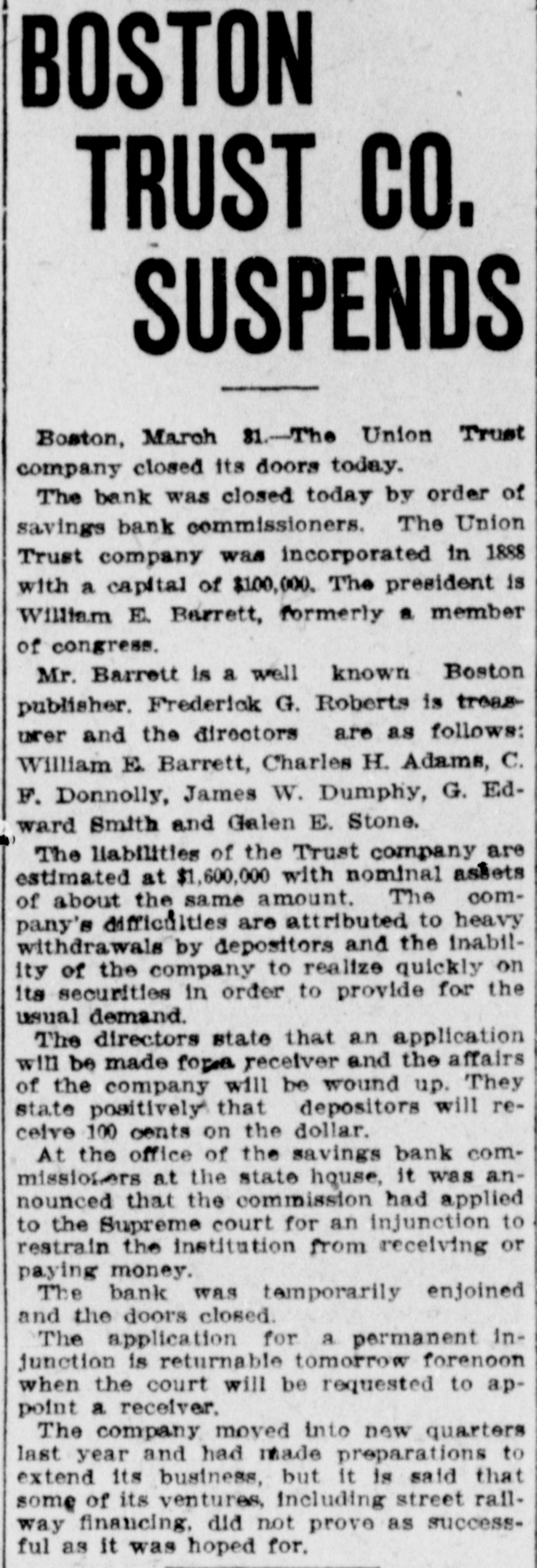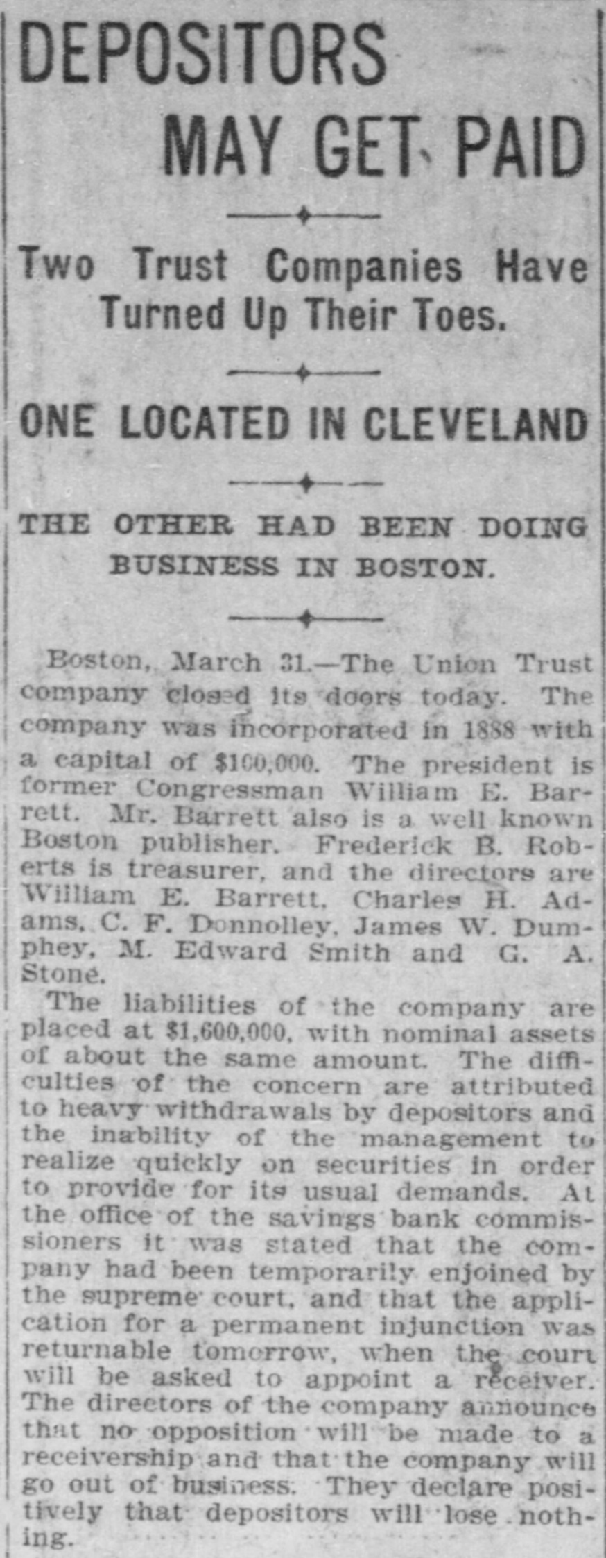 land, Ohio, with a capital of $1,500,000 and assets of $3,000,000, has assigned. Deposits amount to about $1,700,000. and outstanding loans are in excess of $2,000,000. The institution began business in 1891. Bets are being made today that the regular dividend on United States Steel preferred will be paid on Tuesday. The Union Trust Company, of Boston, has closed its doors, by order of the State Banking Department. It is a comparatively small institution, organized in 1899. with a capital of $100,000, and deposits about $1,500,000. London is sending generally higher prices for American Railroad shares. Consols are slightly higher. The Bank of England discount rate remained unchanged today, at 4 per cent. Saturday's bank statement is thought to be likely to make an unfavorable showing. London stock exchange will be closed from today till Tuesday. New York closes tomorrow. J. Pierpont Morgan is booked for Wednesday's steamer to Europe for his annual vacation. Japanese bonds in London are down 1 point to the lowest record prices-4's at 621/4 and 5's at 74, Russians unchanged. So far the upward movement of values has failed to attract an important public following in the stock market, and according to the reports received from commission houses there is little disposition on the part of outsiders to trust their money in stock exchange speculation. Investors have been moderate buyers of the first-class securities, and the chances are that they will pick up attractive issues on all reactions. While the bull movement that has been running for the last few days may not continue, owing to the unwillingness of the public to come into the market, there are many good reasons for the purchase of stocks at the current level; that is, if the buyer has enough money and enough patience to carry his possessions for an indefinite period. Conditions governing the actual value of securities are on a sound basis. Money is in good supply. and it will doubtless remain SO for a long time to come, despite the indications of gold exports. The presistent report that St. Paul felt it necessary to acquire a stock interest in Union Pacific raised the presumption of a similar necessity on the part of the other Pacific and transcontinental railroad systems for a control of through facilities from trunk line territory to the Pacific Coast. Hence the rise in St. Paul yesterday was logically accompanied by strength in Atchison, Missouri Pacific, and roads similarly situated, and floods of now rumors extended the principle illustrated in St. Paul's supposed purchases of Union Pacific. One variation of the rumor was that the buying was for the Gould interest rather than for St. Paul. The enormous capital requirements for such an interchange of ownership did not seem to affect the credence given to rumors.