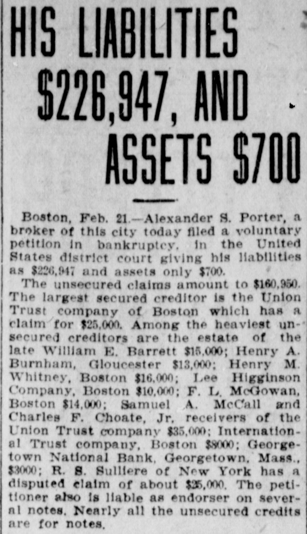 HIS LIABILITIES $226,947 AND ASSETS $700 Boston, Feb. 21.-Alexander S. Porter, a broker of this city today filed a voluntary petition in bankruptcy, in the United States district court giving his liabilities as $226,947 and assets only $700. The unsecured claims amount to $160,950. The largest secured creditor is the Union Trust company of Boston which has a claim for $25,000. Among the heaviest unsecured creditors are the estate of the late William E. Barrett $15,000; Henry A. Burnham, Gloucester $13,000; Henry M. Whitney, Boston $16,000; Lee Higginson Company, Boston $10,000; F. L. McGowan, Boston $14,000; Samuel A. McCall and Charles F. Choate, Jr. receivers of the Union Trust company $35,000; International Trust company, Boston $8000; Georgetown National Bank, Georgetown, Mass., $3000; R. S. Sulliere of New York has a disputed claim of about $25,000. The petitioner also is liable as endorser on several notes. Nearly all the unsecured credits are for notes,