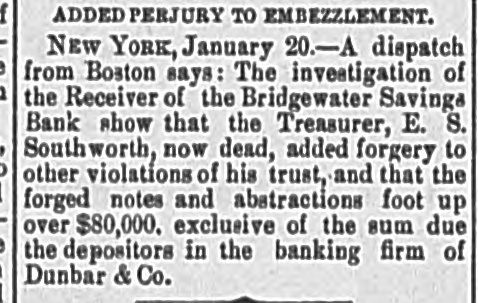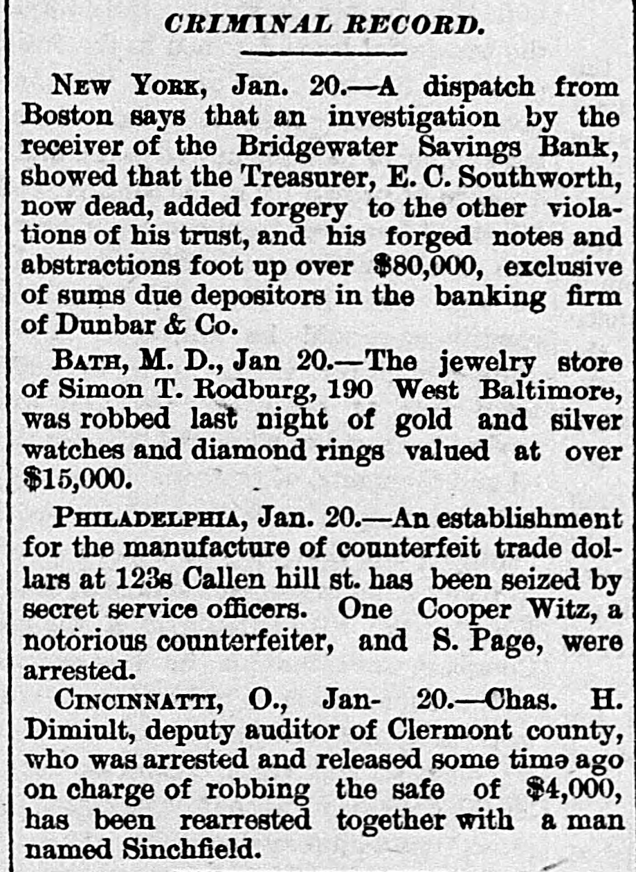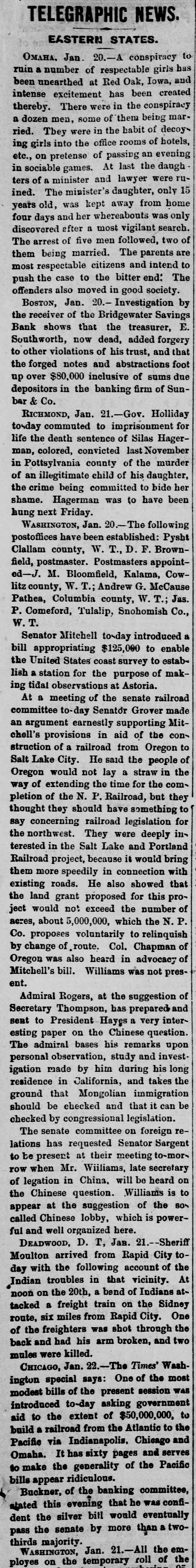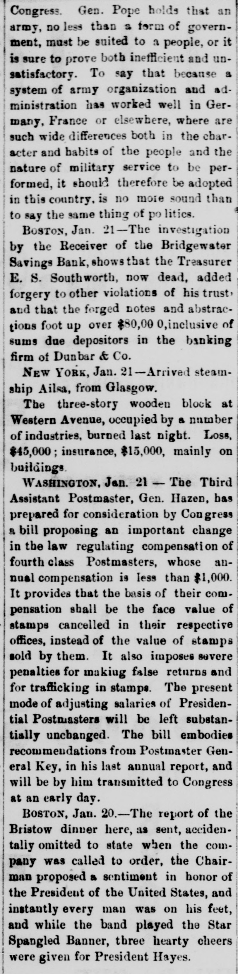 MINOR TELEGRAMS A flood is reported in the Susquehanna river at Pittston, Pa. The northwesterly gale in New York continues. The weather is clear and freezing, Chester Pike has been appointed revenue gauger for the first district of New Hampshire. House, barn and outbuildings of Chester M. Carleton in Haverhill, were burned Tuesday. Loss $3000. The Pittston, Pennsylvania, Coal Company, employing about 2500 men, is now running nearly full time. Solon Wooley of Grafton, Vt., has been found guilty of the murder of his brother Frank, in October last. Several hundred negroes made a riotous demonstration in Algiers, a suburb of New Orleans, Tuesday evening, but the disturbance was soon quelled. The Order of Hibernians are in session in New York, devising some plan to settle their difficulties with the Catholic church. James E. Burhaus, ticket agent at Pine Plains for the Poughkeepsie, Hartford & Boston railroad, has been missing since Jan. 6th. His accounts are all correct. Assistant Secretary of the Treasury Conant is to be succeeded by ex-Gov. McCormack of Arizona. Mr. Conant becomes chief agent of the Syndicate in London. W. P. Robinson, general freight agent of the Missouri, Kansas and Texas railroad, denies the rumor that the Chicago, Burlington and Quincy Company intend leasing his road. Crop reports from the interior of California are less favorable than previous advices, but reports of rain yesterday give hopes that the wheat crop in some portions may be saved. The spring freshets at Lawrence and Lowell are seriously interfering with the mills, and at Lawrence 8000 to 9000 operatives are idle. The water at Lowell is higher than it has been since 1870. The Bridgewater, Mass., savings bank has suspended. The late cashier made some bad investments; his estate is probably insolvent; and the bank is involved to some extent, though not largely, in the disaster. The Moffett whiskey bill, to collect the tax on whiskey by means of an instrument something like a car bell punch, passed the General Assembly of Virginia yesterday. It will be put up in every bar room. The tax on lager per drink is 1/2 cent, and on alcoholic liquors 21/subscript(2) cents. The opinion in Brooklyn is quite strong that teller Hall. who recently removed, and who has not been seen since last Saturday, has absconded with a large sum from the Brooklyn Bank, and that he was an accomplice of Whiting. Rev. Zebulon Phillips, formerly financial manager of the Methodist book concern, but recently of the banking firm of Phillips, Gardiner & Co.. has absconded with large amounts of money belonging to the firm which ran the knit goods factory in Amsterdam in New York.