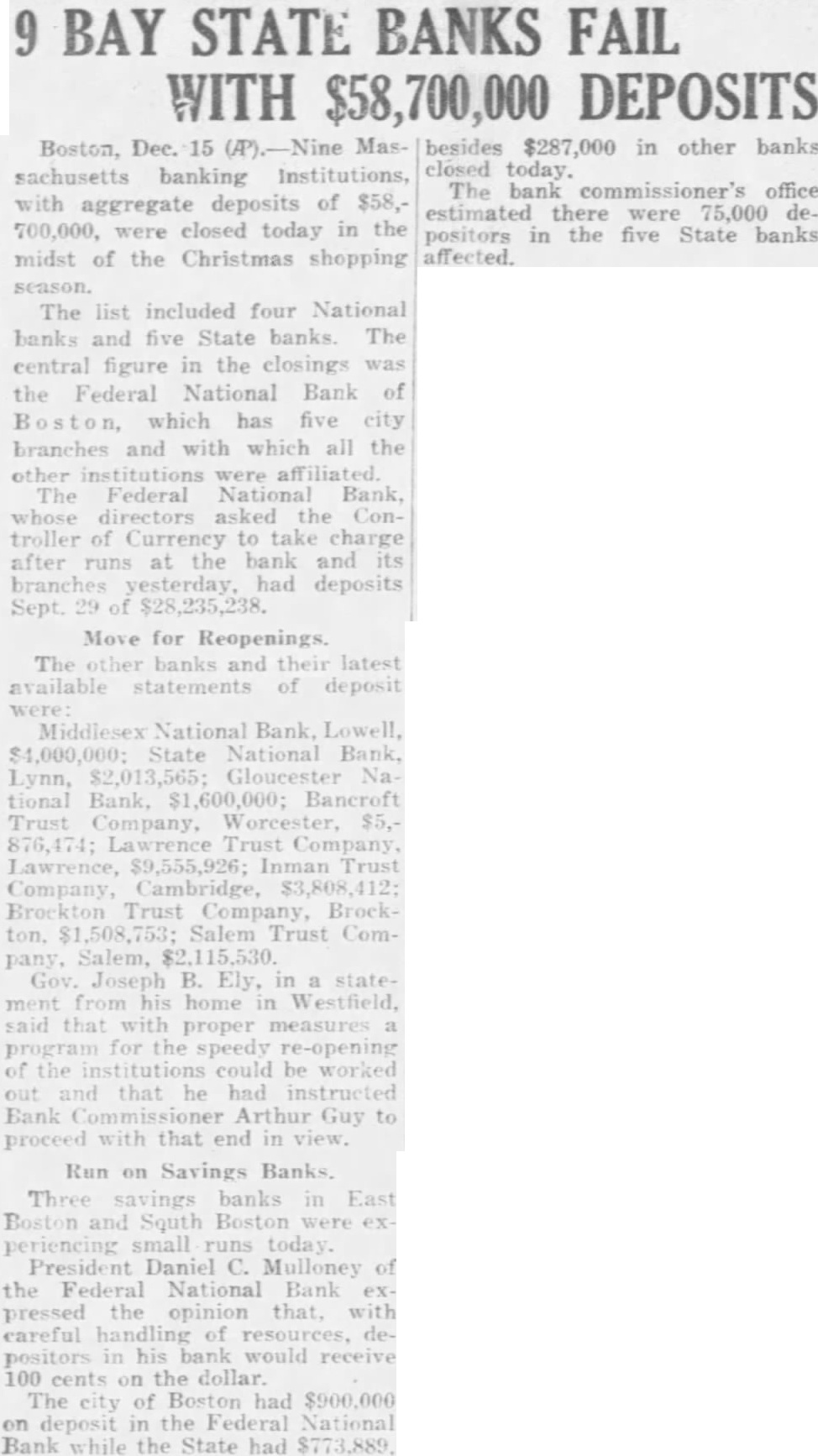 9 BAY STATE BANKS FAIL WITH $58,700,000 DEPOSITS Boston, Dec. 15 (A).-Nine Massachusetts banking Institutions, with aggregate deposits of $58,700,000, were closed today in the midst of the Christmas shopping season. The list included four National banks and five State banks. The central figure in the closings was the Federal National Bank of Boston, which has five city branches and with which all the other institutions were affiliated. The Federal National Bank, whose directors asked the Controller of Currency to take charge after runs at the bank and its branches yesterday, had deposits Sept. 29 of $28,235,238. Move for Reopenings. The other banks and their latest available statements of deposit were: Middlesex National Bank, Lowell, $4,000,000; State National Bank, Lynn, $2,013,565; Gloucester National Bank, $1,600,000; Bancroft Trust Company, Worcester, $5,876,474; Lawrence Trust Company, Lawrence, $9,555,926; Inman Trust Company, Cambridge, $3,808,412; Brockton Trust Company, Brockton, $1,508,753; Salem Trust Company, Salem, $2,115,530. Gov. Joseph B. Ely, in a statement from his home in Westfield, said that with proper measures a program for the speedy re-opening of the institutions could be worked out and that he had instructed Bank Commissioner Arthur Guy to proceed with that end in view. Run on Savings Banks, Three savings banks in East Boston and South Boston were experiencing small runs today. President Daniel C. Mulloney of the Federal National Bank expressed the opinion that, with careful handling of resources, depositors in his bank would receive 100 cents on the dollar. The city of Boston had $900,000 on deposit in the Federal National Bank while the State had $773,889. besides $287,000 in other banks closed today. The bank commissioner's office estimated there were 75,000 depositors in the five State banks affected.