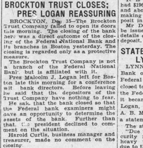 Brockton Trust Company (a state trust company) failed to open Dec 15, 1931 and the Massachusetts Bank Commissioner took possession of several trust companies affiliated with the Federal National Bank of Boston after a run on that central bank. The Brockton institution was closed by authorities to conserve assets/protect depositors (i.e., a suspension followed by takeover), not because of an independent depositor run on Brockton itself.