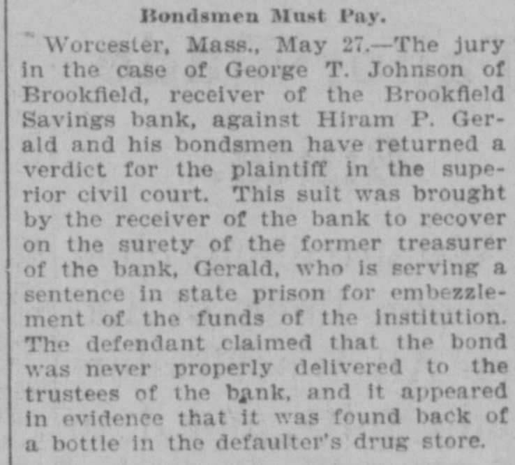 THE H. P. GERALD ESTATE. What Assignee Johnson Says About the Matter. Brookfield, Feb. 21.-Hon. George W. Johnson, assignee for the insolvent estate of Hiram P. Gerald, says as soon as the dividend sheet comes, he will pay the second and final dividend of $189, which is three-tenths per cent. Mr. Johnson is also receiver for the defunct Brookfield Savings Bank. He says the final settlement of the bank affairs is delayed to ascertain the value of a small claim in the hands of Lawyer Gardner of Springfield. The final dividend will be from 24 to 25 per cent, and will be paid as soon as allowable. AT MOULTON'S FACTORY. Fourteen upper leather cutters went to work at C. H. Moulton's factory, this morning. One thousand pairs of samples are to be cut. The sole leather department go to work Wednesday and the other departments will go to work in order as the work comes. THE NEWTON ESTATE. The three administrators of the Newton estate will meet at the house, at Rice corner, tomorrow, and will post bills for an auction to be held Saturday, when the cattle, horse and poultry will be sold. The administrators are Sumner Holmes of North Brookfield, Timothy Howard of North Brookfield and Deputy Sheriff W. E. Tarbell of East Brookfield. The property was valued in the tax report of 1897 at $1265. DEATH OF HARVEY S. OLDS. Harvey S. Olds passed away Monday morning at the home of his niece, Mrs. Larned Laflin. Mr. Olds was stricken with paralysis about two weeks ago at the house of Mrs. Marcy, where he had been boarding. He was immediately taken to Mr. Laflin's, where he has been most tenderly cared for. He was born in Brookfield, and has spent the greater part of his life here. His age was 84 years and 9 months. He leaves no family. EFFECTS OF THE STORM. The severe rain and sleet storm that started early Sunday morning lasted all of that day and all of Monday. On Sunday the town clock stopped at 9.50 and the faces of the clock are encased in ice. There was a small attendance at the churches in the morning and services in the evening were suspended. The trolley cars were running late, but with some regularity. Large limbs blew down from badly decayed trees, and made the sidewalks and roads impassable at times. The storm continued all Sunday night and the wires about town hung heavy with ice. The limb of a tree fell on the west end of the Warren, Brookfield and Spencer electric railway, and made a short circuit, which delayed the cars from 6.45 to 10.30 a. m. before the trouble was found and remedied. The cars containing the passengers going to work were the ones stalled. All of the schools held sessions despite the storm. All of the schools held exercises appropriate to the memory of George Washington. The schools will have a holiday tomorrow.
