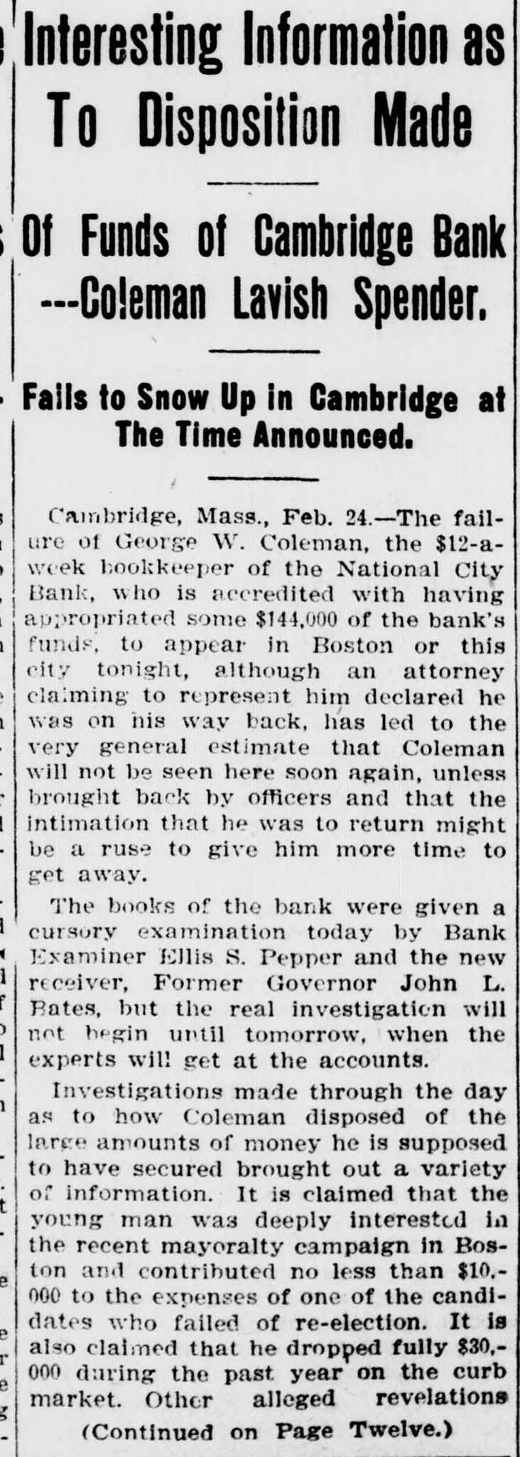 Interesting Information as To Disposition Made Of Funds of Cambridge Bank ---Co!eman Lavish Spender. Fails to Snow Up in Cambridge at The Time Announced. Cambridge, Mass., Feb. 24.-The failure of George W. Coleman, the $12-aweek bookkeeper of the National City Bank, who is accredited with having appropriated some $144,000 of the bank's funds, to appear in Boston or this city tonight, although an attorney claiming to represent him declared he was on his way back, has led to the very general estimate that Coleman will not be seen here soon again, unless brought back by officers and that the intimation that he was to return might be a ruse to give him more time to get away. The books of the bank were given a cursory examination today by Bank Examiner Ellis S. Pepper and the new receiver, Former Governor John L. Bates, but the real investigation will not begin until tomorrow, when the experts will get at the accounts. Investigations made through the day as to how Coleman disposed of the large amounts of money he is supposed to have secured brought out a variety of information. It is claimed that the young man was deeply interested in the recent mayoralty campaign in Boston and contributed no less than $10.000 to the expenses of one of the candidates who failed of re-election. It is also claimed that he dropped fully $30,000 during the past year on the curb market. Other alleged revelations (Continued on Page Twelve.)