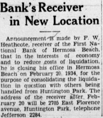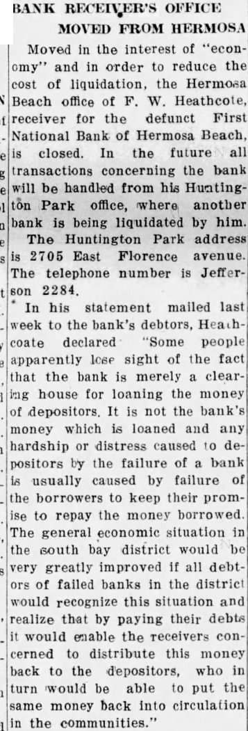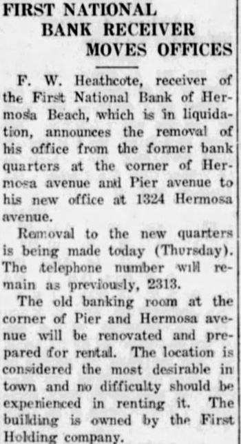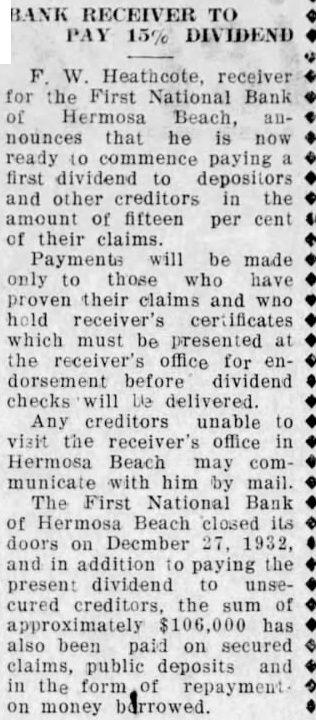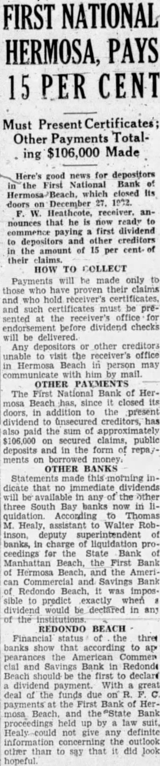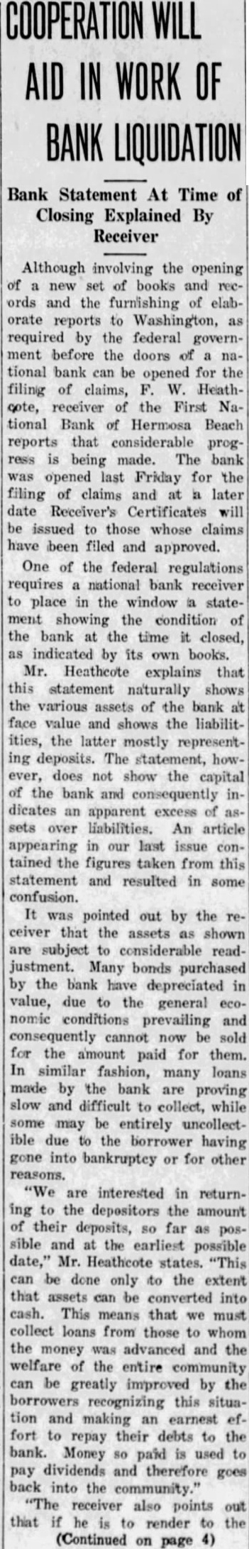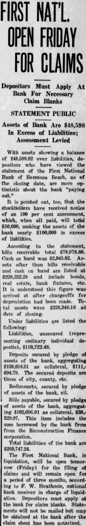 FIRST NAT'L. OPEN FRIDAY FOR CLAIMS Depositors Must Apply At Bank For Necessary Claim Blanks STATEMENT PUBLIC Assets of Bank Are $48,598 In Excess of Liabilities; Assessment Levied With assets showing balance of $48,598.92 over liabilities, depositors who have viewed the statement of the First National Bank of Hermosa Beach, as of the closing date, are more optimistic about the bank "paying out." pointed out, too, that the stockholders have received notice of an 100 per cent assessment, which, when all paid, will total $50,000, making the assets of the bank nearly $100,000 in excess of liabilities. According to the statement, bills receivable total $78,978.86. Cash on hand was $2,045.02. Assets other than bills receivable and cash hand are listed at $228,322.28 and include bonds, real estate, bank fixtures, etc. understood this figure was arrived at after chargeoffs for depreciation had been made. Total assets were $228,346.16 at date of closing. Under liabilities are listed the following: Liabilities, unsecured (representing ordinary individual deposits), $110,722.48. Deposits secured by pledge of assets of the bank, aggregating $138,016.51 as collateral, $111,694.79. The secured deposits are those of city, county, etc. Rediscounts, secured by pledge of assets of the bank, nil. Bills payable, secured by pledge of assets of the bank, aggregat$102,656.91 as collateral, $38,329.97. This item includes the sum borrowed by the bank from from the Reconstruction Finance corporation. Total liabilities of the bank are The First National Bank, in liquidation, will be open tomorrow (Friday) for the filing of claims and will remain open for period of three months, according to Heathcote, national bank receiver in charge of liquidation. Depositors must apply at the bank for claim blanks. Statements will not be mailed but may be obtained the bank after the claim sheet has been notarized.