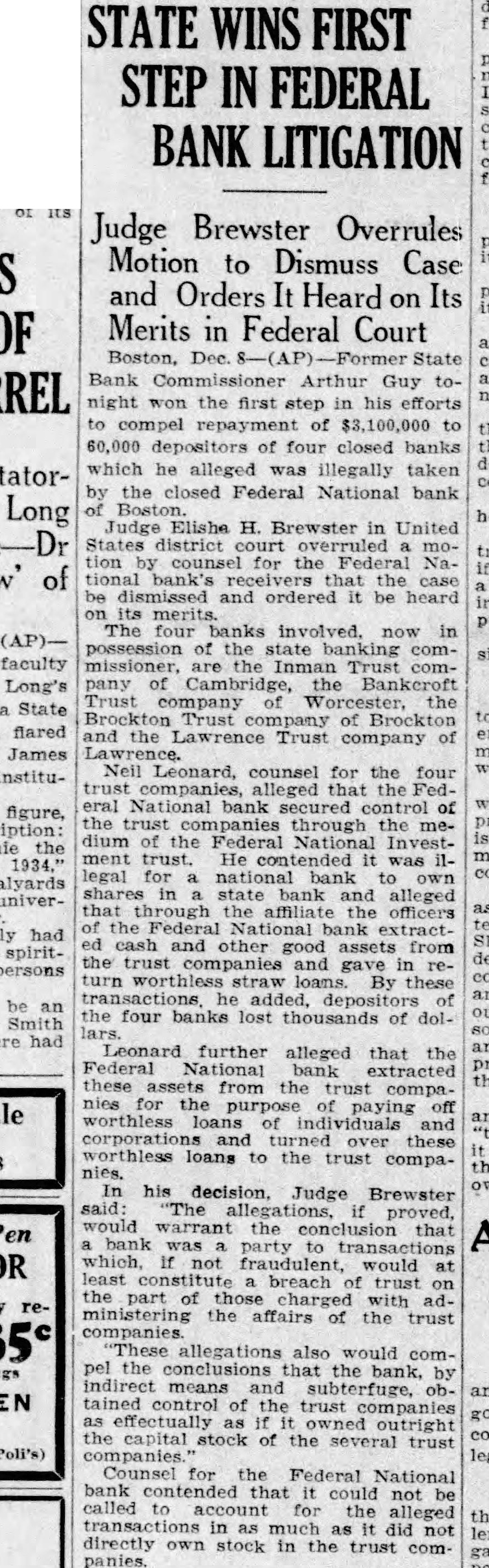 STATE WINS FIRST STEP IN FEDERAL BANK LITIGATION Judge Brewster Overrules Motion to Dismuss Case and Orders Heard on Its Merits in Federal Court Boston, Dec. State Bank Arthur Guy tonight won the first step in his efforts compel repayment $3,100,000 to 60,000 depositors of four closed banks which alleged illegally taken the closed Federal National bank Judge Elisha H. Brewster in United States district court tion counsel for the Federal Nathe and ordered be heard merits. four banks involved. now in possession of the state commissioner, Inman Trust of Cambridge, Bankcroft Trust company the Trust of Brockton the Lawrence Trust company Neil Leonard, counsel the companies, alleged the National bank of trust companies through the medium the Federal National ment trust. He contended legal national to and alleged the officers the cash and other good assets the trust companies and gave in return straw loans. By these are added, the four banks lost thousands of dolfurther alleged that the Federal the these from trust for the worthless loans corporations and over these loans to the trust compahis decision, Judge Brewster would bank party fraudulent, would least breach trust the part those charged with administering the affairs the trust allegations also would comthe conclusions the bank, indirect means tained control trust outright capital stock of the trust Poli's) Counsel Federal National called bank contended that could not account for the alleged in much did not directly own stock in trust companies.