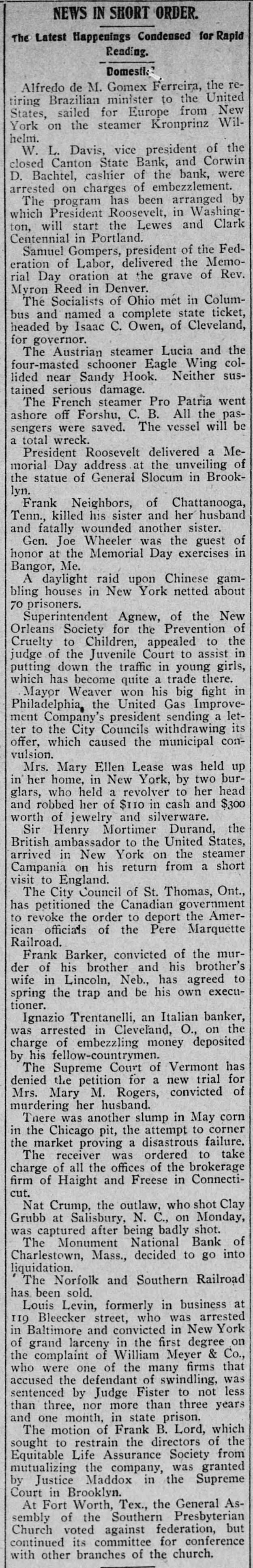 NEWS IN SHORT ORDER. The Latest Happenings Condensed for Rapid Reading. Domestic Alfredo de M. Gomex Ferreira, the retiring Brazilian minister to the United States, sailed for Europe from New York on the steamer Kronprinz Wilhelm. W. L. Davis, vice president of the closed Canton State Bank, and Corwin D. Bachtel, cashier of the bank, were arrested on charges of embezzlement. The program has been arranged by which President Roosevelt, in Washington, will start the Lewes and Clark Centennial in Portland. Samuel Gompers, president of the Federation of Labor, delivered the Memorial Day oration at the grave of Rev. Myron Reed in Denver. The Socialists of Ohio met in Columbus and named a complete state ticket, headed by Isaac C. Owen, of Cleveland, for governor. The Austrian steamer Lucia and the four-masted schooner Eagle Wing collided near Sandy Hook. Neither sustained serious damage. The French steamer Pro Patria went ashore off Forshu, C. B. All the passengers were saved. The vessel will be a total wreck. President Roosevelt delivered a Memorial Day address at the unveiling of the statue of General Slocum in Brooklyn. Frank Neighbors, of Chattanooga, Tenn., killed his sister and her husband and fatally wounded another sister. Gen. Joe Wheeler was the guest of honor at the Memorial Day exercises in Bangor, Me. A daylight raid upon Chinese gambling houses in New York netted about 70 prisoners. Superintendent Agnew, of the New Orleans Society for the Prevention of Cruelty to Children, appealed to the judge of the Juvenile Court to assist in putting down the traffic in young girls, which has become quite a trade there. Mayor Weaver won his big fight in Philadelphia, the United Gas Improvement Company's president sending a letter to the City Councils withdrawing its offer, which caused the municipal convulsion. Mrs. Mary Ellen Lease was held up in her home, in New York, by two burglars, who held a revolver to her head and robbed her of $110 in cash and $300 worth of jewelry and silverware. Sir Henry Mortimer Durand, the British ambassador to the United States, arrived in New York on the steamer Campania on his return from a short visit to England. The City Council of St. Thomas, Ont., has petitioned the Canadian government to revoke the order to deport the American officials of the Pere Marquette Railroad. Frank Barker, convicted of the murder of his brother and his brother's wife in Lincoln, Neb., has agreed to spring the trap and be his own executioner. Ignazio Trentanelli, an Italian banker, was arrested in Cleveland, O., on the charge of embezzling money deposited by his fellow-countrymen. The Supreme Court of Vermont has denied the petition for a new trial for Mrs. Mary M. Rogers, convicted of murdering her husband. There was another slump in May corn in the Chicago pit, the attempt to corner the market proving a disastrous failure. The receiver was ordered to take charge of all the offices of the brokerage firm of Haight and Freese in Connecticut. Nat Crump, the outlaw, who shot Clay Grubb at Salisbury, N. C., on Monday, was captured after being badly shot. The Monument National Bank of Charlestown, Mass., decided to go into liquidation. The Norfolk and Southern Railroad has been sold. Louis Levin, formerly in business at 119 Bleecker street, who was arrested in Baltimore and convicted in New York of grand larceny in the first degree on the complaint of William Meyer & Co., who were one of the many firms that accused the defendant of swindling, was sentenced by Judge Fister to not less than three, nor more than three years and one month, in state prison. The motion of Frank B. Lord, which sought to restrain the directors of the Equitable Life Assurance Society from mutualizing the company, was granted by Justice Maddox in the Supreme