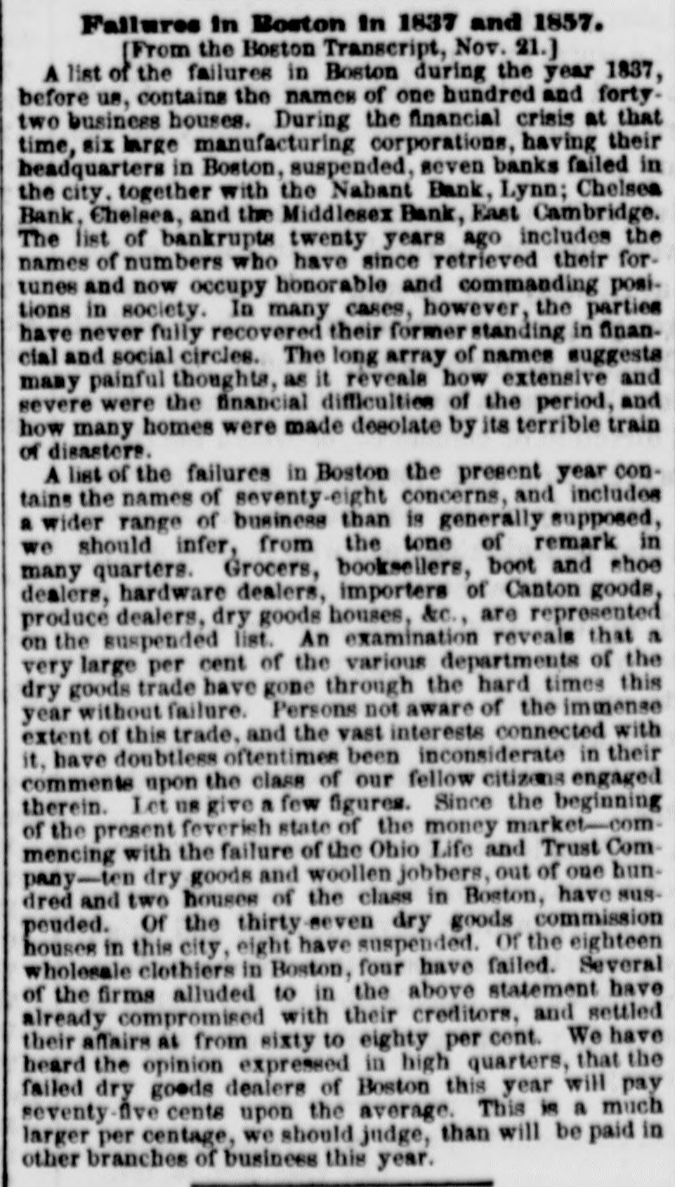 FAILURES IM 1837 AND 1857.-A list of the failures in Boston during the year 1837, before us, contains the namae of one hundred forty-two business houses. During the financial crisis at that time, six large manufacturing corporations, having their head quarters in Boston, suspended. seven Banks failed in the city, together with the Nahant Bank, Lynn, Chelsea Bank, Chelsea, and the Middlesex Bank, East Cambridge. The list of bankrupts twenty years ago includes the names of numbers who have since retrieved their fortunes and now occupy honorable and commanding positions in society. In many cases, however, the parties have never fully recovered their former standing in financial and social circles. The long array of names suggests many painful thoughts, as it reveals how extensive and severe were the financial difficulties of the period, and how many homes were made desolate by its terrible train of disasters. A list of failures in Boston the present year contains the names of seventy. eight concerns, and includes a wider range of busines than is generally supposed, we should infer, from the tone of remark in many quarters. Grocers, Booksellers, Boot and Shoe Dealers, Hardware Dealers, Importers of Canton Goods, Produce Dealers, Dry Goods Houses, etc., are represented on the suspended list. An examination reveals that a very large per cent, of the various departments of the Dry Goods Trade have gone through the hard times this year without failure. Persons not aware of the immense extent of this trade, and the vast interests connected with it, have doubtless oftentimes been inconsiderate in their comments upon the class of our fellow citizens engaged therein. Let us give a few figures. Since the beginning of the present feverish state of the money market-commencing with the failure of the Ohio Life and Trust Company-ten Dry Goods and Woolen Jobbers, out of one hundred and two houses of the class in Boston, have suspended. Of the thirty-seven Dry Goods Commission Houses in this city, eight have suspended. Of the eighteen Wholesale Clothiers in Boston, four have failed. Several of the firms alluded to in the above statements have already compromised with their creditors, and settled their affairs at from sixty to eighty per cent, We have heard the opinion expressed in high quarters, that the failed dry goods dealers of Boston this year will pay seventy. five cents upon the average. This is a much larger per centage, we should judge, than will be paid in other branches of business this year.-BosNow ton Transcript. with