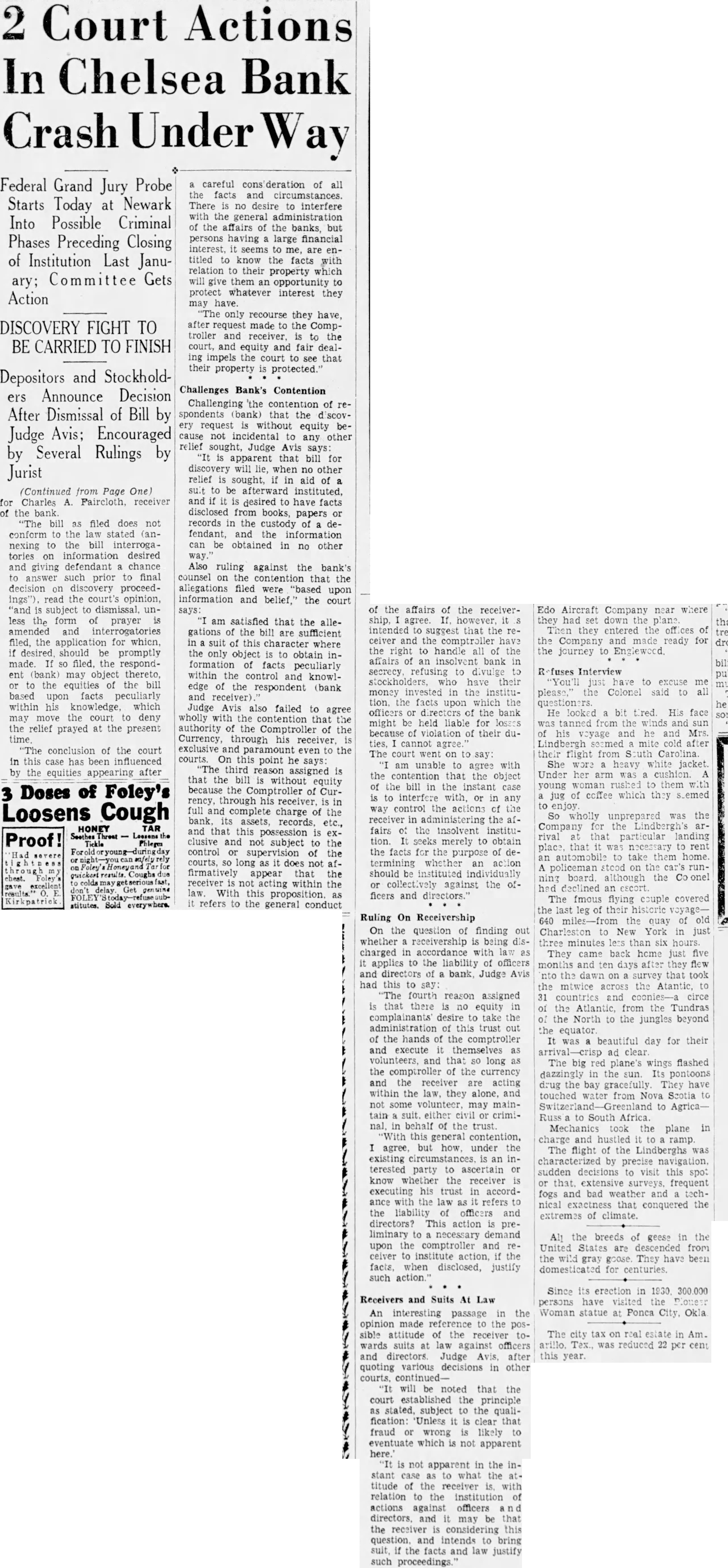 2 Court Actions In Chelsea Bank Crash Under Way Federal Grand Jury Probe Starts Today at Newark Into Possible Criminal Phases Preceding Closing of Institution Last January; Gets Action DISCOVERY FIGHT TO BE CARRIED TO FINISH Depositors and Stockholders Announce Decision After Dismissal of Bill by Judge Avis: Encouraged by Several Rulings by Jurist (Continued from Page One) for Charles A. Faircloth, receiver of the bank. "The bill as filed does not conform to the law stated (annexing to the bill interrogatories on information desired and giving defendant a chance to answer such prior to final decision on discovery proceedings"), read the court's opinion, "and is subject to dismissal. unless the form of prayer is amended and interrogatories filed, the application for which, if desired should be promptly made. If so filed, the respondent (bank) may object thereto. or to the equities of the bill based upon facts peculiarly within his knowledge, which may move the court to deny the relief prayed at the present time "The conclusion of the court in this case has been influenced by the equities appearing after a careful deration of all the facts and circumstances. There is no desire to interfere with the general administration of the affairs of the banks, but persons having a large financial interest, it seems to me, are entitled to know the facts with relation to their property which will give them an opportunity to protect whatever interest they may have. "The only recourse they have, after request made to the Comptroller and receiver. is to the court, and equity and fair dealing impels the court to see that their property is protected. Challenges Bank's Contention Challenging the contention of respondents (bank) that the discovery request is without equity because not incidental to any other relief sought, Judge Avis says: is apparent that bill for discovery will lie, when no other relief is sought, if in aid of a suit to be afterward instituted, and if it is desired to have facts disclosed from books, papers or records in the custody of defendant, and the information can be obtained in no other way." Also ruling against the bank's counsel on the contention that the allegations filed were "based upon information and belief,' the court says: "I am satisfied that the allegations of the bill are sufficient in suit of this character where the only object is to obtain information of facts peculiarly within the control and knowledge of the respondent (bank and receiver). Judge Avis also failed to agree wholly with the contention that the authority of the Comptroller of the Currency, through his receiver. is exclusive and paramount even to the courts. On this point he says: "The third reason assigned is that the bill is without equity because the Comptroller of Currency, through his receiver, is in full and complete charge of the bank. its assets, records. etc., and that this possession is exclusive and not subject to the control or supervision of the courts, so long as it does not affirmatively appear that the receiver is not acting within the law. With this proposition. as it refers to the general conduct of the affairs of the receivership, agree. If however, it S intended suggest that the receiver and the comptroller have the right to handle all of the affairs of an insolvent bank in secrecy refusing to divulge to stockholders, who have their money invested in the institution. the facts upon which the officers or directors of the bank might be held liable for losses because of violation of their duties, cannot agree The court went on to say "I am unable to agree with the contention that the object of the bill in the instant case is to interfere with, or in any way control the actions of the receiver in administering the affairs of the insolvent institution. It seeks merely to obtain the facts for the purpose of determining whether an action should be instituted individually or collectively against the officers and directors.' Ruling On Receivership On the question of finding out whether receivership is being discharged in accordance with law as it applies to the liability of officers and directors of a bank, Judge Avis had this to say: "The fourth reason assigned is that there is no equity in complainants desire to take the administration of this trust out of the hands of the comptroller and execute it themselves as volunteers, and that so long as the comptroller of the currency and the receiver are acting within the law, they alone, and not some volunteer, may maintain suit. either civil or criminal, in behalf of the trust. 'With this general contention, I agree, but how, under the existing circumstances, is an interested party to ascertain or know whether the receiver is executing his trust in accordance with the law as it refers to the liability of officers and directors? This action preliminary to necessary demand upon the comptroller and receiver to institute action, if the facts, when disclosed, justify such action. Receivers and Suits At Law An interesting passage in the opinion made reference to the possible attitude of the receiver towards suits at law against officers and directors Judge Avis, after quoting various decisions in other continued"It will be noted that the court established the principle as stated. subject to the qualification: Unless it is clear that fraud or wrong is likely to eventuate which is not apparent here. "It is not apparent in the instant case as to what the attitude of the receiver is, with relation to the institution of actions against officers nd directors, and it may be that the receiver is considering this question. and intends to bring suit, if the facts and law justify such proceedings. Edo Aircraft Company near where they had set down the plane Then they entered the off of the Company and made ready for the journey to Englewood. fuses Interview "You'll just have to excuse me please,' the Colonel said to all questioners. He looked a bit tired. His face wa