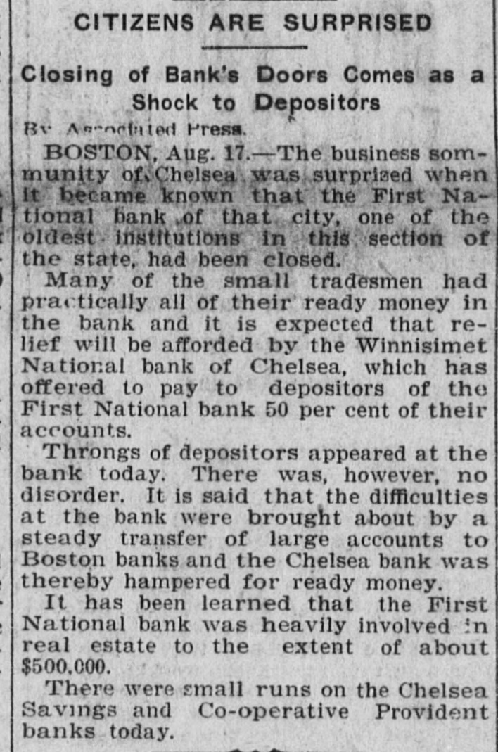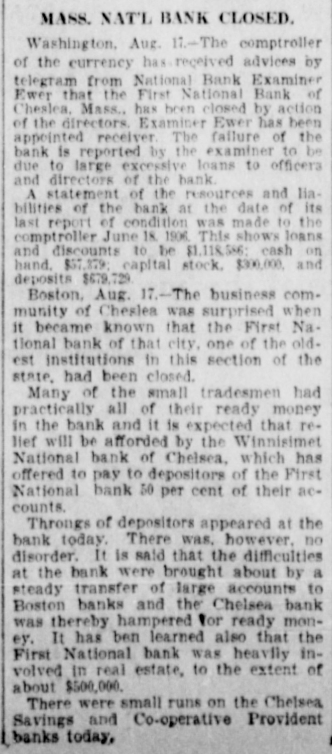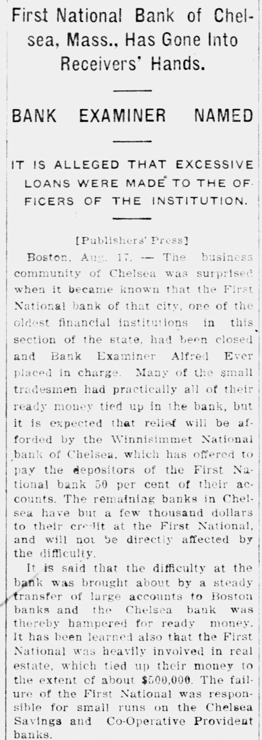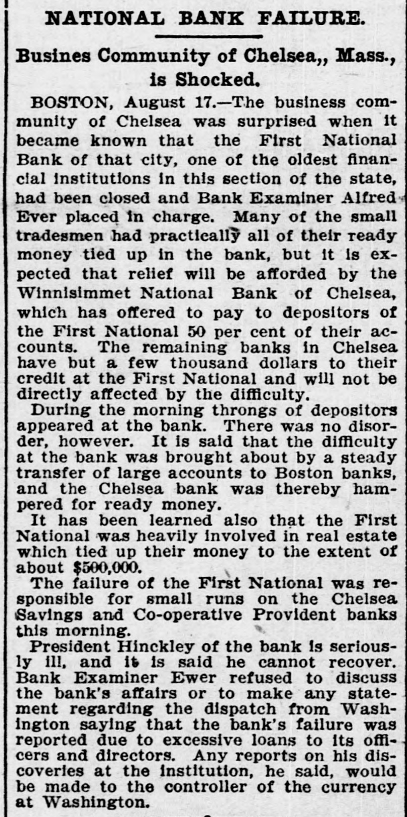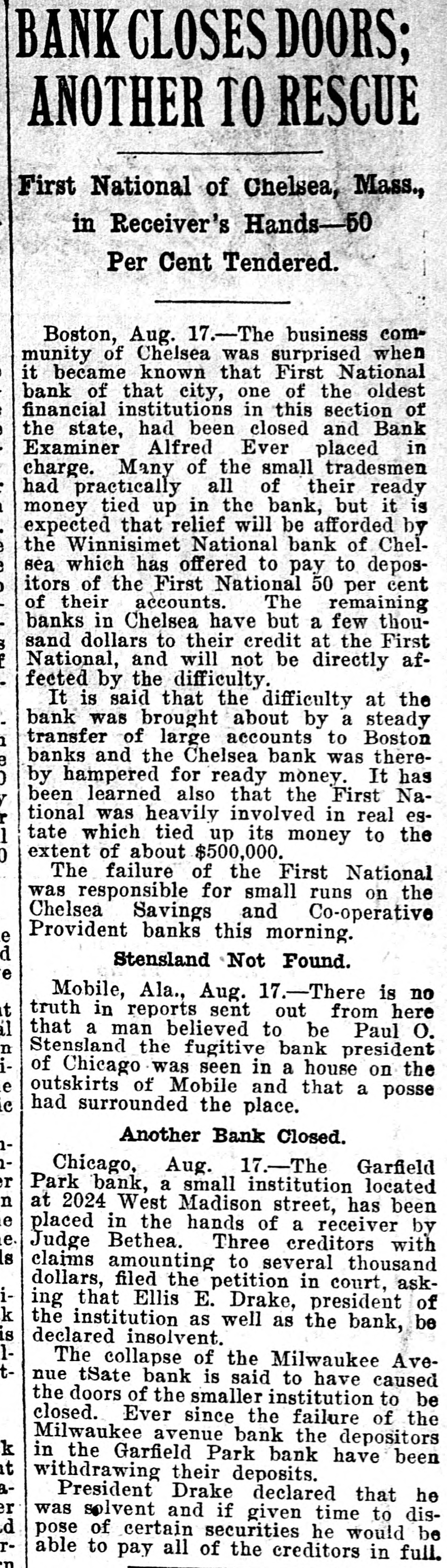 BANK GLOSES DOORS; ANOTHER TO RESCUE First National of Chelsea, Mass., in Receiver's Hands-50 Per Cent Tendered. Boston, Aug. 17.-The business community of Chelsea was surprised when it became known that First National bank of that city, one of the oldest financial institutions in this section of the state, had been closed and Bank Examiner Alfred Ever placed in charge. Many of the small tradesmen had practically all of their ready money tied up in the bank, but it is expected that relief will be afforded by the Winnisimet National bank of Chelsea which has offered to pay to depositors of the First National 50 per cent of their accounts. The remaining banks in Chelsea have but a few thousand dollars to their credit at the First National, and will not be directly affected by the difficulty. It is said that the difficulty at the bank was brought about by a steady transfer of large accounts to Boston banks and the Chelsea bank was thereby hampered for ready money. It has been learned also that the First National was heavily involved in real estate which tied up its money to the extent of about $500,000. The failure of the First National was responsible for small runs on the Chelsea Savings and Co-operative e Provident banks this morning. Stensland Not Found. Mobile, Ala., Aug. 17.-There is no truth in reports sent out from here that a man believed to be Paul O. Stensland the fugitive bank president of Chicago was seen in a house on the e outskirts of Mobile and that a posse C had surrounded the place. Another Bank Closed. Chicago, Aug. 17.-The Garfield r Park bank, a small institution located n at 2024 West Madison street, has been e placed in the hands of a receiver by e Judge Bethea. Three creditors with Is claims amounting to several thousand dollars, filed the petition in court, askiing that Ellis E. Drake, president of k the institution as well as the bank, be is declared insolvent. 1The collapse of the Milwaukee Avetnue tSate bank is said to have caused the doors of the smaller institution to be closed. Ever since the failure of the Milwaukee avenue bank the depositors k in the Garfield Park bank have been t withdrawing their deposits. aPresident Drake declared that he er was solvent and if given time to disd pose of certain securities he would be rable to pay all of the creditors in full.