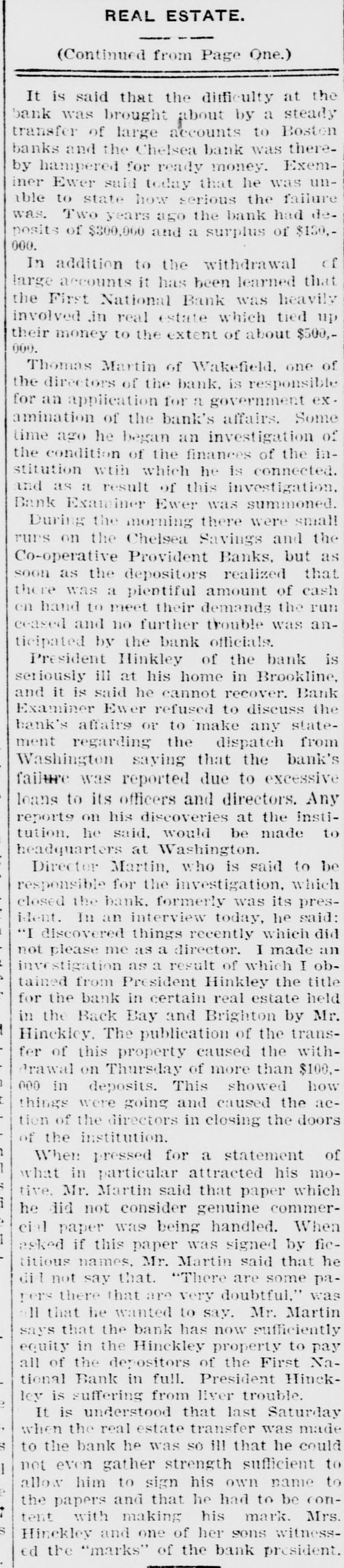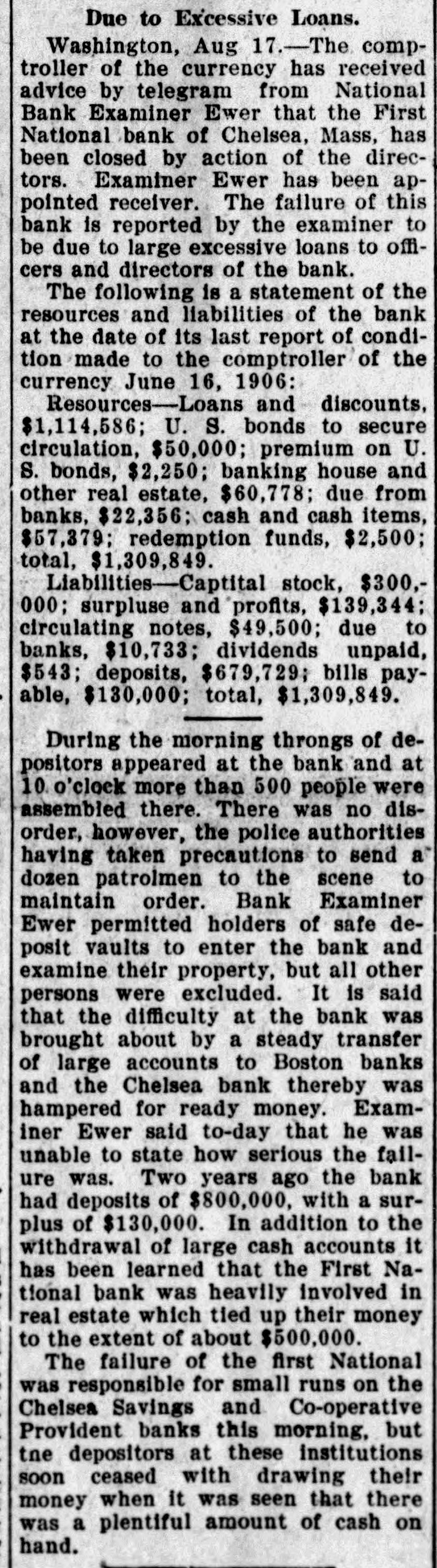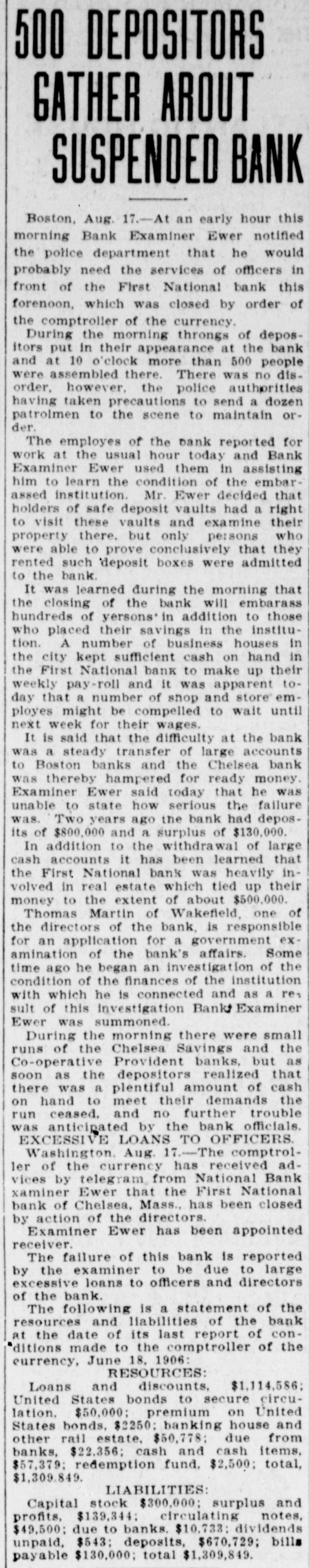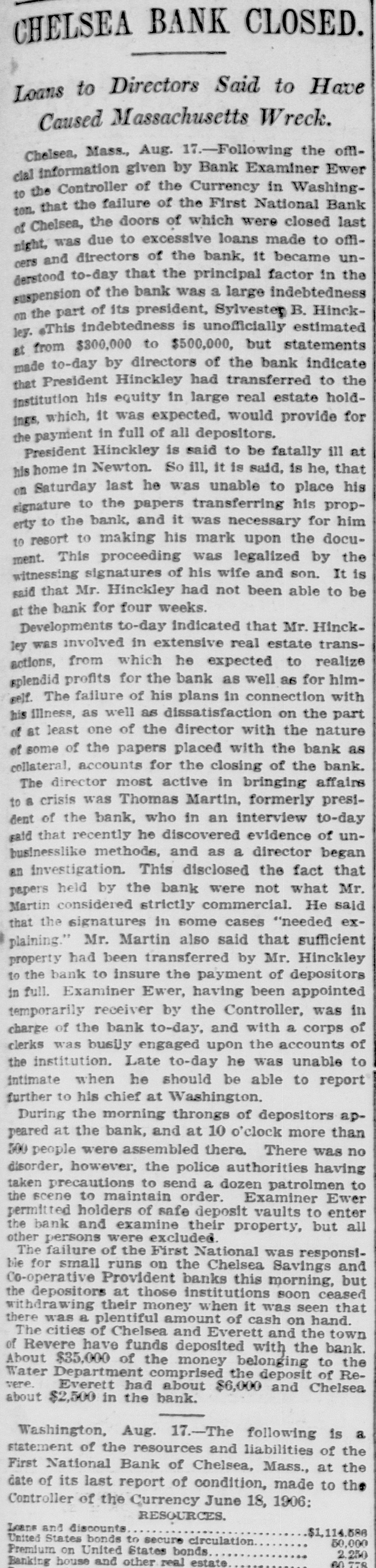 BANK GLOSES DOORS; ANOTHER TO RESCUE First National of Chelsea, Mass., in Receiver's Hands-50 Per Cent Tendered. Boston, Aug. 17.-The business community of Chelsea was surprised when it became known that First National bank of that city, one of the oldest financial institutions in this section of the state, had been closed and Bank Examiner Alfred Ever placed in charge. Many of the small tradesmen had practically all of their ready money tied up in the bank, but it is expected that relief will be afforded by the Winnisimet National bank of Chelsea which has offered to pay to depositors of the First National 50 per cent of their accounts. The remaining banks in Chelsea have but a few thousand dollars to their credit at the First National, and will not be directly affected by the difficulty. It is said that the difficulty at the bank was brought about by a steady transfer of large accounts to Boston banks and the Chelsea bank was thereby hampered for ready money. It has been learned also that the First National was heavily involved in real estate which tied up its money to the extent of about $500,000. The failure of the First National was responsible for small runs on the Chelsea Savings and Co-operative e Provident banks this morning. Stensland Not Found. Mobile, Ala., Aug. 17.-There is no truth in reports sent out from here that a man believed to be Paul O. Stensland the fugitive bank president of Chicago was seen in a house on the e outskirts of Mobile and that a posse C had surrounded the place. Another Bank Closed. Chicago, Aug. 17.-The Garfield r Park bank, a small institution located n at 2024 West Madison street, has been e placed in the hands of a receiver by e Judge Bethea. Three creditors with Is claims amounting to several thousand dollars, filed the petition in court, askiing that Ellis E. Drake, president of k the institution as well as the bank, be is declared insolvent. 1The collapse of the Milwaukee Avetnue tSate bank is said to have caused the doors of the smaller institution to be closed. Ever since the failure of the Milwaukee avenue bank the depositors k in the Garfield Park bank have been t withdrawing their deposits. aPresident Drake declared that he er was solvent and if given time to disd pose of certain securities he would be rable to pay all of the creditors in full.