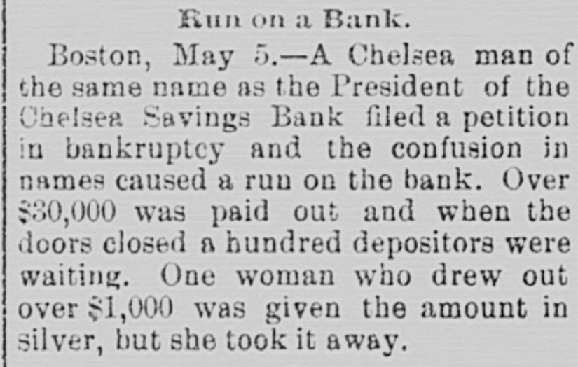 Run on a Bank. Boston, May 5.-A Chelsea man of the same name as the President of the Chelsea Savings Bank filed a petition in bankruptcy and the confusion in names caused a run on the bank. Over $30,000 was paid out and when the doors closed a hundred depositors were waiting. One woman who drew out over $1,000 was given the amount in silver, but she took it away.