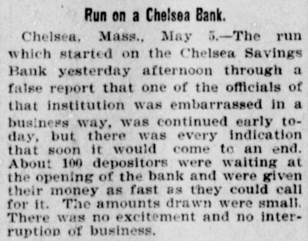 Run on a Chelsea Bank. Chelsea, Mass., May 5.-The run which started on the Chelsea Savings Bank yesterday afternoon through a false report that one of the officials of that institution was embarrassed in a business way, was continued early today, but there was every indication that soon it would come to an end. About 100 depositors were waiting at the opening of the bank and were given their money as fast as they could call for it. The amounts drawn were small. There was no excitement and no interruption of business.