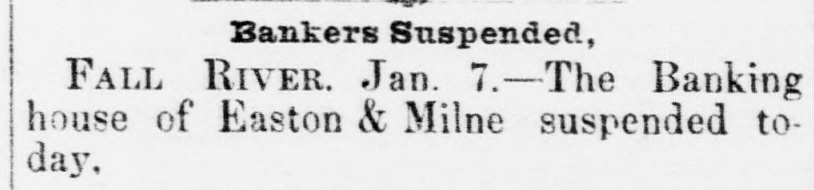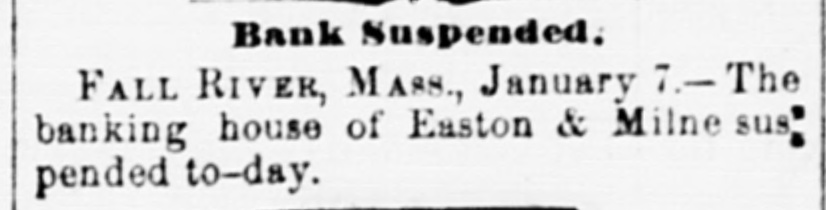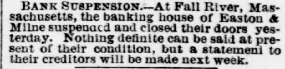 BANK SUSPENSION.-At Fall River, Massachusetts, the banking house of Easton & Milne suspenadd and closed their doors yesterday. Nothing definite can be said at present of their condition, but a statement to their creditors will be made next week.