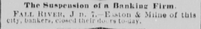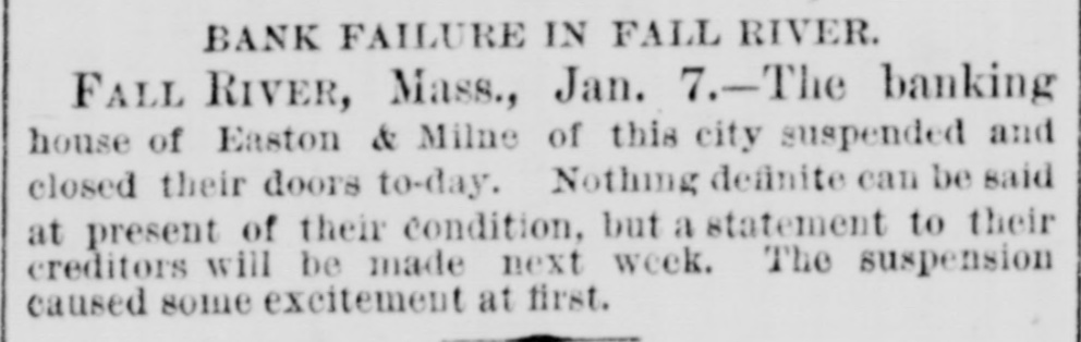 BANK FAILURE IN FALL RIVER. FALL RIVER, Mass., Jan. 7.-The banking house of Easton & Milne of this city suspended and closed their doors to-day. Nothing definite can be said at present of their condition, but a statement to their creditors will be made next week. The suspension caused some excitement at first.