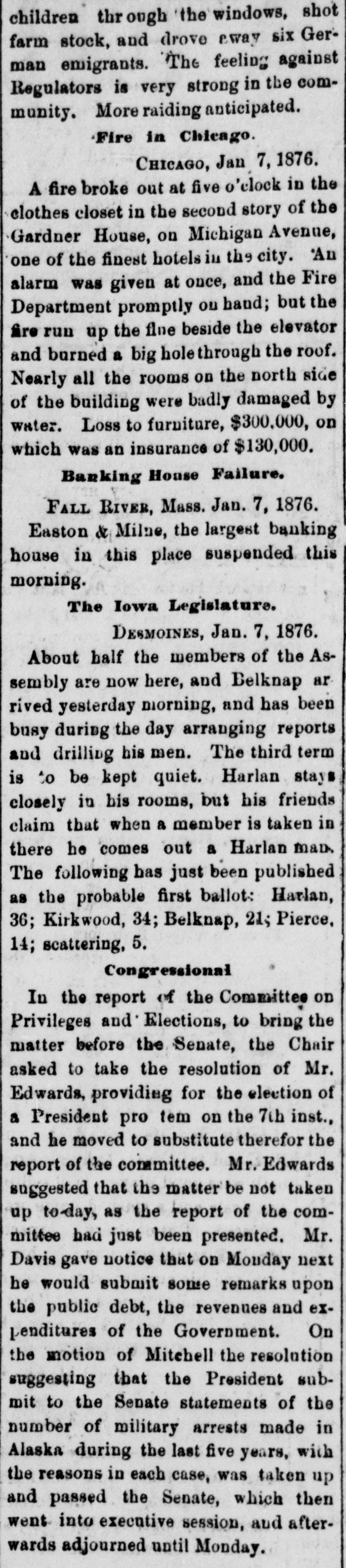 children through the windows, shot farm stock, and drove away six German emigrants. The feeling against Regulators is very strong in the community. More raiding anticipated. Fire in Chicago. CHICAGO, Jan 7, 1876. A fire broke out at five o'clock in the clothes closet in the second story of the Gardner House, on Michigan Avenue, one of the finest hotels in the city. An alarm was given at once, and the Fire Department promptly ou hand; but the fire run up the flue beside the elevator and burned a big holethrough the roof. Nearly all the rooms on the north side of the building were badly damaged by water. Loss to furniture, $300,000, on which was an insurance of $130,000. Banking House Failure. FALL RIVER, Mass. Jan. 7, 1876. Easton & Milne, the largest banking house in this place suspended this morning. The Iowa Legislature. DESMOINES, Jan. 7, 1876. About half the members of the Assembly are now here, and Belknap ar rived yesterday morning, and has been busy during the day arranging reports and drilling his men. The third term is to be kept quiet. Harlan stays closely in his rooms, but his friends claim that when a member is taken in there he comes out a Harlan man. The following has just been published as the probable first ballot: Harlan, 36; Kirkwood, 34; Belknap, 21; Pierce, 14; scattering, 5. Congressional In the report of the Committee on Privileges and Elections, to bring the matter before the Senate, the Chair asked to take the resolution of Mr. Edwards, providing for the election of a President pro tem on the 7th inst., and he moved to substitute therefor the report of the committee. Mr. Edwards suggested that the matter be not taken up to-day, as the report of the committee had just been presented. Mr. Davis gave notice that on Monday next he would submit some remarks upon the public debt, the revenues and expenditures of the Government. On the motion of Mitchell the resolution suggesting that the President submit to the Senate statements of the number of military arrests made in Alaska during the last five years, with the reasons in each case, was taken up and passed the Senate, which then went into executive session, and afterwards adjourned until Monday.