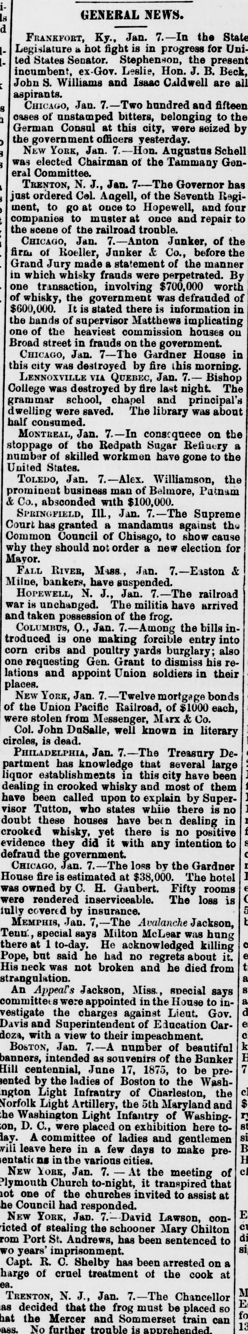 GENERAL NEWS. Is d FRANKFORT, Ky., Jan. 7.-In the State Legislature a not fight is in progress for United States Senator. Stephenson, the present incumbent, ex-Gov. Leslie, Hon. J. B. Beck. John S. Williams and Isaac Caldwell are all < aspirants. CHICAGO, Jan. 7.-Two hundred and fifteen S cases of unstamped bitters, belonging to the a German Consul at this city, were seized by the government officers yesterday. NEW YORK, Jan. 7.-Hon. Augustus Schell was elected Chairman of the Tammany General Committee. TRENTON, N. J., Jan. 7--The Governor has just ordered Col. Aagell, of the Seventh Regiment, to go at once to Hopewell, and four companies to muster at once and repair to the scene of the railroad trouble. CHICAGO, Jan. 7.-Anton Junker, of the firm of Roeller, Junker & Co., before the Grand Jury made a statement of the manner in which whisky frauds were perpetrated. By one transaction, involving $700,000 worth of whisky, the government was defrauded of $600,000. It is stated there is information in the bands of supervisor Matthews implicating one of the heaviest commission houses on Broad street in frauds on the government. CHICAGO, Jan. 7-The Gardner House in this city was destroyed by fire this morning. LENNOXVILLE VIA QUEBEC, Jan. 7.- Bishop College was destroyed by fire last night. The grammar school, chapel and principal's dwelling were saved. The library was about half consumed. MONTREAL, Jan. 7.-In consequece on the stoppage of the Redpath Sugar Refinery a number of skilled workmen have gone to the United States. TOLEDO, Jan. 7.-Alex. Williamson, the prominent business man of Belmore, Patnam & Co., absconded with $100,000. SPRINGFIELD, Ill., Jan. -The Supreme Court has granted a mandamus against the Common Council of Chisago, to show cause why they should not order a new election for Mayor. FALL RIVER, Mass., Jan. 7.-Easton & Milne, bankers, have suspended. HOPEWELL, N. J., Jan. 7.-The railroad war is unchanged. The militia have arrived and taken possession of the frog. COLUMBUS, O., Jan. 7.-Among the bills introduced is one making forcible entry into corn cribs and poultry yards burglary; also one requesting Gen. Grant to dismiss his relations and appoint Union soldiers in their places. NEW YORK, Jan. 7.-Twelve mortgage bonds of the Union Pacific Railroad, of $1000 each, were stolen from Messenger, Marx & Co. Col. John DuSalle, well known in literary circles, is dead. PHILADELPHIA, Jan. 7.-The Treasury Department has knowledge that several large liquor establishments in this city have been dealing in crooked whisky and most of them have been called upon to explain by Supervisor Tutton, who states while there is no doubt these houses have been dealing in crooked whisky, yet there is no positive evidence they did it with any intention to defraud the government. CHICAGO, Jan. 7.-The loss by the Gardner House fire is estimated at $38,000. The hotel was owned by C. H. Gaubert. Fifty rooms were rendered inserviceable. The loss is jully covered by insurance. MEMPHIS, Jan. 7,-The Avalanche Jackson, Tenn., special says Milton McLear was hung there at 1 to-day. He acknowledged killing Pope, but said he had no regrets about it. His neck was not broken and he died from strangulation. An Appeal's Jackson, Miss., special says committees were appointed in the House to investigate the charges against Lieut. Gov. Davis and Superintendent of Education Cardoza, with a view to their impeachment. BOSTON, Jan. 7.--A number of beautiful banners, intended as souvenirs of the Bunker Hill centennial, June 17, 1875, to be presented by the ladies of Boston to the Washngton Light Infrantry of Charleston, the Norfolk Light Artillery, the 5th Maryland and the Washington Light Infantry of Washingon, D. C., were placed on exhibition here today. A committee of ladies and gentlemen will leave here in a few days to make presentatic ns in the various cities. NEW YORK, Jan. 7. - At the meeting of Plymouth Church to-night, it transpired that not one of the churches invited to assist at he Council had responded. E NEW YORK, Jan. David Lawson, conc icted of stealing the schooner Mary Chilton rom Port St. Andrews, has been sentenced to wo years' imprisonment. Capt. R. C. Shelby has been arrested on a harge of cruel treatment of the cook at ea. M TRENTON, N. J., Jan. 7.-The Chancellor E as decided that the frog must be placed so fo hat the Mercer and Sommerset train can 13 ass. No further trouble is apprehended.
