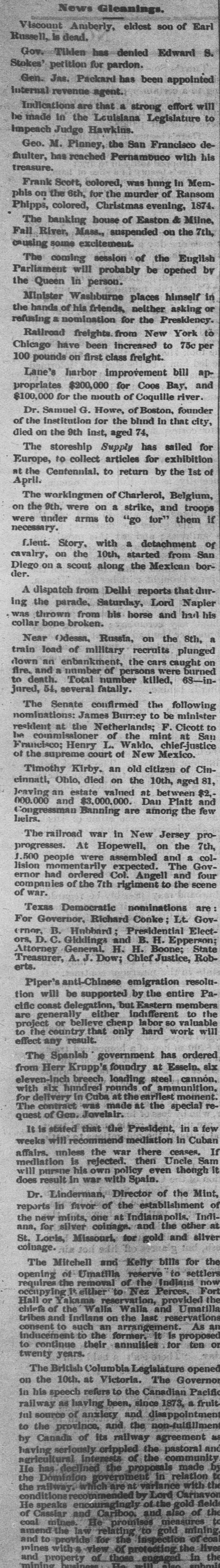 News Gleanings. Viscount Amberly, eldest son of Earl Russell, is dead. Gov. Tilden has denied Edward S. Stokes' petition for pardon. Gen. Jas. Packard has been appointed internal revenue agent. Indications are that a strong effort will be made In the Louisiana Legislature to Impeach Judge Hawkins. Geo. M. Pinney, the San Francisco defaulter, has reached Pernambuco with his treasure. Frank Scott, colored, was hung In Memphis on the 6th, for the murder of Ransom Phipps, colored, Christmas evening, 1874. The banking house of Easton & Milne, Fall River, Mass., suspended on the 7th, causing some excitement. The coming session of the English Parliament will probably be opened by the Queen In person. Minister Washburne places himself in the hands of his friends, neither asking or refusing a nomination for the Presidency. Railroad freights. from New York to Chicago have been increased to 75c per 100 pounds on first class freight. Lane's harbor improvement bill appropriates $200,000 for Coos Bay, and $100,000 for the mouth of Coquille river. Dr. Samuel G. Howe, of Boston, founder of the institution for the blind in that city, died on the 9th inst, aged 74, The storeship Supply has sailed for Europe, to collect articles for exhibition at the Centennial, to return by the 1st of April. The workingmen of Charleroi, Belgium, on the 9th. were on a strike, and troops were under arms to "go for" them if necessary. Lient. Story, with a detachment of cavalry, on the 10th, started from San Diego on a scout along the Mexican border. A dispatch from Delhi reports that during the parade, Saturday, Lord Napier was thrown from his horse and had his collar bone broken. Near Odessn. Russia, on the 8th, a train load of military recruits plunged down an enbankment, the cars caught on fire. and a number of persons were burned to death. Total number killed, 63-injured, 54, several fatally. The Senate confirmed the following nominations: James Burney to be minister resident at the Netherlands; F. Cicott to be commissioner of the mint at Sau Francisco; Henry L. Waldo, chief-justice of the supreme court of New Mexico. Timothy Kirby, an old citizen of Cincinnati, Ohio, died on the 10th, aged 81, Jeaving an estate valued at between $2,000.000 and $3,000,000. Dan Platt and Congressman Banning are among the few heirs. The railroad war in New Jersey proprogresses. At Hopewell, on the 7th, 1,500 people were assembled and a collision momentarily expected. The Governor had ordered Col. Angell and four companies of the 7th rigiment to the scene of war. Texas Democratic nominations are For Governor, Richard Conke; Lt. Governor, B. Hnbbard Presidential Electors, D. C. Giddings and B. H. Epperson; State Attorney General. H. H. Boone; Treasurer, A.J. Dow; Chief Justice, Roberts. Piper's anti-Chinese emigration resolution will be supported by the entire Pacific coast delegation, but Eastern members the generally either indifferent to are or believe cheap labor so valuable will project to the country that only hard work effect any result. The Spanish government has ordered six from Herr Krupp's foundry at Essein. eleven-inch breech loading steel. cannón. with six hundred rounds of ammunition. delivery in Cuba at the earliest moment. reThe for contract was made at the special quest of Gen. Javelair. It is stated that the President, in a few weeks will recommend mediation in Cuban If affairs. unless the war there ceases. Sam is rejected. then Uncle mediation his own policy even though it does will pursne result in war with Spain. Dr. Linderman, Director of the Mint, of reports In favor of the establishment Indinew mints, one at Indianapolis. other the for silver coinage. and the silver at ana, St. Loris, Missouri, for gold and coluage. soil The Mitchell and Kelly bills for settlers the opening of Umatilla reserve Indians to now the removal of the Fort reservation, requires occupying it either to Nez Perces, provided the Hall or Yakama Walla and Umatilla chiefs of the Walla servations and Indians on the last reser As an tribes such an arrangement. consent to to the former. it is proposed or inducement to continue their annuities for ten twenty years. The British Columbia Legislature opened the 10th. at Victoria. The Governor in on his speech refers to the Canadian Pacific fruit railway as having been, since 1873, a jul source of anxiety and disappointment non-fulfillment the province, and the as to Canada of its railway agreement by seriously crippled the pastoral community and the proposals having agricultural He has declined interests government of the in relation made the to the Dominion are at variance with the railway. which by Lord Carbavon field conditions encouragingly of the gold the He speaks Cariboo. and also of to of Cassiar and measures coal mines. He promises to gold mining the law relating of eoal view of and property of Box anhmil mining business amend and mines to with s provide for those the protecting inspection engaged the in live the