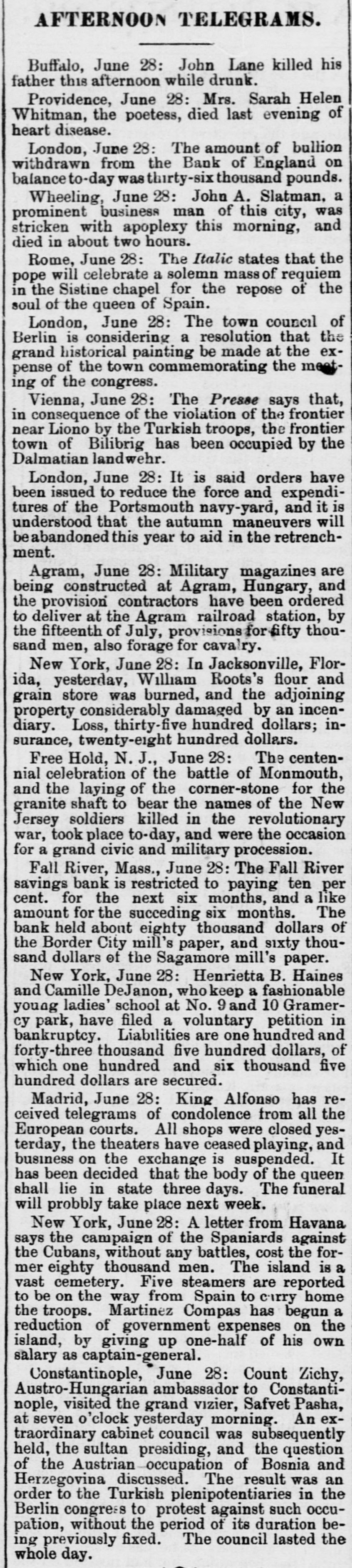 AFTERNOON TELEGRAMS. Buffalo, June 28: John Lane killed his father this afternoon while drunk. Providence, June 28: Mrs. Sarah Helen Whitman, the poetess, died last evening of heart disease. London, June 28: The amount of bullion withdrawn from the Bank of England on balance to-day was thirty-six thousand pounds. Wheeling, June 28: John A. Slatman. a prominent business man of this city, was stricken with apoplexy this morning, and died in about two hours. Rome, June 28: The Italic states that the pope will celebrate a solemn mass of requiem in the Sistine chapel for the repose of the soul of the queen of Spain. London, June 28: The town council of Berlin is considering a resolution that the grand historical painting be made at the expense of the town commemorating the meeting of the congress. Vienna, June 28: The Presse says that, in consequence of the violation of the frontier near Liono by the Turkish troops, the frontier town of Bilibrig has been occupied by the Dalmatian landwehr. London, June 28: It is said orders have been issued to reduce the force and expenditures of the Portsmouth navy-yard, and it is understood that the autumn maneuvers will beabandoned this year to aid in the retrenchment. Agram, June 28: Military magazines are being constructed at Agram, Hungary, and the provision contractors have been ordered to deliver at the Agram railroad station, by the fifteenth of July, provisions for fifty thousand men, also forage for cavalry. New York, June 28: In Jacksonville, Florida, yesterdav, William Roots's flour and grain store was burned, and the adjoining property considerably damaged by an incendiary. Loss, thirty-five hundred dollars; insurance, twenty-eight hundred dollars. Free Hold, N. J., June 28: The centennial celebration of the battle of Monmouth, and the laying of the corner-stone for the granite shaft to bear the names of the New Jersey soldiers killed in the revolutionary war, took place to-day, and were the occasion for a grand civic and military procession. Fall River, Mass., June 28: The Fall River savings bank is restricted to paying ten per cent. for the next six months, and a like amount for the succeding six months. The bank held about eighty thousand dollars of the Border City mill's paper, and sixty thousand dollars of the Sagamore mill's paper. New York, June 28: Henrietta B. Haines and Camille DeJanon, whokeep a fashionable young ladies' school at No. 9 and 10 Gramercy park, have filed a voluntary petition in bankruptcy. Liabilities are one hundred and forty-three thousand five hundred dollars, of which one hundred and six thousand five hundred dollars are secured. Madrid, June 28: King Alfonso has received telegrams of condolence from all the European courts. All shops were closed yesterday, the theaters have ceased playing, and business on the exchange is suspended. It has been decided that the body of the queen shall lie in state three days. The funeral will probbly take place next week. New York, June 28: A letter from Havana says the campaign of the Spaniards against the Cubans, without any battles, cost the former eighty thousand men. The island is a vast cemetery. Five steamers are reported to be on the way from Spain to carry home the troops. Martinez Compas has begun a reduction of government expenses on the island, by giving up one-half of his own salary as captain-general. Constantinople, June 28: Count Zichy, Austro-Hungarian ambassador to Constantinople, visited the grand vizier, Safvet Pasha, at seven o'clock yesterday morning. An extraordinary cabinet council was subsequently held, the sultan presiding, and the question of the Austrian occupation of Bosnia and Herzegovina discussed. The result was an order to the Turkish plenipotentiaries in the Berlin congress to protest against such occupation, without the period of its duration being previously fixed. The council lasted the whole day.