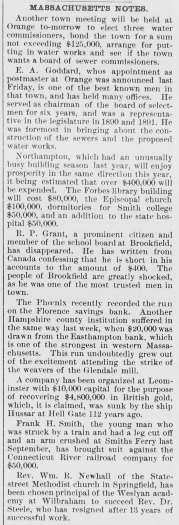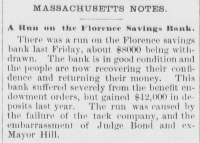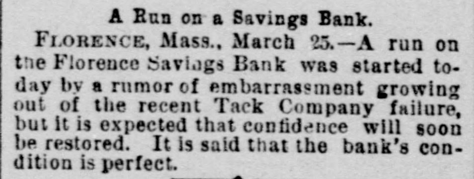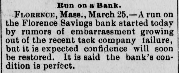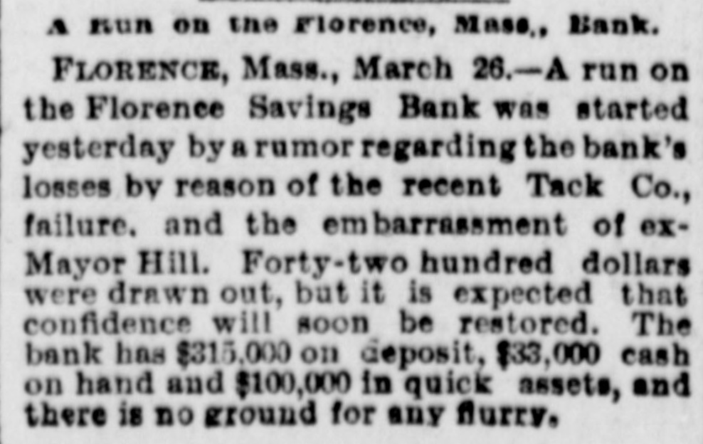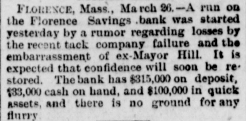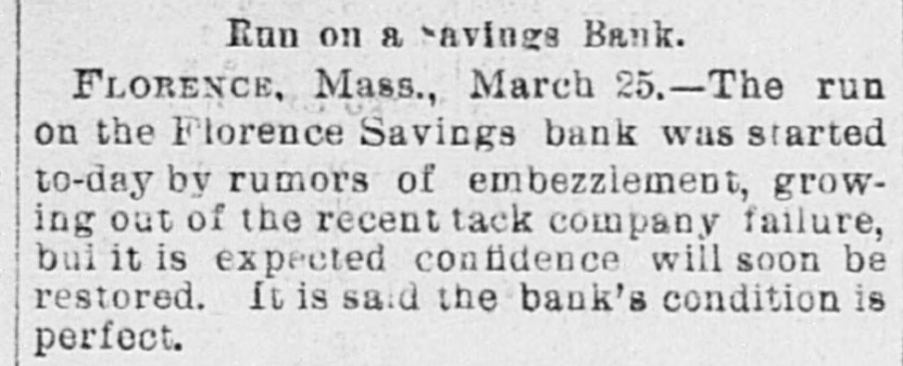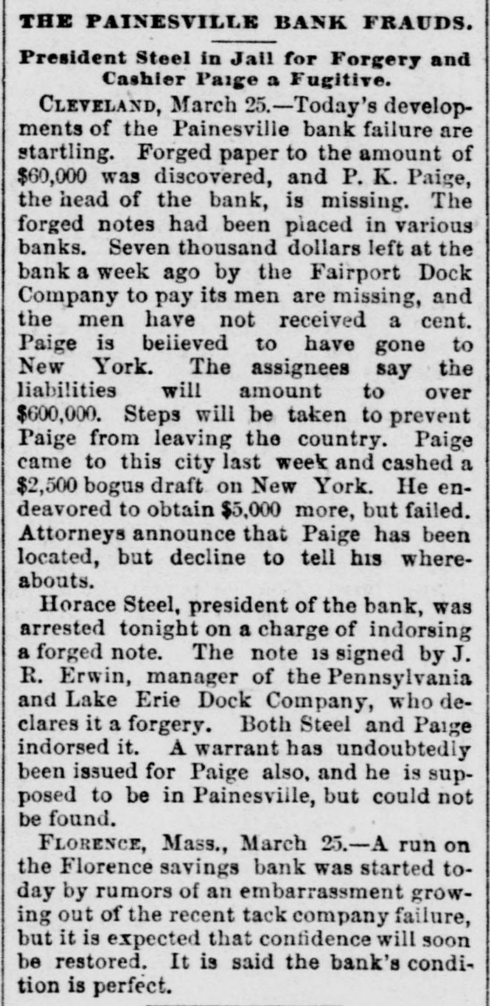 THE PAINESVILLE BANK FRAUDS. President Steel in Jail for Forgery and Cashier Paige a Fugitive. CLEVELAND, March Today's developments of the Painesville bank failure are startling. Forged paper to the amount of $60,000 was discovered, and P. K. Paige, the head of the bank, is missing. The forged notes had been piaced in various banks. Seven thousand dollars left at the bank a week ago by the Fairport Dock Company to pay its men are missing, and the men have not received a cent. Paige is believed to have gone to New York. The assignees say the liabilities will amount to over $600,000. Steps will be taken to prevent Paige from leaving the country. Paige came to this city last week and cashed a $2,500 bogus draft on New York. He endeavored to obtain $5,000 more, but failed. Attorneys announce that Paige has been located, but decline to tell his whereabouts. Horace Steel, president of the bank, was arrested tonight on a charge of indorsing a forged note. The note 13 signed by J. R. Erwin, manager of the Pennsylvania and Lake Erie Dock Company, who declares it a forgery. Both Steel and Paige indorsed it. A warrant has undoubtedly been issued for Paige also, and he is supposed to be in Painesville, but could not be found. FLORENCE, Mass., March 25.-A run on the Florence savings bank was started today by rumors of an embarrassment growing out of the recent tack company failure, but it is expected that confidence will soon be restored. It is said the bank's condition is perfect.