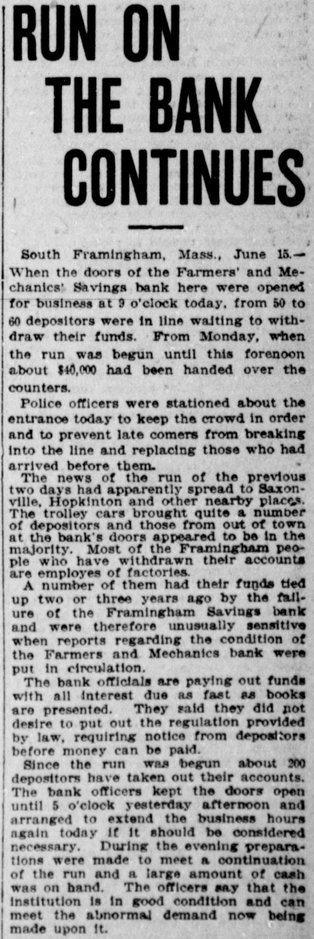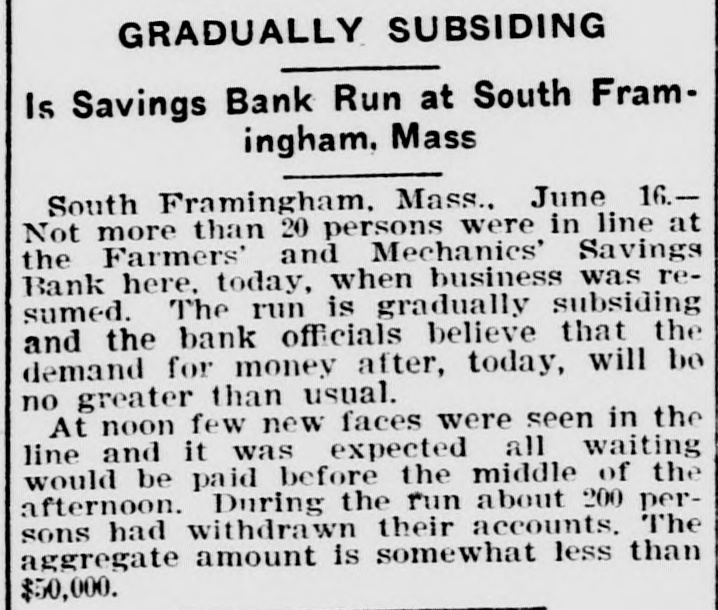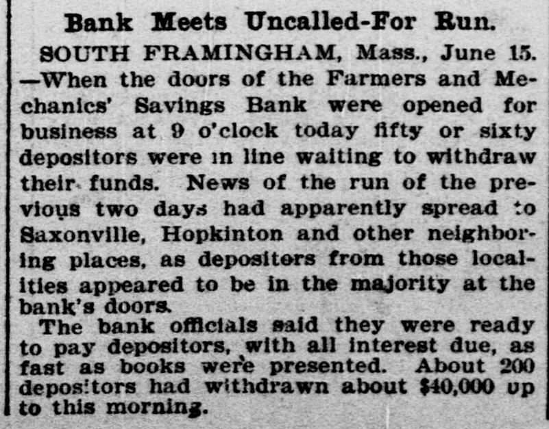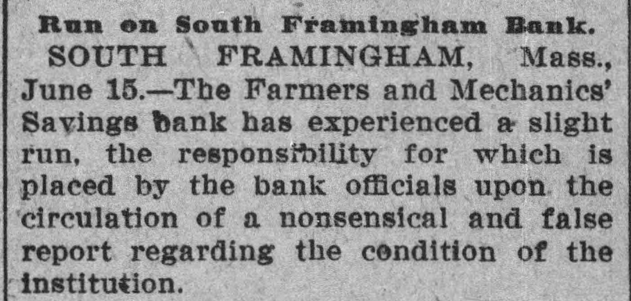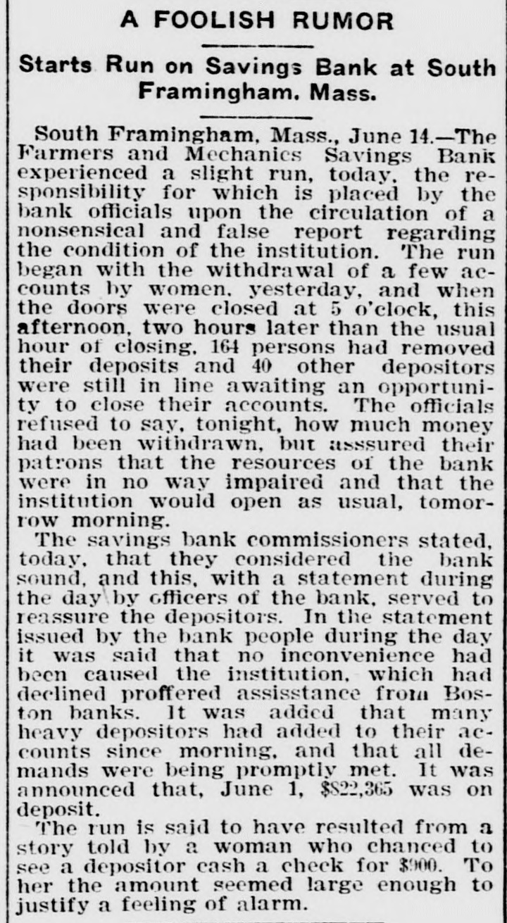 A FOOLISH RUMOR Starts Run on Savings Bank at South Framingham. Mass. South Framingham, Mass., June 14.-The Farmers and Mechanics Savings Bank experienced a slight run, today. the responsibility for which is placed by the bank officials upon the circulation of a nonsensical and false report regarding the condition of the institution. The run began with the withdrawal of a few accounts by women. yesterday, and when the doors were closed at 5 o'clock, this afternoon, two hours later than the usual hour of closing. 164 persons had removed their deposits and 40 other depositors were still in line awaiting an opportunity to close their accounts. The officials refused to say, tonight, how much money had been withdrawn, but asssured their patrons that the resources of the bank were in no way impaired and that the institution would open as usual, tomorrow morning. The savings bank commissioners stated, today. that they considered the bank sound, and this, with a statement during the day\ by officers of the bank, served to reassure the depositors. In the statement issued by the bank people during the day it was said that no inconvenience had been caused the institution, which had declined proffered assisstance from Boston banks. It was added that many heavy depositors had added to their accounts since morning, and that all demands were being promptly met. It was announced that, June 1, $822,365 was on deposit. The run is said to have resulted from a story told by a woman who chanced to see a depositor cash a check for $900. To her the amount seemed large enough to justify a feeling of alarm.