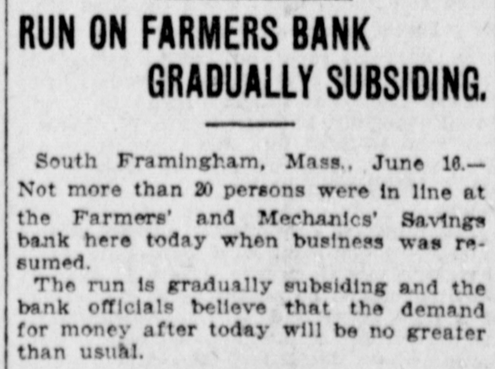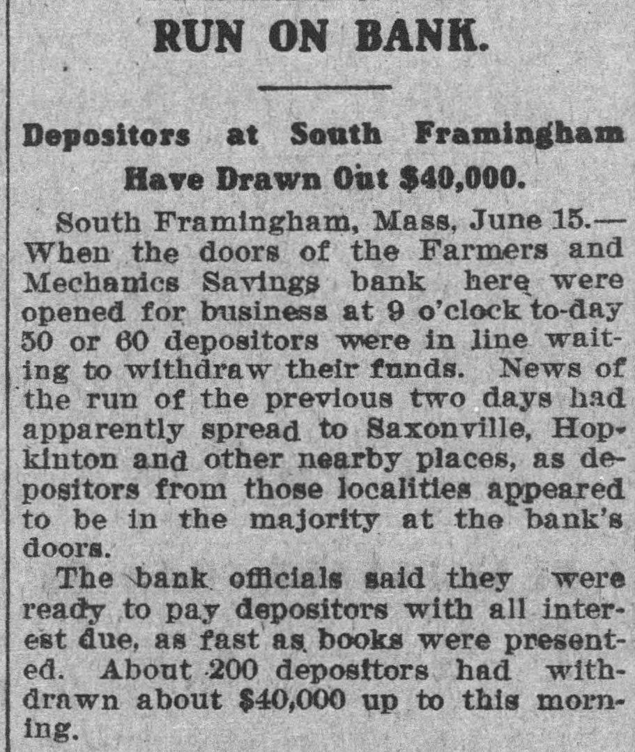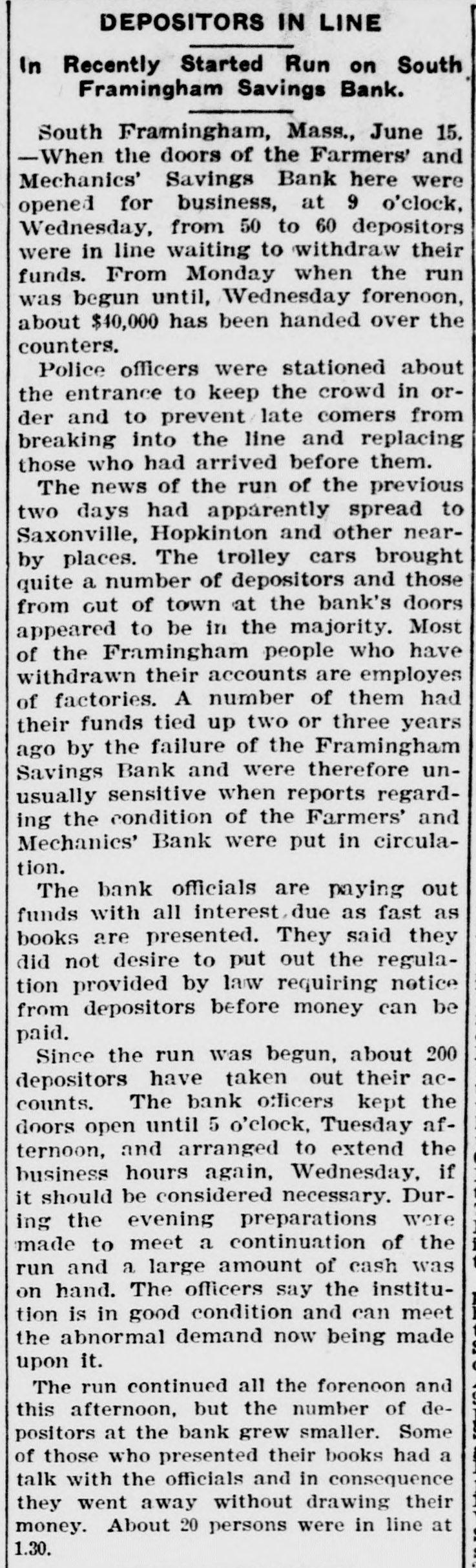 A FOOLISH RUMOR Starts Run on Savings Bank at South Framingham. Mass. South Framingham, Mass., June 14.-The Farmers and Mechanics Savings Bank experienced a slight run, today. the responsibility for which is placed by the bank officials upon the circulation of a nonsensical and false report regarding the condition of the institution. The run began with the withdrawal of a few accounts by women. yesterday, and when the doors were closed at 5 o'clock, this afternoon, two hours later than the usual hour of closing. 164 persons had removed their deposits and 40 other depositors were still in line awaiting an opportunity to close their accounts. The officials refused to say, tonight, how much money had been withdrawn, but asssured their patrons that the resources of the bank were in no way impaired and that the institution would open as usual, tomorrow morning. The savings bank commissioners stated, today. that they considered the bank sound, and this, with a statement during the day\ by officers of the bank, served to reassure the depositors. In the statement issued by the bank people during the day it was said that no inconvenience had been caused the institution, which had declined proffered assisstance from Boston banks. It was added that many heavy depositors had added to their accounts since morning, and that all demands were being promptly met. It was announced that, June 1, $822,365 was on deposit. The run is said to have resulted from a story told by a woman who chanced to see a depositor cash a check for $900. To her the amount seemed large enough to justify a feeling of alarm.