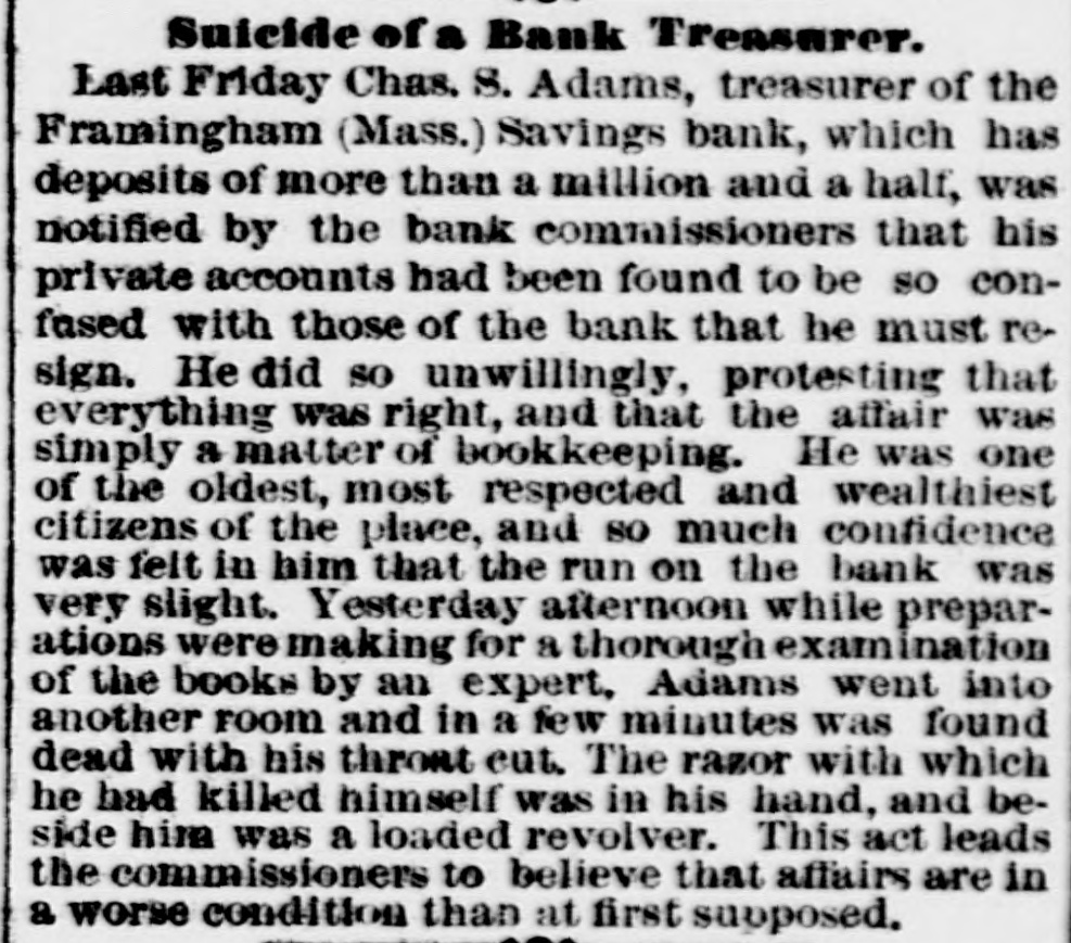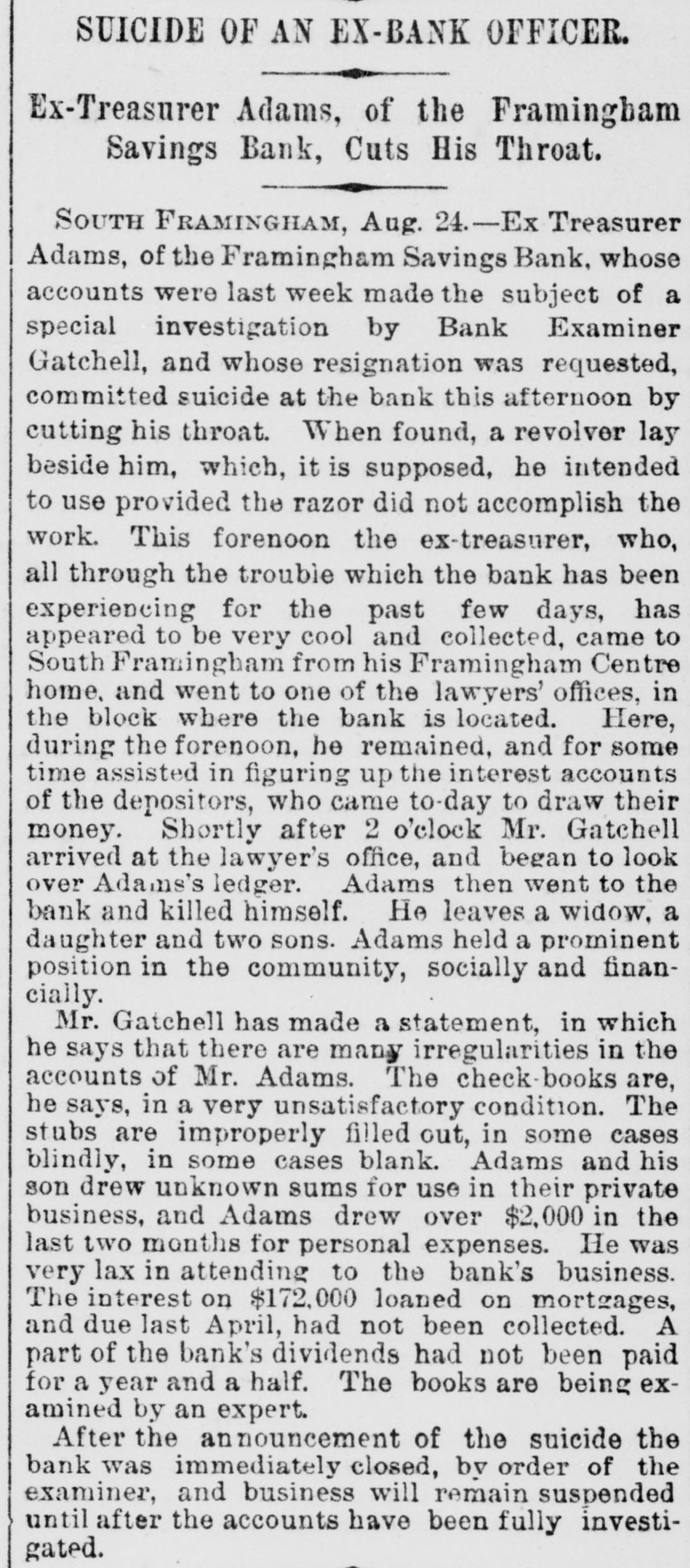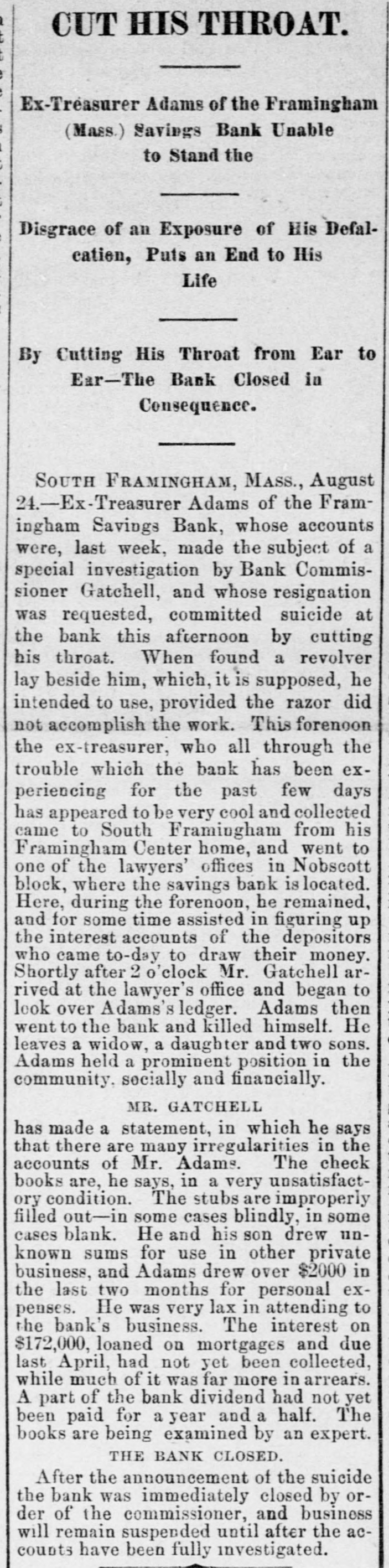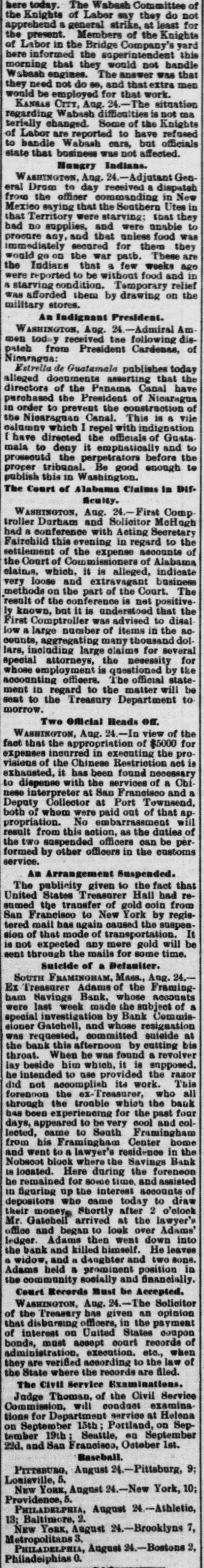 here today. The Wabash Committee of the Knights of Laber say they do not apprehend a general strike, at least for the present. Members of the Knights of Labor in the Bridge Company's yard here informed the superintendent this morning that they would not bandle Wabash engines. The answer was that they need not do so, and that extra men would be employed for that work. KANSAS CITY, Aug. 24.-The situation regarding Wabash difficulties is not ma terially changed. Some of the Knights of Labor are reported to have refused to bandle Wabash cars, but officials state that business was not affected. Hungry Indians. WASHINGTON, Ang. 24.-Adjutant General Drom to day received a dispateh from the officer commanding in New Mexico saying that the Southern Utes in that Territory were starving; that they bad no supplies, and were unable to procure any, and that unless food was immediately secured for them they would go on the war patb. These are the Indians that 8 few weeks age were reported to be without food and in a starving condition. Temporary relief was afforded them by drawing on the military stores. An Indignant President. WASHINGTON, Aug. 24.-Admiral Am men today received the following diepateh from President Cardenas, of Nioaragua: Estrella de Guatamala publishes today alleged documents asserting that the directors of the Panama Canal have purchased the President of Nicaragua in order to prevent the construction of the Nicaraguan Canal. This in & vile oslumny which I repel with indignation 1 have directed the efficials of Gusta mala to deny it emphatically and to prosecutd the perpetrators before the proper tribunal. Be good enough to publish this in Washington. The Court of Alabama Claims in Dif. ficulty. WASHINGTON, Aug. 24.-First Comp troller Durham and Solicitor McHogh had a conference with Acting Secretary Fairehild this evening in regard to the settlement of the expense accounts of the Court of Commissioners of Alabama claims, which. it is alleged, indicate very loose and extravagant business methods on the part of the Court. The result of the conference is net positive. ly known, but it is understood that the First Comptroller was advised to disal low a large number of items in the aocounts, aggregating many thousand dollars, including large claims for several special attorneys, the necessity for whose employment is questioned by the accounting officers. The official statement in regard to the matter will be sent to the Treasury Department to morrow. Two Official Heads off. WASHINGTON, Aug. 24.-In view of the fact that the appropriation of $5000 for expenses incurred in executing the provisions of the Ohinese Restriction act is exhausted, it has been found necessary to dispense with the services of a Chi nese interpreter at San Francisco and a Deputy Collector at Port Townsend, both of whom were paid out of that appropriation. No embarrassment will result from this action, as the duties of the two suspended officers can be performed by other officers in the customs service. An Arrangement Suspended. The publicity given to the fact that United States Treasurer Hall had resumed the transfer of gold coin from San Francisco to New York by registered mail has again caused the suspeasion of that mode of transportation. It is not expected any mere gold will be sent through the mails for some time. Suicide of a Defaniter. SOUTH FRAMINGHAM, Mass., Aug. 24.Ex Treasurer Adams of the Framingham Savings Bank. whose accounts were last week made the subject of 8 special investigation by Bank Commissioner Gatchell, and whose resignation was requested, committed suiside at the bank this afternoon by outting bis throat. When he was found a revolver lay beside him which, it is supposed. he intended to use provided the razor did not accomplish its work. This forenoon the ex-Treasurer, who all through the tronble which the bank bas been experiencing for the past four days, appeared to be very cool and collected, came to Seuth Framingham from his Framingham Center home and went to a lawyer's residence in the Nobscot blook where the Savings Bank IN located. Here during the foreneon be remained for some time. and assisted in figuring up the interest accounts of depositors who came today to draw their money. Shortly after 2 o'clock Mr. Gatebell arrived at the lawyer's office and began to look over Adams' ledger. Adams then went down into the bank and killed himself. He leaves a widow, and a daughter and two sons. Adams held a prominent position in the community socially and financially. Court Records Bust be Accepted. WASHINGTON, Aug. 24.-The Solicitor of the Treasury bas given an opinion that disbursing officers, in the payment of interest on United States coupon bonds, must accept court records of administration. execution. etc., when they are verified according to the law of the State where the records are filed. The Civil Service Examinations. Judge Thoman, of the Civil Service Commission. will conduct examina. tions for Department service at Helena on September 15th Portland, on September 19th Seattle, en September 22d. and San Francisco, Ostober 1st. Baseball. PITTSBURG, August 24.-Pittsburg, 9; Lonisville, 5. New YORK, August 24.-New York, 10; Providence, 5. PHILADELPHIA, August 24.-Athletic, 13; Baltimore, 2. NEW York, August 24.-Brooklyns 7, Metropolitans 3. PHILADELPHIA, August 24.-Bostons 2, Philadeiphias 0.