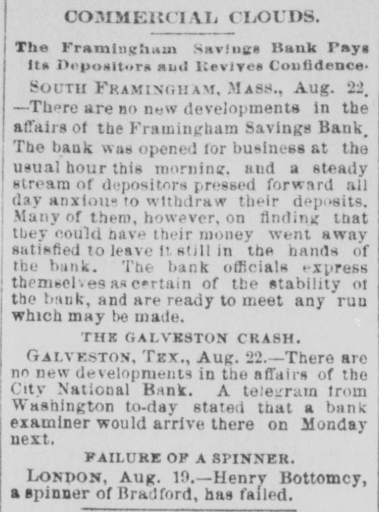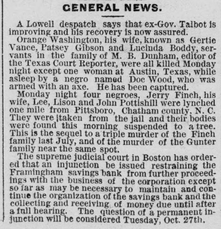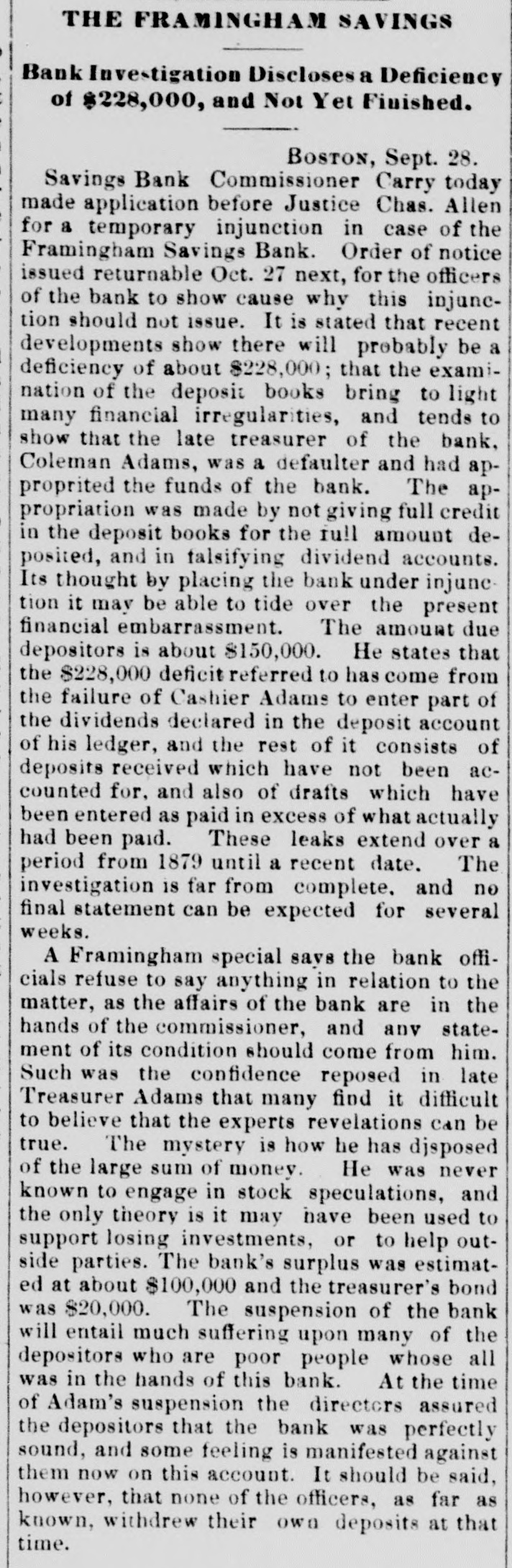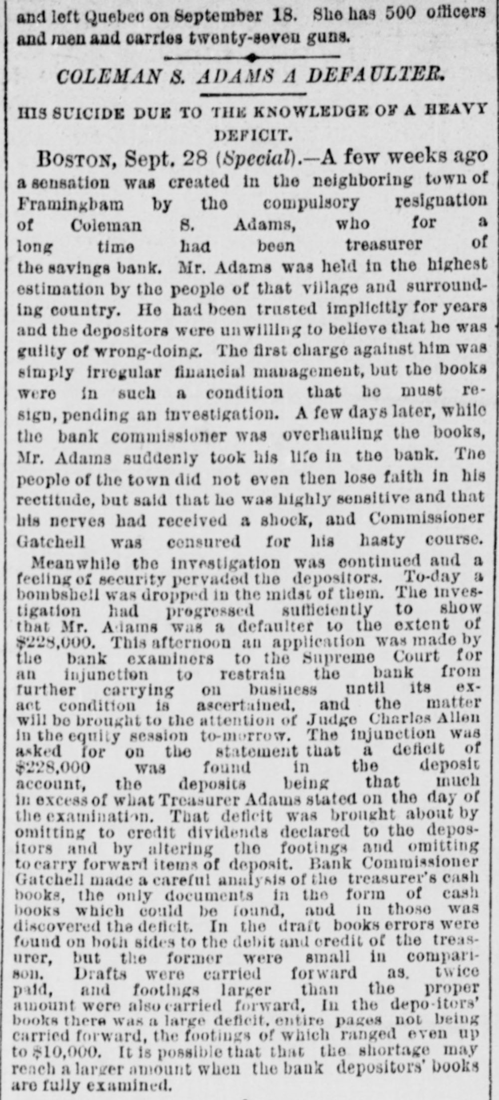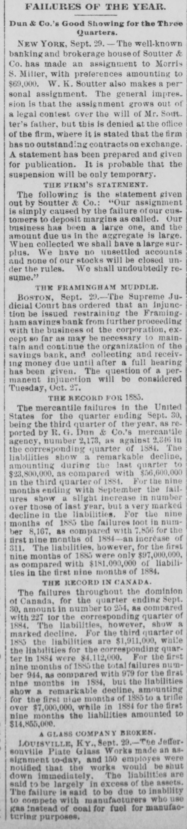 here today. The Wabash Committee of the Knights of Laber say they do not apprehend a general strike, at least for the present. Members of the Knights of Labor in the Bridge Company's yard here informed the superintendent this morning that they would not bandle Wabash engines. The answer was that they need not do so, and that extra men would be employed for that work. KANSAS CITY, Aug. 24.-The situation regarding Wabash difficulties is not ma terially changed. Some of the Knights of Labor are reported to have refused to bandle Wabash cars, but officials state that business was not affected. Hungry Indians. WASHINGTON, Ang. 24.-Adjutant General Drom to day received a dispateh from the officer commanding in New Mexico saying that the Southern Utes in that Territory were starving; that they bad no supplies, and were unable to procure any, and that unless food was immediately secured for them they would go on the war patb. These are the Indians that 8 few weeks age were reported to be without food and in a starving condition. Temporary relief was afforded them by drawing on the military stores. An Indignant President. WASHINGTON, Aug. 24.-Admiral Am men today received the following diepateh from President Cardenas, of Nioaragua: Estrella de Guatamala publishes today alleged documents asserting that the directors of the Panama Canal have purchased the President of Nicaragua in order to prevent the construction of the Nicaraguan Canal. This in & vile oslumny which I repel with indignation 1 have directed the efficials of Gusta mala to deny it emphatically and to prosecutd the perpetrators before the proper tribunal. Be good enough to publish this in Washington. The Court of Alabama Claims in Dif. ficulty. WASHINGTON, Aug. 24.-First Comp troller Durham and Solicitor McHogh had a conference with Acting Secretary Fairehild this evening in regard to the settlement of the expense accounts of the Court of Commissioners of Alabama claims, which. it is alleged, indicate very loose and extravagant business methods on the part of the Court. The result of the conference is net positive. ly known, but it is understood that the First Comptroller was advised to disal low a large number of items in the aocounts, aggregating many thousand dollars, including large claims for several special attorneys, the necessity for whose employment is questioned by the accounting officers. The official statement in regard to the matter will be sent to the Treasury Department to morrow. Two Official Heads off. WASHINGTON, Aug. 24.-In view of the fact that the appropriation of $5000 for expenses incurred in executing the provisions of the Ohinese Restriction act is exhausted, it has been found necessary to dispense with the services of a Chi nese interpreter at San Francisco and a Deputy Collector at Port Townsend, both of whom were paid out of that appropriation. No embarrassment will result from this action, as the duties of the two suspended officers can be performed by other officers in the customs service. An Arrangement Suspended. The publicity given to the fact that United States Treasurer Hall had resumed the transfer of gold coin from San Francisco to New York by registered mail has again caused the suspeasion of that mode of transportation. It is not expected any mere gold will be sent through the mails for some time. Suicide of a Defaniter. SOUTH FRAMINGHAM, Mass., Aug. 24.Ex Treasurer Adams of the Framingham Savings Bank. whose accounts were last week made the subject of 8 special investigation by Bank Commissioner Gatchell, and whose resignation was requested, committed suiside at the bank this afternoon by outting bis throat. When he was found a revolver lay beside him which, it is supposed. he intended to use provided the razor did not accomplish its work. This forenoon the ex-Treasurer, who all through the tronble which the bank bas been experiencing for the past four days, appeared to be very cool and collected, came to Seuth Framingham from his Framingham Center home and went to a lawyer's residence in the Nobscot blook where the Savings Bank IN located. Here during the foreneon be remained for some time. and assisted in figuring up the interest accounts of depositors who came today to draw their money. Shortly after 2 o'clock Mr. Gatebell arrived at the lawyer's office and began to look over Adams' ledger. Adams then went down into the bank and killed himself. He leaves a widow, and a daughter and two sons. Adams held a prominent position in the community socially and financially. Court Records Bust be Accepted. WASHINGTON, Aug. 24.-The Solicitor of the Treasury bas given an opinion that disbursing officers, in the payment of interest on United States coupon bonds, must accept court records of administration. execution. etc., when they are verified according to the law of the State where the records are filed. The Civil Service Examinations. Judge Thoman, of the Civil Service Commission. will conduct examina. tions for Department service at Helena on September 15th Portland, on September 19th Seattle, en September 22d. and San Francisco, Ostober 1st. Baseball. PITTSBURG, August 24.-Pittsburg, 9; Lonisville, 5. New YORK, August 24.-New York, 10; Providence, 5. PHILADELPHIA, August 24.-Athletic, 13; Baltimore, 2. NEW York, August 24.-Brooklyns 7, Metropolitans 3. PHILADELPHIA, August 24.-Bostons 2, Philadeiphias 0.