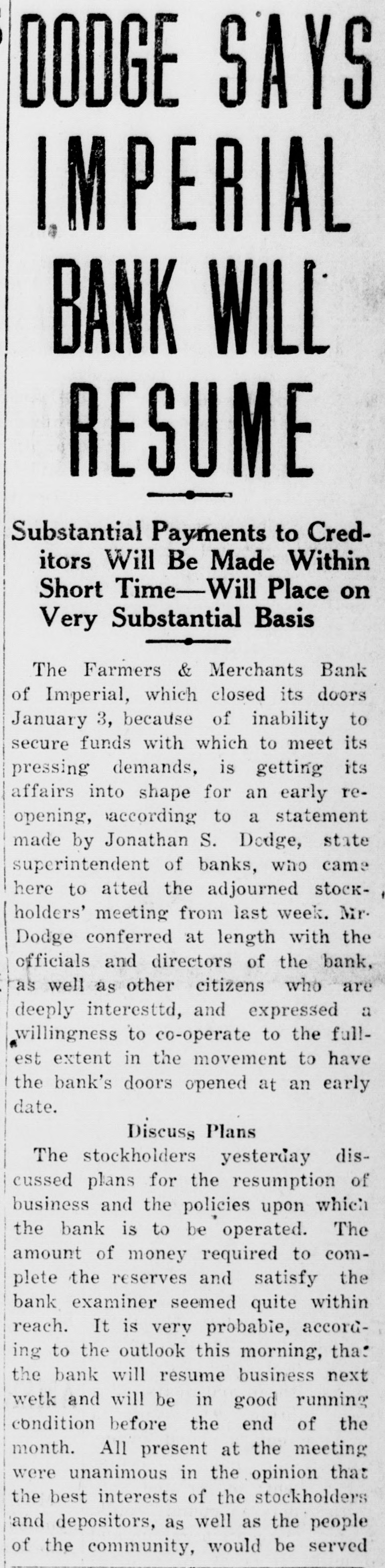 DODGE SAYS IMPERIAL BANK WILL R. RESUME Substantial Payments to Creditors Will Be Made Within Short Time-Will Place on Very Substantial Basis The Farmers & Merchants Bank of Imperial, which closed its doors January 3, because of inability to secure funds with which to meet its pressing demands, is getting its affairs into shape for an early reopening, according to a statement made by Jonathan S. Dodge, state superintendent of banks, who came here to atted the adjourned stockholders' meeting from last week. Mr. Dodge conferred at length with the officials and directors of the bank, as well as other citizens who are deeply interesttd, and expressed a willingness to co-operate to the fullest extent in the movement to have the bank's doors opened at an early date. Discuss Plans The stockholders yesterday discussed plans for the resumption of business and the policies upon which the bank is to be operated. The amount of money required to complete the reserves and satisfy the bank examiner seemed quite within reach. It is very probable, according to the outlook this morning, that the bank will resume business next wetk and will be in good running condition before the end of the month. All present at the meeting were unanimous in the opinion that the best interests of the stockholders and depositors, as well as the people of the community, would be served