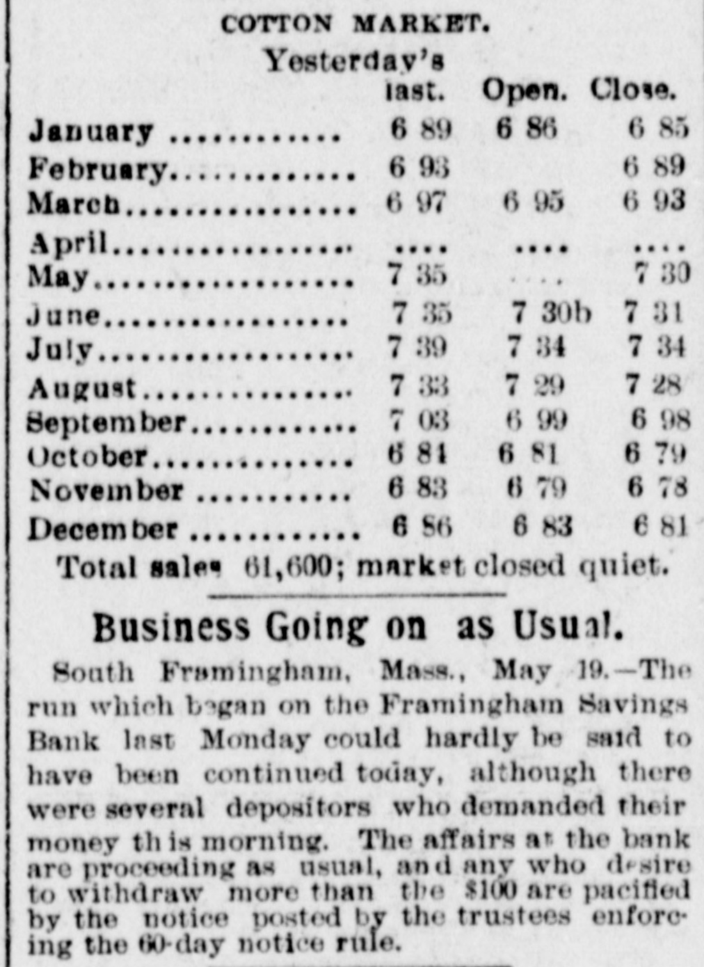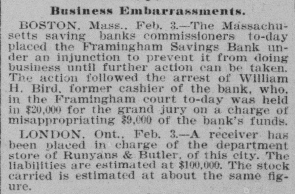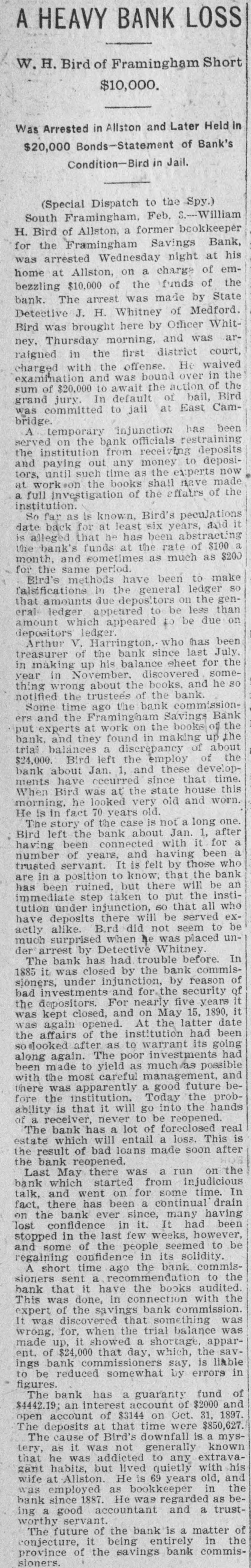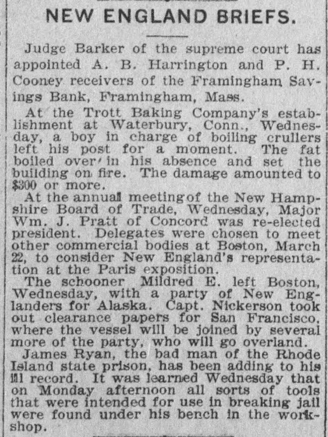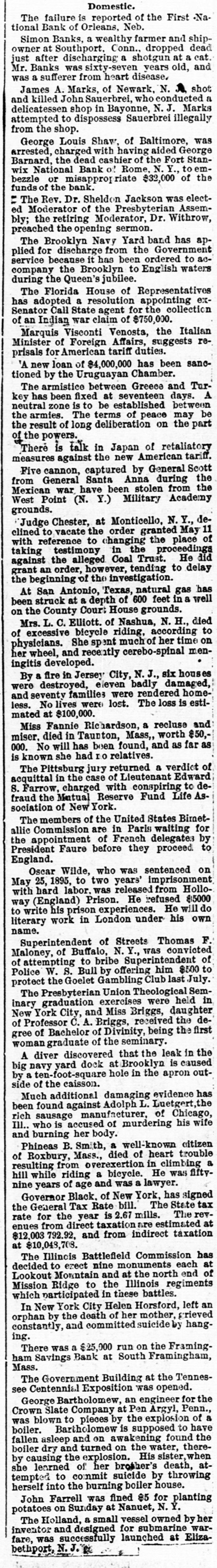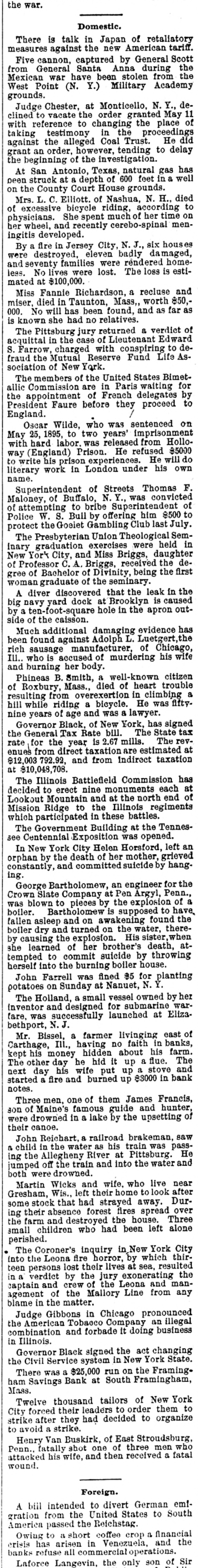 the war. Domestic. There is talk in Japan of retaliatory measures against the new American tariff. Five cannon, captured by General Scott from General Santa Anna during the Mexican war have been stolen from the West Point (N. Y.) Military Academy grounds. Judge Chester, at Monticello, N. Y., declined to vacate the order granted May 11 with reference to changing the place of taking testimony in the proceedings against the alleged Coal Trust. He did grant an order, however, tending to delay the beginning of the investigation. At San Antonio, Texas, natural gas has Deen struck at a depth of 600 feet in a well on the County Court House grounds. Mrs. L. C. Elliott. of Nashua, N. H., died of excessive bicycle riding, according to physicians. She spent much of her time on her wheel, and recently cerebo-spinal meningitis developed. By a fire in Jersey City, N. J., six houses were destroyed, eleven badly damaged, and seventy families were rendered homeless. No lives were lost. The loss is estimated at $100,000. Miss Fannie Richardson, a recluse and miser, died in Taunton, Mass, worth 850,000. No will has been found, and as far as is known she had no relatives. The Pittsburg jury returned a verdict of acquittal in the case of Lieutenant Edward S. Farrow, charged with conspiring to defraud the Mutual Reserve Fund Life Association of New York. The members of the United States Bimetallic Commission are in Paris waiting for the appointment of French delegates by President Faure before they proceed to England. Oscar Wilde, who was sentenced on May 25, 1895, to two years' imprisonment with hard labor. was released from Holloway (England) Prison. He refused $5000 to write his prison experiences. He will do literary work in London under his own name. Superintendent of Streets Thomas F. Maloney, of Buffalo, N. Y., was convicted of attempting to bribe Superintendent of Police W. S. Bull by offering him $500 to protect the Goeiet Gambling Club last July. The Presbyterian Union Theological SemInary graduation exercises were held in New York City, and Miss Briggs, daughter of Professor C. A. Briggs, received the degree of Bachelor of Divinity, being the first woman graduate of the seminary. A diver discovered that the leak in the big navy yard dock at Brooklyn is caused by a ten-foot-square hole in the apron outside of the caisson. Much additional damaging evidence has been found against Adolph L. Luetgert,the rich sausage manufacturer, of Chicago, Ill.. who is accused of murdering his wife and burning her body. Phineas B. Smith, a well-known citizen of Roxbury, Mass., died of heart trouble resulting from overexertion in climbing a hill while riding a bicycle. He was fiftynine years of age and was a lawyer. Governor Black, of New York, has signed the General Tax Rate bill. The State tax rate for the year is 2.67 mills. The revenues from direct taxation are estimated at $12,003 792.92, and from indirect taxation at $10,048,708. The Illinois Battlefield Commission has decided to erect nine monuments each at Lookout Mountain and at the north end of Mission Ridge to the Illinois regiments which participated in these battles. The Government Building at the Tennessee Centennial Exposition was opened. In New York City Helen Horsford, left an orphan by the death of her mother, grieved constantly, and committed suicide by hanging. George Bartholomew, an engineer for the Crown Slate Company at Pen Argyl, Penn., was blown to pieces by the explosion of a boiler. Bartholomew is supposed to have. fallen asleep and on awakening found the boiler dry and turned on the water, thereby causing the explosion. His sister, when she learned of her brother's death, attempted to commit suicide by throwing herself into the burning boiler house. John Farrell was fined 85 for planting potatoes on Sunday at Nanuet, N. Y. The Holland, a small vessel owned by her inventor and designed for submarine warfare, was successfully launched at Elizabethport, N.J. Mr. Bissel, a farmer livinging east of Carthage, III., having no faith in banks, kept his money hidden about his farm. The other day he hid it up a flue. The next day his wife put up a stove and started a fire and burned up 83000 in bank notes. Three men, one of them James Francis, son of Maine's famous guide and hunter, were drowned in a lake by the upsetting of their canoe. John Reichart, a railroad brakeman, saw a child in the water as his train was passing the Allegheny River at Pittsburg. He jumped off the train and into the water and both were drowned. Martin Wicks and wife, who live near Gresham, Wis., left their home to look after some stock that had strayed away. During their absence forest fires spread over the farm and destroyed the house. Three small children who had been left alone perished. The Coroner's inquiry in New York City into the Leona fire horror, by which thirteen persons lost their lives at sea, resulted in a verdict by the jury exonerating the captain and crew of the Leona and management of the Mallory Line from any blame in the matter. Judge Gibbons in Chicago pronounced the American Tobacco Company an illegal combination and forbade it doing business in Illinois. Governor Black signed the act changing the Civil Service system in New York State. There was a $25,000 run on the Framingham Savings Bank at South Framingham, Mass. Twelve thousand tailors of New York City forced their leaders to order them to strike after they had decided to organize to avoid a strike. Henry Van Buskirk, of East Stroudsburg, Penn., fatally shot one of three men who attacked his wife, and then received a fatal wound. Foreign. A bill intended to divert German emigration from the United States to South America passed the Reichstag. Owing to a short coffee crop a financial crisis has arisen in Venezuela, and the banks refuse all commercialoperations. Laforce Langevin, the only son of Sir