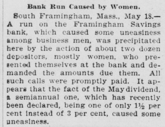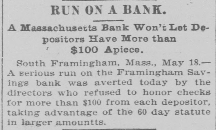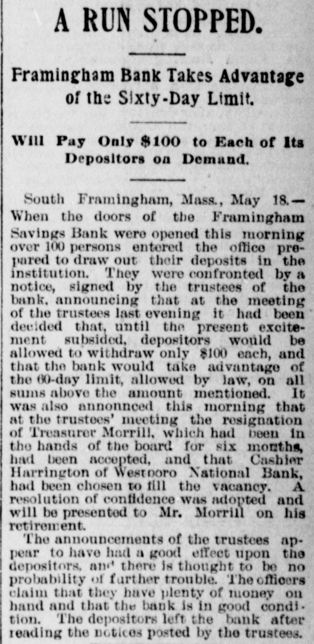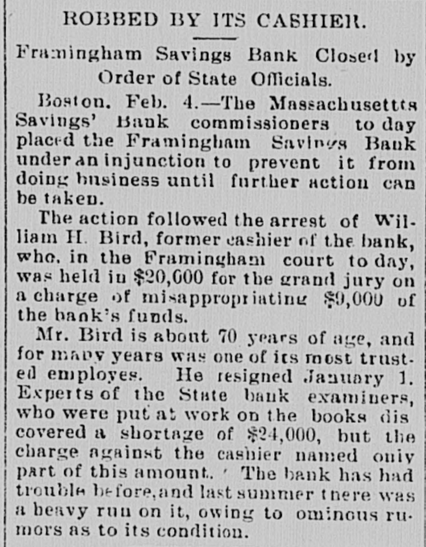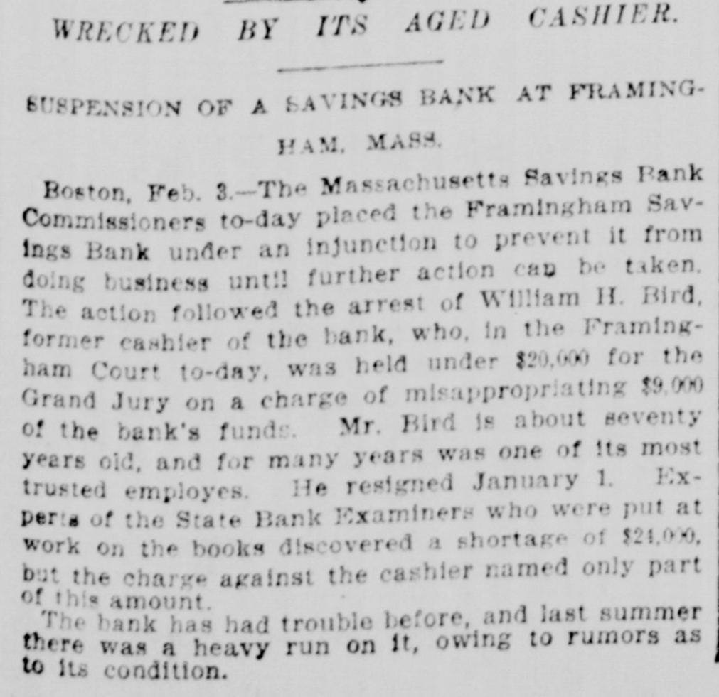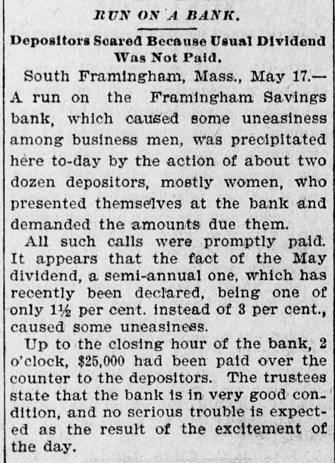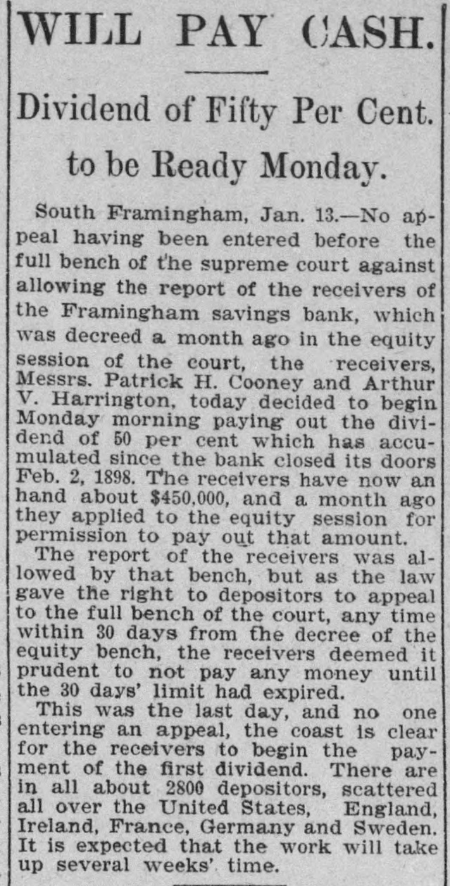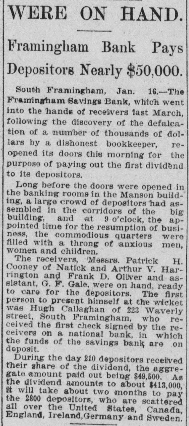 the war. Domestic. There is talk in Japan of retaliatory measures against the new American tariff. Five cannon, captured by General Scott from General Santa Anna during the Mexican war have been stolen from the West Point (N. Y.) Military Academy grounds. Judge Chester, at Monticello, N. Y., declined to vacate the order granted May 11 with reference to changing the place of taking testimony in the proceedings against the alleged Coal Trust. He did grant an order, however, tending to delay the beginning of the investigation. At San Antonio, Texas, natural gas has Deen struck at a depth of 600 feet in a well on the County Court House grounds. Mrs. L. C. Elliott. of Nashua, N. H., died of excessive bicycle riding, according to physicians. She spent much of her time on her wheel, and recently cerebo-spinal meningitis developed. By a fire in Jersey City, N. J., six houses were destroyed, eleven badly damaged, and seventy families were rendered homeless. No lives were lost. The loss is estimated at $100,000. Miss Fannie Richardson, a recluse and miser, died in Taunton, Mass, worth 850,000. No will has been found, and as far as is known she had no relatives. The Pittsburg jury returned a verdict of acquittal in the case of Lieutenant Edward S. Farrow, charged with conspiring to defraud the Mutual Reserve Fund Life Association of New York. The members of the United States Bimetallic Commission are in Paris waiting for the appointment of French delegates by President Faure before they proceed to England. Oscar Wilde, who was sentenced on May 25, 1895, to two years' imprisonment with hard labor. was released from Holloway (England) Prison. He refused $5000 to write his prison experiences. He will do literary work in London under his own name. Superintendent of Streets Thomas F. Maloney, of Buffalo, N. Y., was convicted of attempting to bribe Superintendent of Police W. S. Bull by offering him $500 to protect the Goeiet Gambling Club last July. The Presbyterian Union Theological SemInary graduation exercises were held in New York City, and Miss Briggs, daughter of Professor C. A. Briggs, received the degree of Bachelor of Divinity, being the first woman graduate of the seminary. A diver discovered that the leak in the big navy yard dock at Brooklyn is caused by a ten-foot-square hole in the apron outside of the caisson. Much additional damaging evidence has been found against Adolph L. Luetgert,the rich sausage manufacturer, of Chicago, Ill.. who is accused of murdering his wife and burning her body. Phineas B. Smith, a well-known citizen of Roxbury, Mass., died of heart trouble resulting from overexertion in climbing a hill while riding a bicycle. He was fiftynine years of age and was a lawyer. Governor Black, of New York, has signed the General Tax Rate bill. The State tax rate for the year is 2.67 mills. The revenues from direct taxation are estimated at $12,003 792.92, and from indirect taxation at $10,048,708. The Illinois Battlefield Commission has decided to erect nine monuments each at Lookout Mountain and at the north end of Mission Ridge to the Illinois regiments which participated in these battles. The Government Building at the Tennessee Centennial Exposition was opened. In New York City Helen Horsford, left an orphan by the death of her mother, grieved constantly, and committed suicide by hanging. George Bartholomew, an engineer for the Crown Slate Company at Pen Argyl, Penn., was blown to pieces by the explosion of a boiler. Bartholomew is supposed to have. fallen asleep and on awakening found the boiler dry and turned on the water, thereby causing the explosion. His sister, when she learned of her brother's death, attempted to commit suicide by throwing herself into the burning boiler house. John Farrell was fined 85 for planting potatoes on Sunday at Nanuet, N. Y. The Holland, a small vessel owned by her inventor and designed for submarine warfare, was successfully launched at Elizabethport, N.J. Mr. Bissel, a farmer livinging east of Carthage, III., having no faith in banks, kept his money hidden about his farm. The other day he hid it up a flue. The next day his wife put up a stove and started a fire and burned up 83000 in bank notes. Three men, one of them James Francis, son of Maine's famous guide and hunter, were drowned in a lake by the upsetting of their canoe. John Reichart, a railroad brakeman, saw a child in the water as his train was passing the Allegheny River at Pittsburg. He jumped off the train and into the water and both were drowned. Martin Wicks and wife, who live near Gresham, Wis., left their home to look after some stock that had strayed away. During their absence forest fires spread over the farm and destroyed the house. Three small children who had been left alone perished. The Coroner's inquiry in New York City into the Leona fire horror, by which thirteen persons lost their lives at sea, resulted in a verdict by the jury exonerating the captain and crew of the Leona and management of the Mallory Line from any blame in the matter. Judge Gibbons in Chicago pronounced the American Tobacco Company an illegal combination and forbade it doing business in Illinois. Governor Black signed the act changing the Civil Service system in New York State. There was a $25,000 run on the Framingham Savings Bank at South Framingham, Mass. Twelve thousand tailors of New York City forced their leaders to order them to strike after they had decided to organize to avoid a strike. Henry Van Buskirk, of East Stroudsburg, Penn., fatally shot one of three men who attacked his wife, and then received a fatal wound. Foreign. A bill intended to divert German emigration from the United States to South America passed the Reichstag. Owing to a short coffee crop a financial crisis has arisen in Venezuela, and the banks refuse all commercialoperations. Laforce Langevin, the only son of Sir