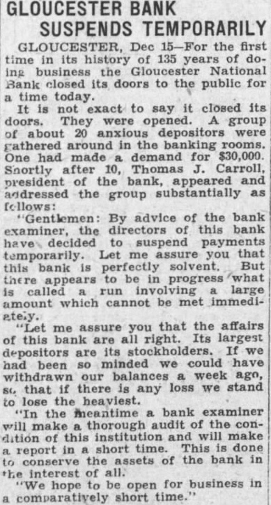GLOUCESTER BANK SUSPENDS TEMPORARILY GLOUCESTER, Dec the first time in its history of 135 of dobusiness the closed doors to the public for today exact to say it closed its were opened. group about depositors were gathered in the demand for Snortly Thomas Carroll, president of the appeared addressed the group substantially as follows: Gentlemen: By advice of the bank examiner, this bank temporarily. me you that But this solvent. be in progress called run large amount which cannot be immediately me that the affairs of this all largest are we depositors been minded we could had withdrawn our balances week ago, that there loss we stand the meantime bank examiner thorough of the condition this will make report in short time. done conserve of the bank in of hope be for business in