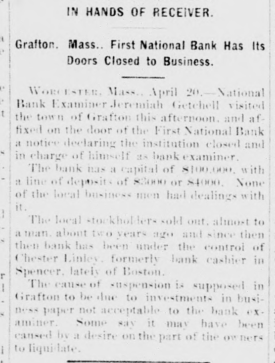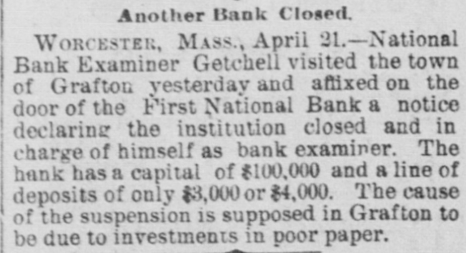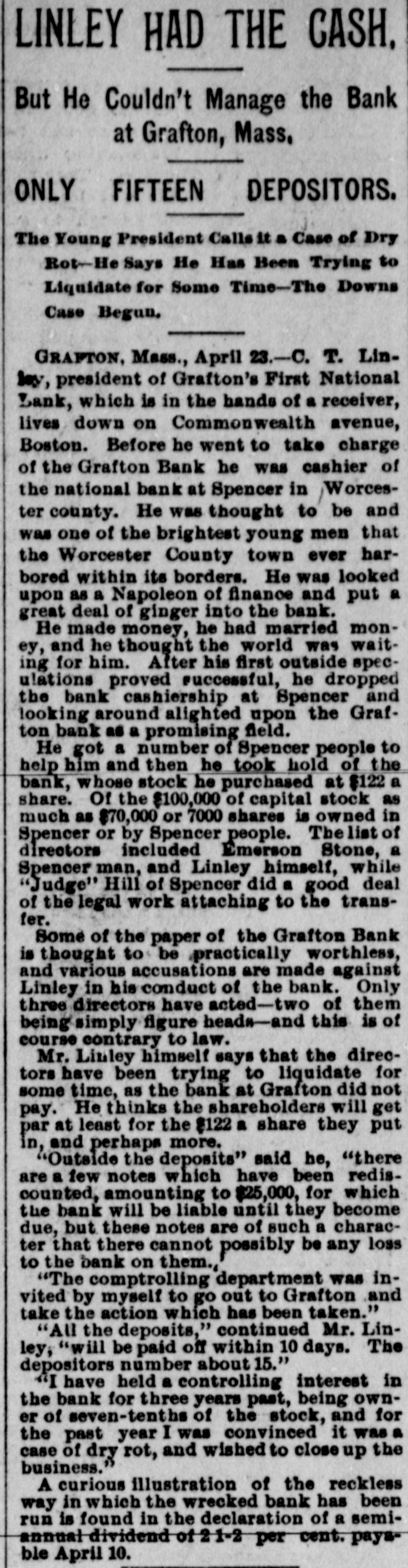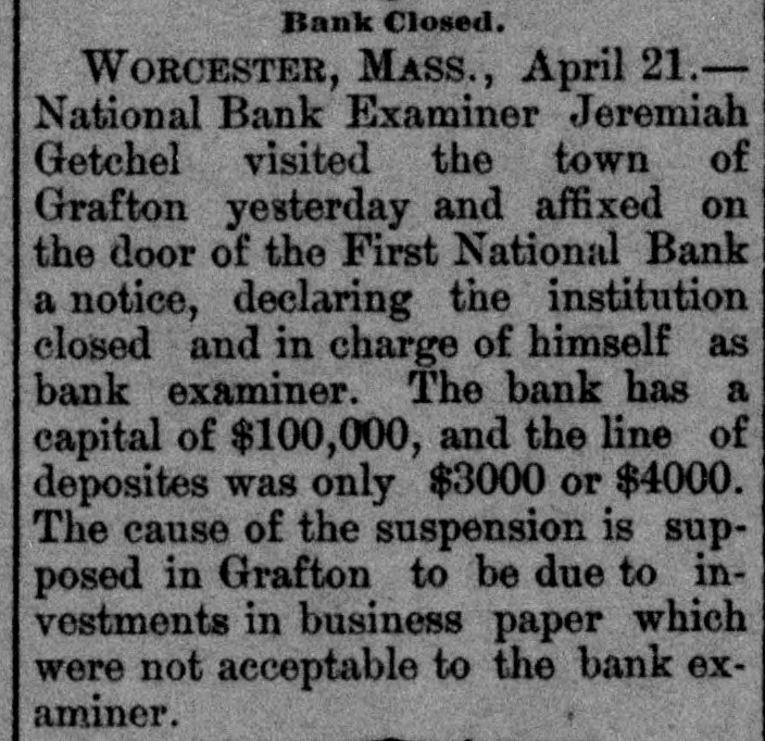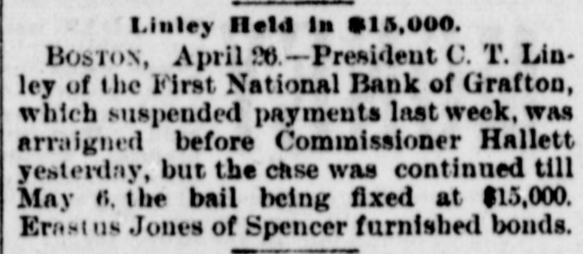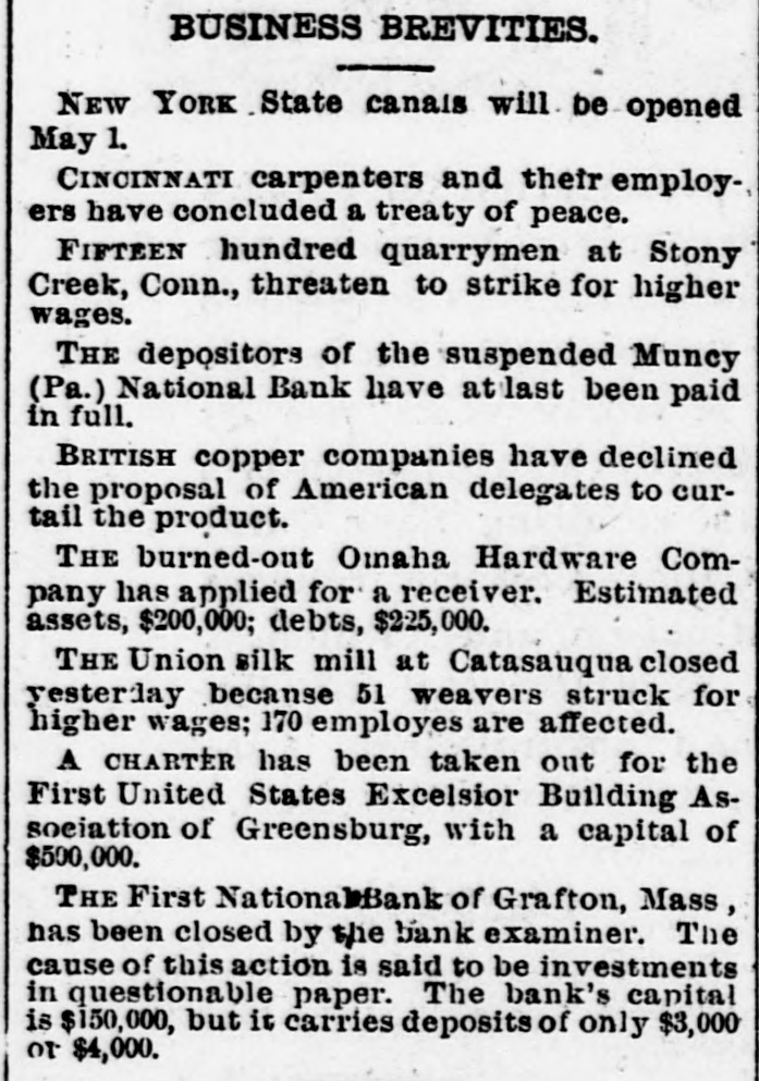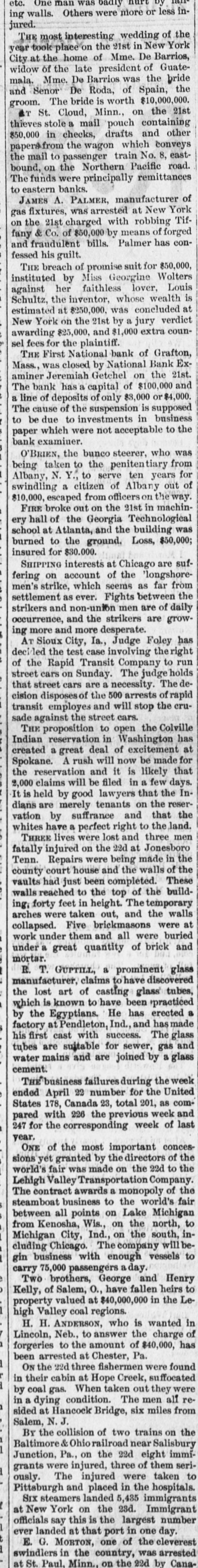 -TIRT &a 1JUU AIDRO SBM usur euo 010 ing walls. Others were more or less injured. THE most interesting wedding of the year took place on the 21st in New York City at the home of Mme. De Barrios, widow of the late president of Guatemala. Mme. De Barrios was the bride and Senor De Roda, of Spain, the groom. The bride is worth $10,000,000. AT St. Cloud, Minn., on the 21st thieves stole a mail pouch containing $50,000 in checks, drafts and other papersfrom the wagon which conveys the mail to passenger train No. 8, eastbound, on the Northern Pacific road. The funds were principally remittances to eastern banks. JAMES A. PALMER, manufacturer of gas fixtures, was arrested at New York on the 21st charged with robbing Tiffany & Co. of $50,000 by means of forged and fraudulent bills. Palmer has confessed his guilt. THE breach of promise suit for $50,000, instituted by Miss Georgine Wolters against her faithless lover, Louis Schultz, the inventor. whose wealth estimated at $250,000. was concluded New York on the 21st by a jury verdict awarding $25,000, and $1,000 extra counsel fees for the plaintiff. THE First National bank of Grafton, Mass., was closed by National Bank Examiner Jeremiah Getchel on the 21st. The bank has a capital of $100,000 and a line of deposits of only $3,000 or $4,000. The cause of the suspension is supposed to be due to investments in business paper which were not acceptable to the bank examiner. BRIEN, the bunco steerer, who being taken to the penitentiary from Albany, N. Y., to serve ten years swindling a citizen of Albany out of $10,000, escaped from officers on the way. FIRE broke out on the 21st in machinery hall of the Georgia Technological school at Atlanta, and the building burned to the ground. Loss, $50,000; insured for $30.000. SHIPPING interests at Chicago are fering on account of the 'longshoremen's strike, which seems as far settlement as ever. Fights between the strikers and non-union men are of daily occurrence, and the strikers are growing more and more desperate. AT Sioux City, Ia., Judge Foley deci led the test case involving the of the Rapid Transit Company to street cars on Sunday. The judge holds that street cars are a necessity. The decision disposesof the 500 arrests of rapid transit employes and will stop the sade against the street cars. THE proposition to open the Colville Indian reservation in Washington created a great deal of excitement Spokane. A rush will now be made for the reservation and it is likely that 2,000 claims will be filed in a few days. It is held by good lawyers that the dians are merely tenants on the vation by suffrance and that the whites have a perfect right to the land. THREE lives were lost and three fatally injured on the 22d at Jonesboro Tenn. Repairs were being made in the county court house and the walls of the vaults had just been completed. These walls reached to the top of the building, forty feet in height. The temporary arches were taken out, and the walls collapsed. Five brickmasons were work under them and all were buried under a great quantity of brick mortar. R. T. GUPTILL, a prominent glass manufacturer, claims to have discovered the lost art of casting glass tubes, which is known to have been practiced by the Egyptians. He has erected factory at Pendleton, Ind., and has his first cast with success. The tubes are suitable for sewer, gas water mains and are joined by a glass cement. THE business failures during the week ended April 22 number for the United States 178, Canada 23, total 201, as pared with 226 the previous week and 247 for the corresponding week of year. ONE of the most important conces sions yet granted by the directors of the world's fair was made on the 22d to the Lehigh Valley Transportation Company The contract awards a monopoly of steamboat business to the world's between all points on Lake Michigan from Kenosha, Wis., on the north, Michigan City, Ind., on the south, cluding Chicago. The company will begin business with enough vessels carry 75,000 passengers a day. Two brothers, George and Henry Kelly, of Salem, O., have fallen heirs property valued at $40,000,000 in the high Valley coal regions. H. H. ANDERSON, who is wanted Lincoln, Neb., to answer the charge forgeries to the amount of $40,000, been arrested at Chester, Pa. ON the 22d three fishermen were found in their cabin at Hope Creek, suffocated by coal gas. When taken out they in a dying condition. The men all sided at Hancock Bridge, six miles T N Salem By the collision of two trains on Baltimore & Ohiorailroad near Salisbury Junction, Pa., on the 22d eight grants were injured, three of them
