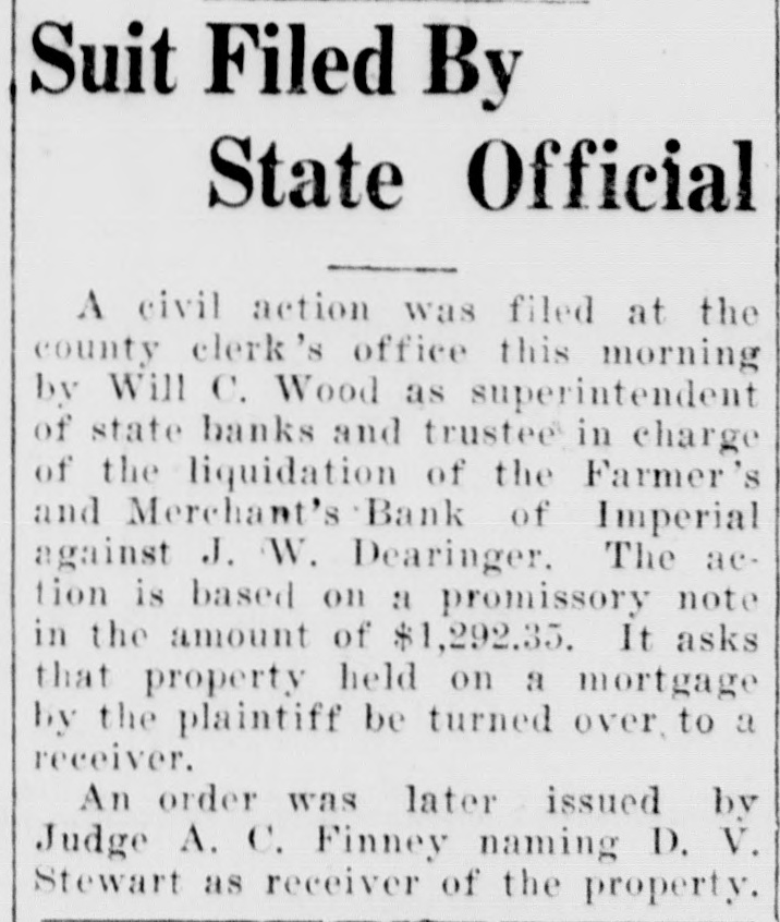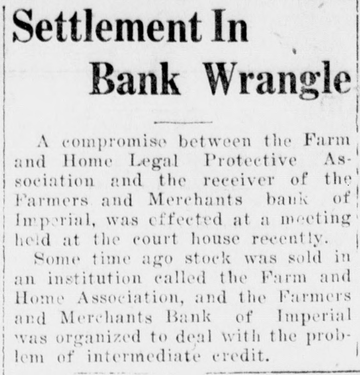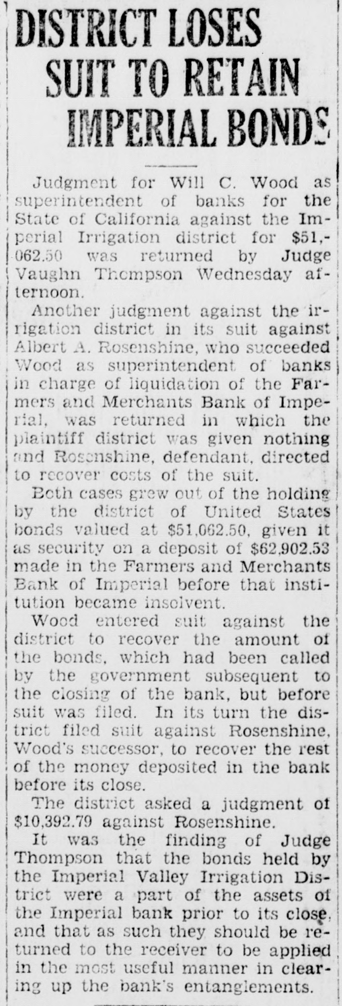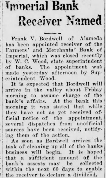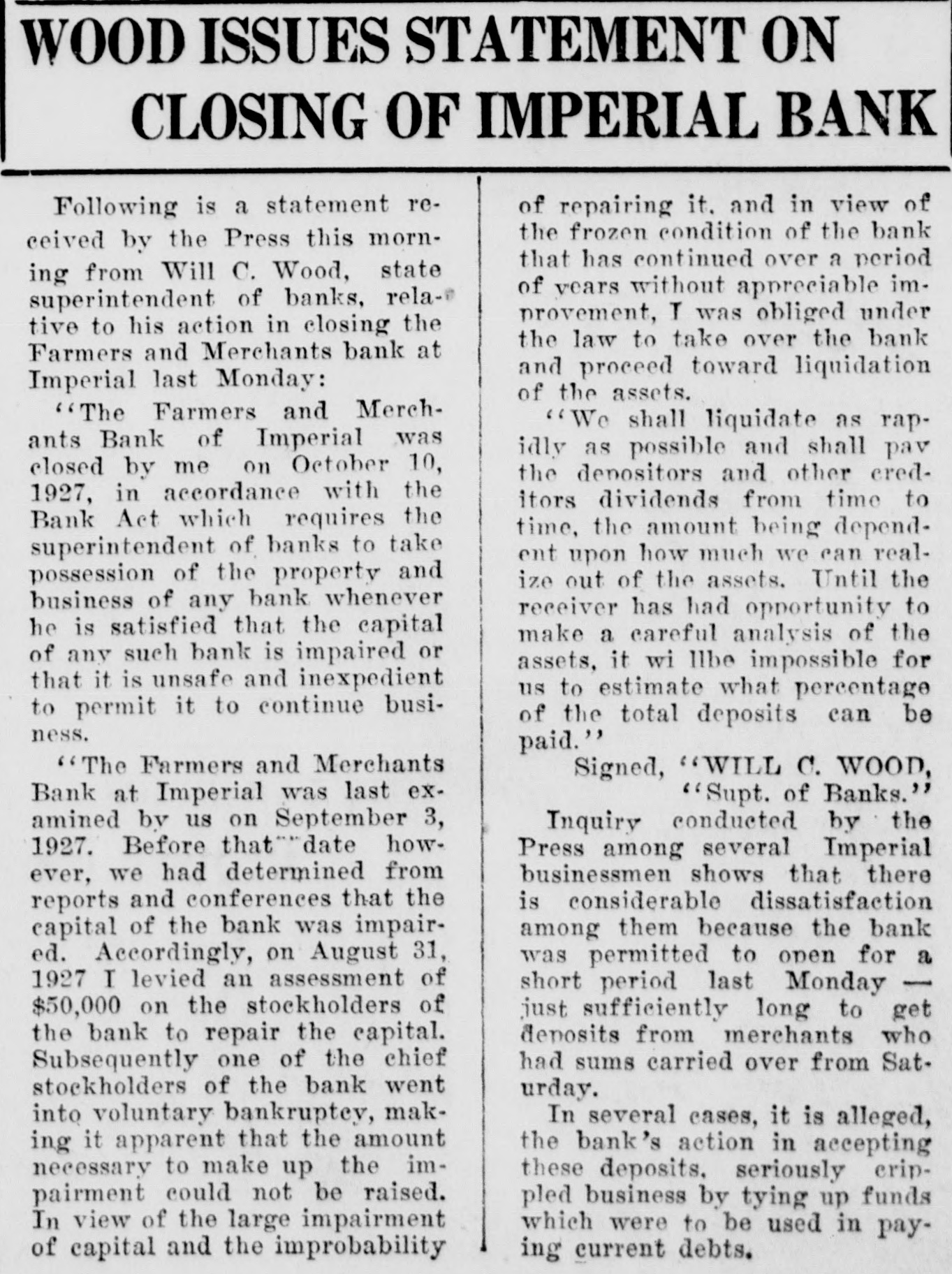 WOOD ISSUES STATEMENT ON CLOSING OF IMPERIAL BANK of repairing it. and in view of Following is a statement rethe frozen condition of the bank ceived by the Press this mornthat has continued over a period ing from Will C. Wood, state of years without appreciable imsuperintendent of banks, relaprovement, T was obliged under tive to his action in closing the the law to take over the bank Farmers and Merchants bank at and proceed toward liquidation Imperial last Monday: of the assets. "The Farmers and Merch"We shall liquidate as rapants Bank of Imperial was idly as possible and shall pav closed by me on October 10, the depositors and other cred1927, in accordance with the itors dividends from time to Bank Act which requires the time, the amount being dependsuperintendent of banks to take ent upon how much we can realpossession of the property and ize out of the assets. Until the business of any bank whenever receiver has had opportunity to he is satisfied that the capital make a careful analysis of the of any such bank is impaired or assets, it wi llbe impossible for that it is unsafe and inexpedient us to estimate what percentage to permit it to continue busiof the total deposits can be ness. paid." "The Farmers and Merchants Signed, WILL C. WOOD, Bank at Imperial was last ex"Supt. of Banks." amined by us on September 3, Inquiry conducted by the 1927. Before that date howPress among several Imperial businessmen shows that there ever, we had determined from is considerable dissatisfaction reports and conferences that the capital of the bank was impairamong them because the bank ed. Accordingly, on August 31, was permitted to open for a 1927 I levied an assessment of short period last Monday $50,000 on the stockholders of just sufficiently long to get deposits from merchants who the bank to repair the capital. had sums carried over from SatSubsequently one of the chief stockholders of the bank went furday. into voluntary bankruptey, makIn several cases, it is alleged, ing it apparent that the amount the bank's action in accepting necessary to make up the imthese deposits. seriously crippairment could not be raised. pled business by tying up funds In view of the large impairment which were to be used in payof capital and the improbability ing current debts.