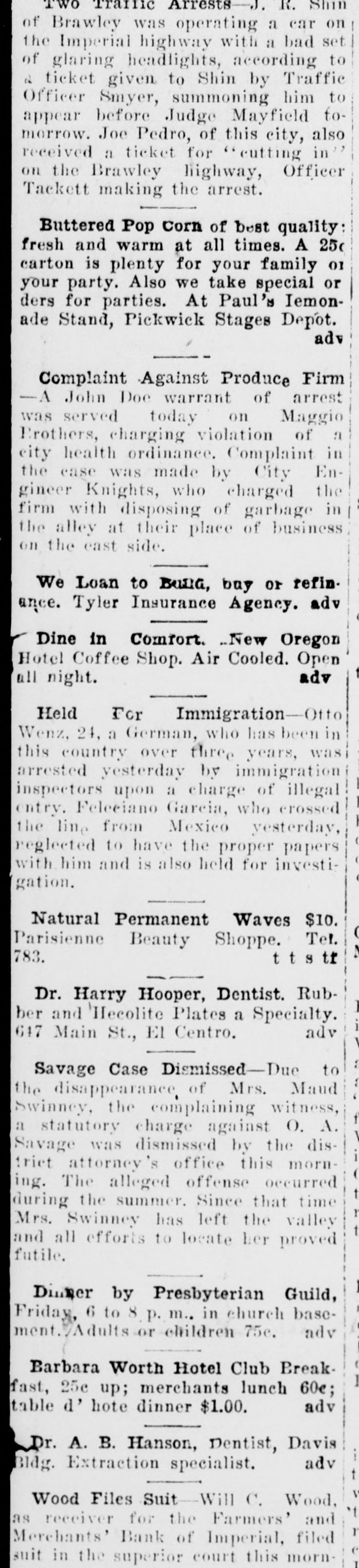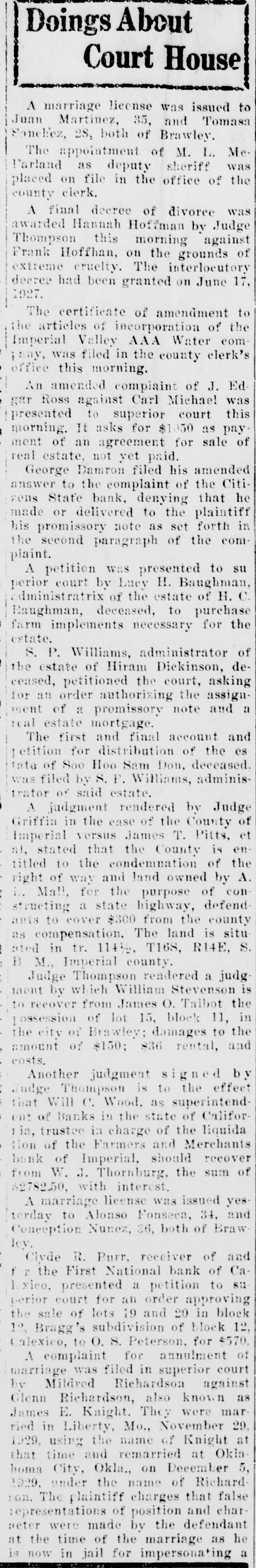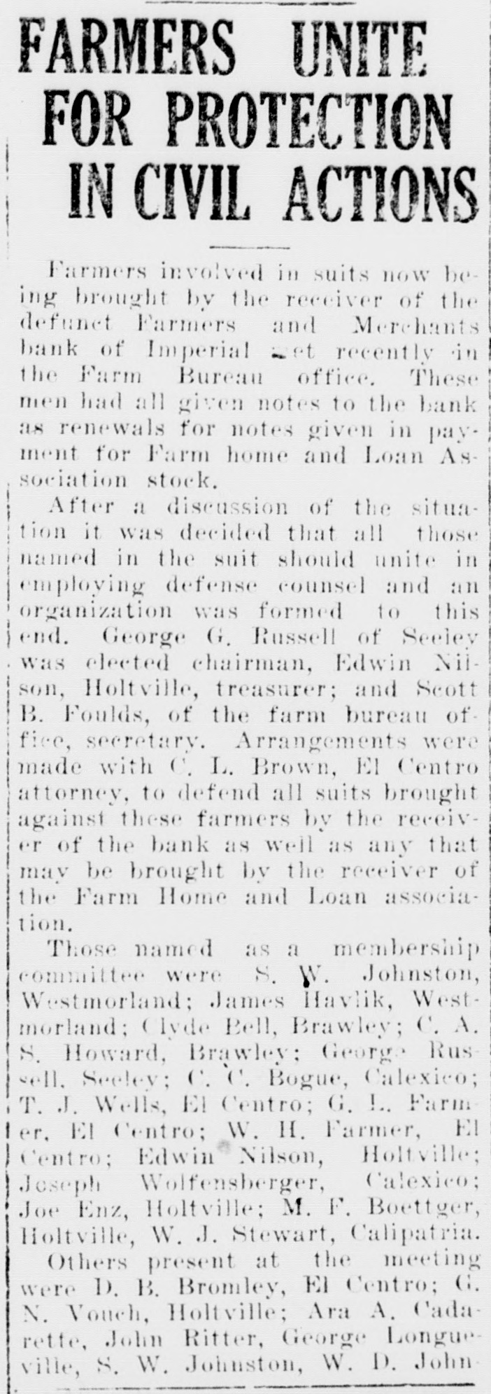 WOOD ISSUES STATEMENT ON CLOSING OF IMPERIAL BANK of repairing it. and in view of Following is a statement rethe frozen condition of the bank ceived by the Press this mornthat has continued over a period ing from Will C. Wood, state of years without appreciable imsuperintendent of banks, relaprovement, T was obliged under tive to his action in closing the the law to take over the bank Farmers and Merchants bank at and proceed toward liquidation Imperial last Monday: of the assets. "The Farmers and Merch"We shall liquidate as rapants Bank of Imperial was idly as possible and shall pav closed by me on October 10, the depositors and other cred1927, in accordance with the itors dividends from time to Bank Act which requires the time, the amount being dependsuperintendent of banks to take ent upon how much we can realpossession of the property and ize out of the assets. Until the business of any bank whenever receiver has had opportunity to he is satisfied that the capital make a careful analysis of the of any such bank is impaired or assets, it wi llbe impossible for that it is unsafe and inexpedient us to estimate what percentage to permit it to continue busiof the total deposits can be ness. paid." "The Farmers and Merchants Signed, WILL C. WOOD, Bank at Imperial was last ex"Supt. of Banks." amined by us on September 3, Inquiry conducted by the 1927. Before that date howPress among several Imperial businessmen shows that there ever, we had determined from is considerable dissatisfaction reports and conferences that the capital of the bank was impairamong them because the bank ed. Accordingly, on August 31, was permitted to open for a 1927 I levied an assessment of short period last Monday $50,000 on the stockholders of just sufficiently long to get deposits from merchants who the bank to repair the capital. had sums carried over from SatSubsequently one of the chief stockholders of the bank went furday. into voluntary bankruptey, makIn several cases, it is alleged, ing it apparent that the amount the bank's action in accepting necessary to make up the imthese deposits. seriously crippairment could not be raised. pled business by tying up funds In view of the large impairment which were to be used in payof capital and the improbability ing current debts.