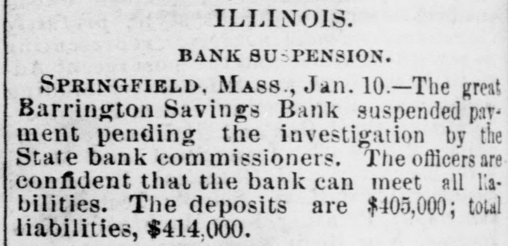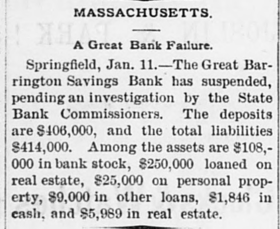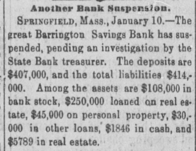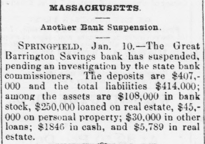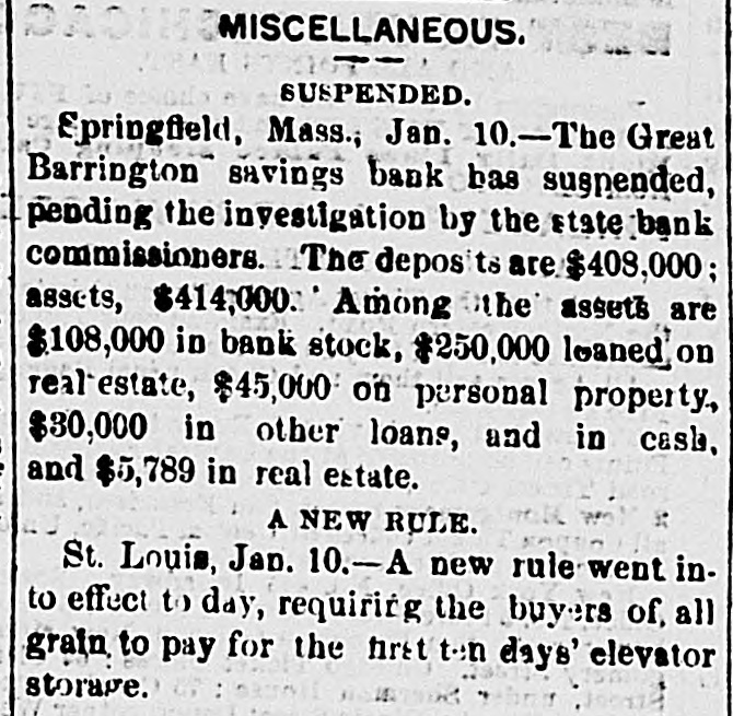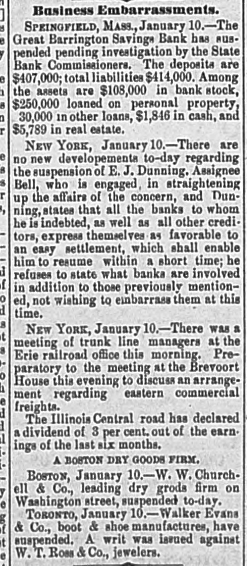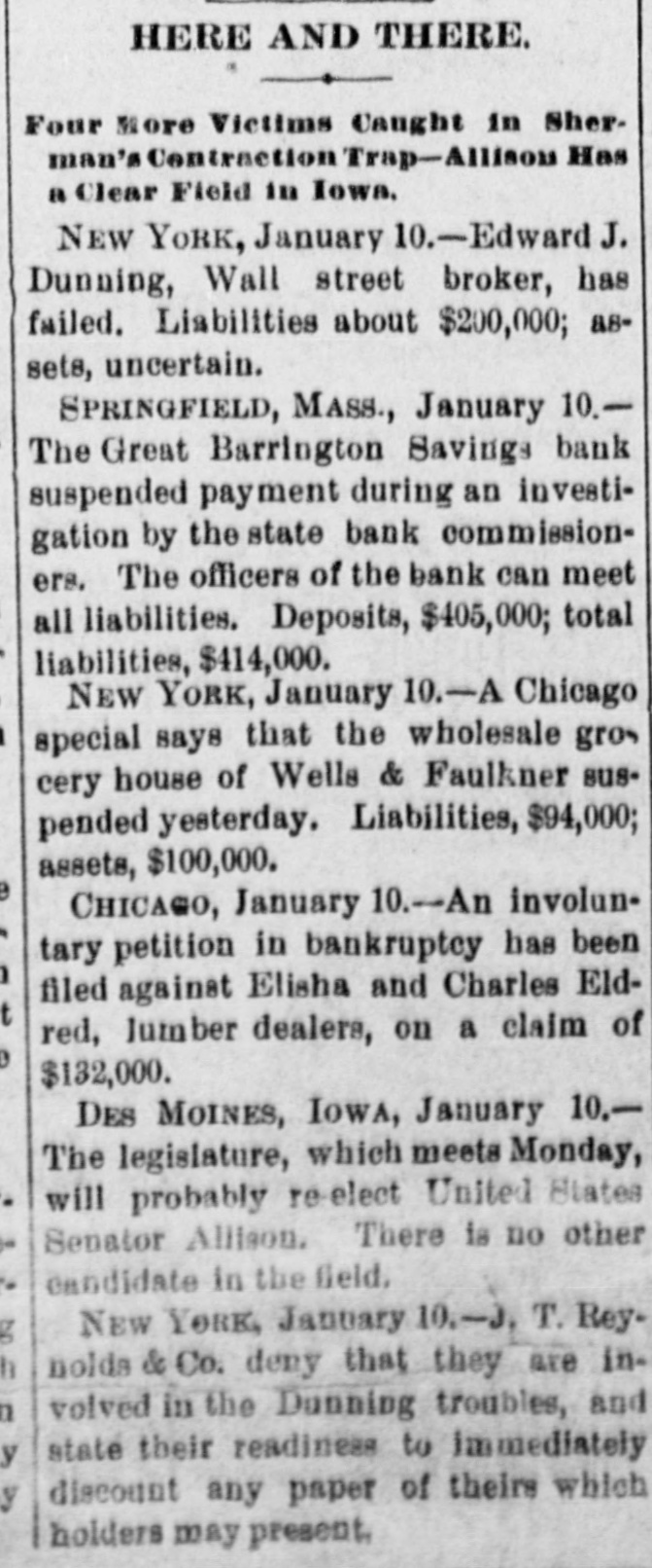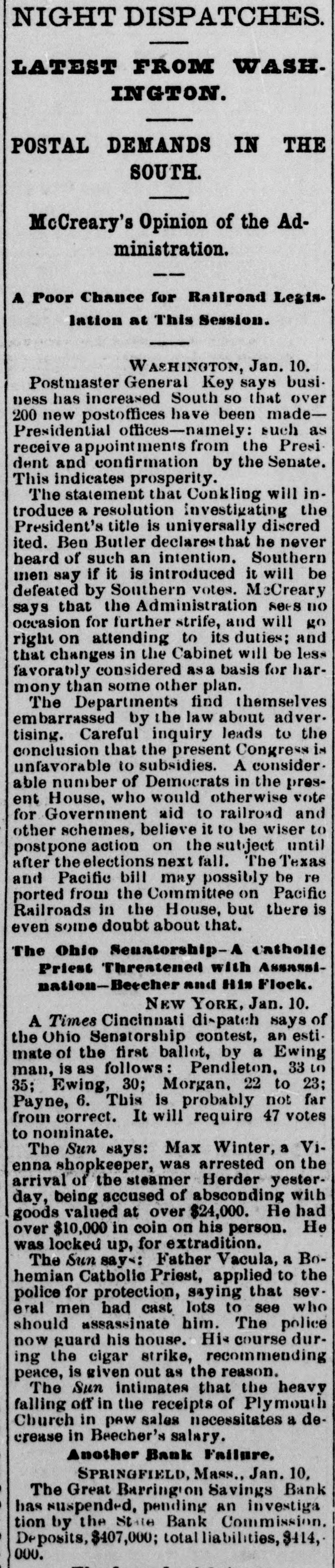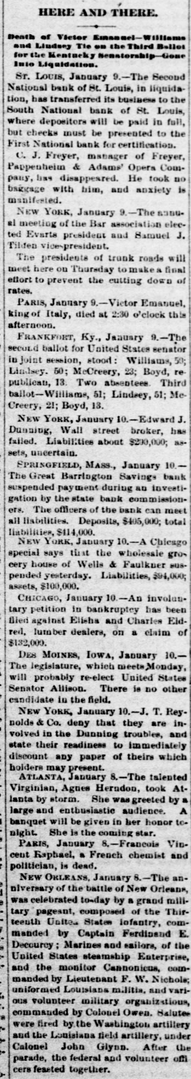 HERE AND THERE. Death of Victor Emanuel- Williams and Lindsey Tie - the Third Bellet for the Kentucky Mensionship Gose Into Liquidation. Sr. LOUIS, January 9.-The Second National bank of St. Louis, in líquidation, has transferred its business to the South National bank of St. Louis, where depositors will be paid in full, but checks must be presented to the First National bank for certification. C. J. Freyer, manager of Freyer, Pappenheim & Adams' Opera Company, has disappeared. He took no baggage with him, and anxiety is manifested. NEW YORK, January 9.-The BOBUal meeting of the Bar association eleeted Evarts president and Samuel J. Tilden vice-president. The presidents of trunk roads will meet here on Thursday omakea final effort to prevent the cutting down of rates. PARIS, January 9.-Victor Emanuel, king of Italy, died at 2:30 o'clock this afternoon. FRANKFORT, Ky., January 9.-The second ballot for United States senator in Joint session, stood: Williams, 50; Lindsey. 50; McCreery, 23; Boyd, republican, 13. Two absentees Third ballot-Williams, 51; Lindsey, 51; MeCreery, 21; Boyd, 13. NEW YORK, January 10.-Edward J. Dunning, Wall street broker, has failed. Liabilities about $200,000; assets, uncertain. SPRINGFIELD, MASS., January 10.The Great Barrington Savings bank suspended payment during an investigation by the state bank commissioners. The officers of the bank can meet all liabilities. Deposits, $405,000; total liabilities, $414,000. NEW YORK, January 10.-A Chicago special says that the wholesale grocery house of Wells & Faulkner suspended yesterday. Liabilities, $94,000; assets, $100,000. CHICAGO, January 10.-An involuntary petition in bankruptey has been filed against Ellehs and Charles Eidred, lumber dealers, on a claim of $132,000. DES MOINES, IOWA, January 10.The legislature, which meets,Monday, will probably re-elect United States Senator Allison. There is no other candidate in the field. NEW YORK, January 10.-J. T. Reynolds & Co. deny that they are involved in the Dunning troubles, and state their readiness to immediately discount any paper of theirs which holders may present. ATLANTA, January 8.-The talented Virginian, Agnes Herndon, took Atlanta by storm. She was greeted by a A large and entbusiastic audience. banquet will be given in her honor tonight. She is the coming star. PARIS, January 8.-Francois Vincent Raphael, a French chewist and : politician, is dead. NEW ORLEANS, January 8.-The anI niversary of the battle of New Orleans, e was celebrated to-day by a grand milltary pagesnt, composed of the Thirteenth Unite. States infantry, comy manded by Captain Ferdipand E. 8 Decourcy: Marines and sailors, of the United States steamship Enterprise, and the monitor Cannonicus, com: manded by Lieutenant F. W. Nichols; uniformed Louisiana militia. and vari4, ous volunteer military organizations, a commanded by Colonel Owen. Salutes were fired by the Washington artillery and the Louisiana field artillery, under Calonel John Glynn. After the parade, the federal and volunteer off cere feasted together.