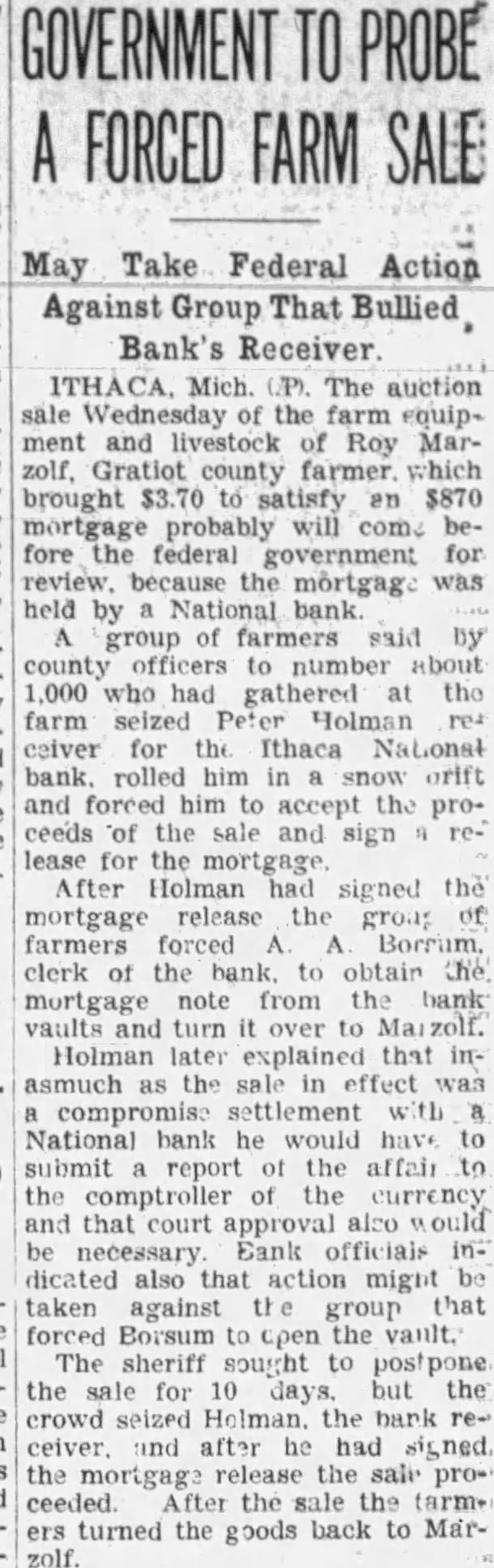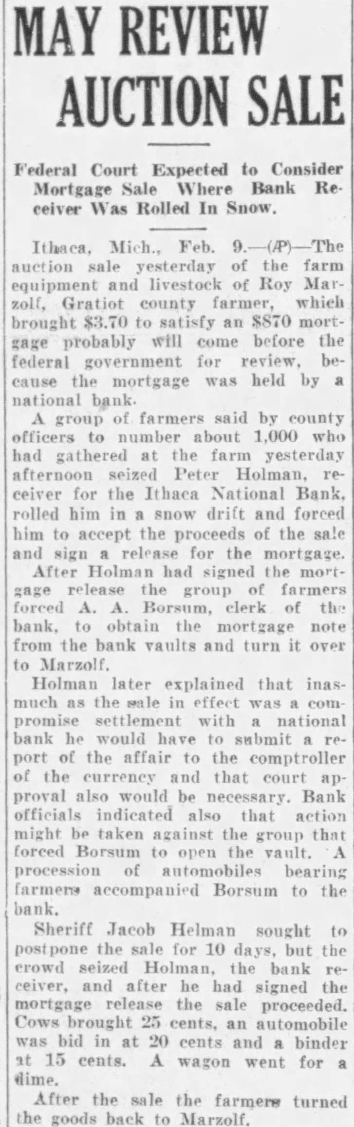 Ithaca, (AP) The auction sale Wednesday of the farm equipment and livestock of Roy Marzelf, Gratiot county farmer, which brought $3.70 to satisfy an $870 mortgage probably will come before the federal government for review, because the mortgage was held by a national bank A. group of farmers said by county officers to number about 1,000 who had gathered at the farm Wednesday afternoon seized Peter Holman, receiver for the Ithaca National bank, rolled him in snow drift and forced him to accept the proceeds of the sale and sign release for the mortgage. May Cause Federal Action. After Holman had signed the mortgage release the group of farmers forced Borsum, clerk of the bank, to obtain the mortgage note from the bank vaults and turn it over to Marzolf. Holman later explained that inasmuch as the sale in effect was settlement with tional bank he would have submit report of the affair to the comptroller of the currency and that court approval also would necessary. Bank officials indicated also that action might be taken against the group that forced Brosum to open the vault. A procession of automobiles bearing farmers acompanled Borsum to the bank. Refuse Sale Postponement. Sheriff Jacob Helman sought to postpone the sale for 10 days, but the crowd seized Holman, the bank receiver, and after he had signed the mortgage release the sale proceeded. Cows brought 25 cents, an automobile was bid in at 20 cents and a binder at 15 cents. A wagon went for a dime. After the sale the farmers turned the goods back to Marzolf.