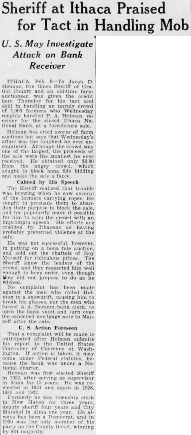 seized Peter Holman, receiver for the Ithaca National bank, rolled him in a snowdrift and forced him to accept the proceeds of the sale and sign release for the mortgage (AP/Washington Times, Feb. 9, 1933).