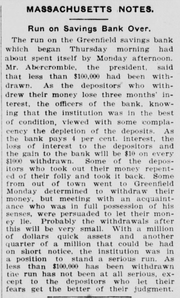 MASSACHUSETTS NOTES. Run on Savings Bank Over. The run on the Greenfield savings bank which began Thursday morning had about spent itself by Monday afternoon. Mr. Abercrombie, the president, said that less than $100,000 had been withdrawn. As the depositors who withdrew their money lose three months' interest, the officers of the bank, knowing that the institution was in the best of condition, viewed with some complacency the depletion of the deposits. As the bank pays 4 per cent. interest, the loss of interest to the depositors and the gain to the bank will be $10 on every $1000 withdrawn. Some of the depositors who took out their money repented of their folly and took it back. Some from out of town went to Greenfield Monday determined to withdraw their money, but meeting with an acquaintance who was in full possession of his senses, were persuaded to let their money lie. Probably the withdrawals after this will be very small. With a million of dollars quick assets and another quarter of a million that could be had on short notice, the institution was in a position to stand a serious run. As less than $100,000 has been withdrawn the run has not been at all serious, except to the depositors who let their fears get the better of their judgment.
