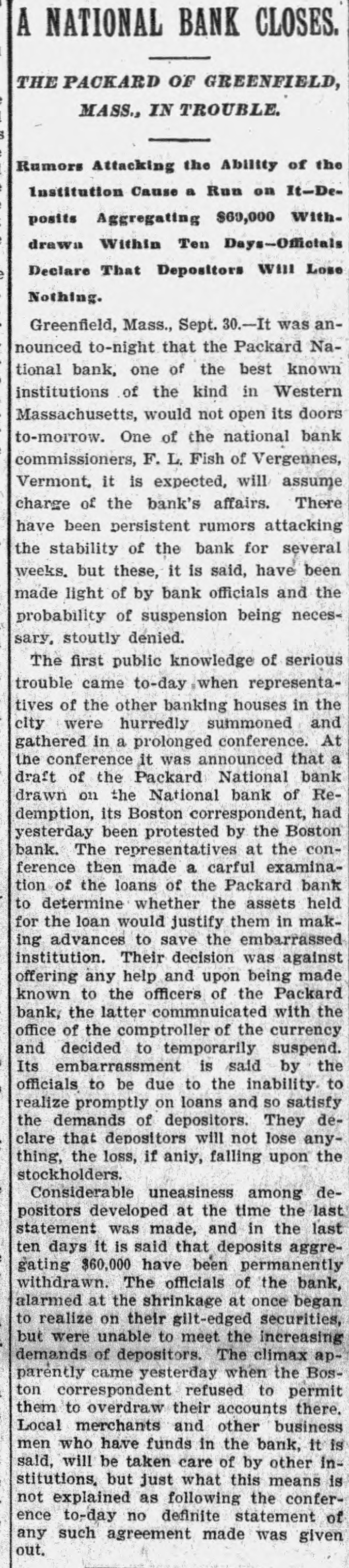 A NATIONAL BANK CLOSES. THE PACKARD OF GREENFIELD, MASS., IN TROUBLE. Rumors Attacking the Ability of the Institution Cause a Run on It-Deposits Aggregating $69,000 Withdrawn Within Ten Days-Officials Declare That Depositors WIII Lose Nothing. Greenfield, Mass., Sept. 30.-It was announced to-night that the Packard National bank, one of the best known institutions of the kind in Western Massachusetts, would not open its doors to-morrow. One of the national bank commissioners, F. L. Fish of Vergennes, Vermont, it is expected, will assume charge of the bank's affairs. There have been persistent rumors attacking the stability of the bank for several weeks. but these, it is said, have been made light of by bank officials and the probability of suspension being necessary, stoutly denied. The first public knowledge of serious trouble came to-day when representatives of the other banking houses in the city were hurredly summoned and gathered in a prolonged conference. At the conference it was announced that a draft of the Packard National bank drawn on the National bank of Redemption, its Boston correspondent, had yesterday been protested by the Boston bank. The representatives at the conference then made a carful examination of the loans of the Packard bank to determine whether the assets held for the loan would justify them in making advances to save the embarrassed institution. Their decision was against offering any help and upon being made known to the officers of the Packard bank, the latter commnuicated with the office of the comptroller of the currency and decided to temporarily suspend. Its embarrassment is said by the officials to be due to the inability. to realize promptly on loans and so satisfy the demands of depositors. They declare that depositors will not lose anything, the loss, if aniy, falling upon the stockholders. Considerable uneasiness among depositors developed at the time the last statement was made, and in the last ten days it is said that deposits aggregating $60,000 have been permanently withdrawn. The officials of the bank, alarmed at the shrinkage at once began to realize on their gilt-edged securities, but were unable to meet the increasing demands of depositors. The climax apparently came yesterday when the Boston correspondent refused to permit them to overdraw their accounts there. Local merchants and other business men who have funds in the bank, it is said, will be taken care of by other institutions, but just what this means is not explained as following the conference to-day no definite statement of any such agreement made was given out.