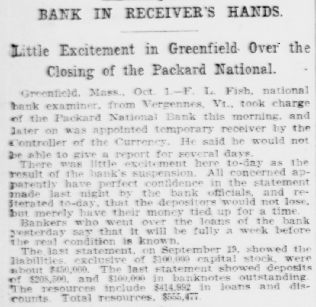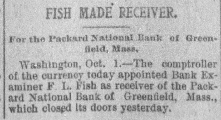 BANK EXAMINER FISH Appointed Temporary Receiver of Packard Bank at Greenfield, Mass. Greenfield, Mass., Oct. 1.-In response to a telephone message from the officials of the Packard National Bank, the suspension of which was announced, last night, National Bank Examiner F. L. Fish of Vergennes, Vt., arrived here, today. He said: "I came, this morning, in answer to a call by telephone from the bank officials, last evening. The comptroller of the currency at Washington has been notified that the bank is in trouble. I have not yet received authority from him to make an examination." A few withdrawals were made from the savings bank, today, but there was nothing in the nature of a run; and considerable money was deposited there. The officials of the savings bank state that even in case there would be a run, the institution would be able to pay all who wished to withdraw. A telegram was received from the comptroller of the currency at Washington, at noon, appointing Examiner Fish temporary receiver. 01 bebigeb