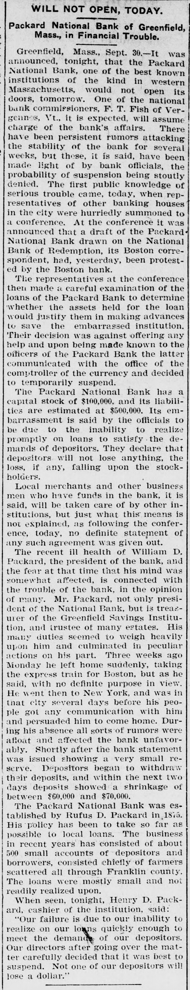 WILL NOT OPEN, TODAY. National Bank of Greenfi Mass., in Financial Trouble. enfield, Mass., Sept. 30.-It 1 tonight, that the Pack Bank, one of the best kno of the kind in west achusetts, would not open tomorrow. One of the natio commissioners, F. T. Fish of V Vt., it is expected, will assu of the bank's affairs. Th been persistent rumors attack tability of the bank for seve but these, it is said, have b light of by bank officials, bility of suspension being stou The first public knowledge trouble came, today, when I tatives of other banking hou city were hurriedly summoned ference. At the conference it wordbox that a draft of the Pack Bank drawn on the Natio of Redemption, its Boston con had, yesterday, been prote the Boston bank. representatives at the confere a careful examination of of the Packard Bank to determ the assets held for the 1 justify them in making advan the embarrassed instituti decision was against offering : nd upon being made known to of the Packard Bank the lat unicated with the office of troller of the currency and deci nporarily suspend. Packard National Bank has stock of $100,000, and its liab estimated at $500,000. Its e ssment is said by the officials to the inability to real on loans to satisfy the of depositors. They declare t will not lose anything, if any, falling upon the sto merchants and other busin who have funds in the bank, it will be taken care of by other but just what this means splained, as following the conf today, no definite statement agreement was given out. recent ill health of William the president of the bank, a at that time that his mind v effected is will